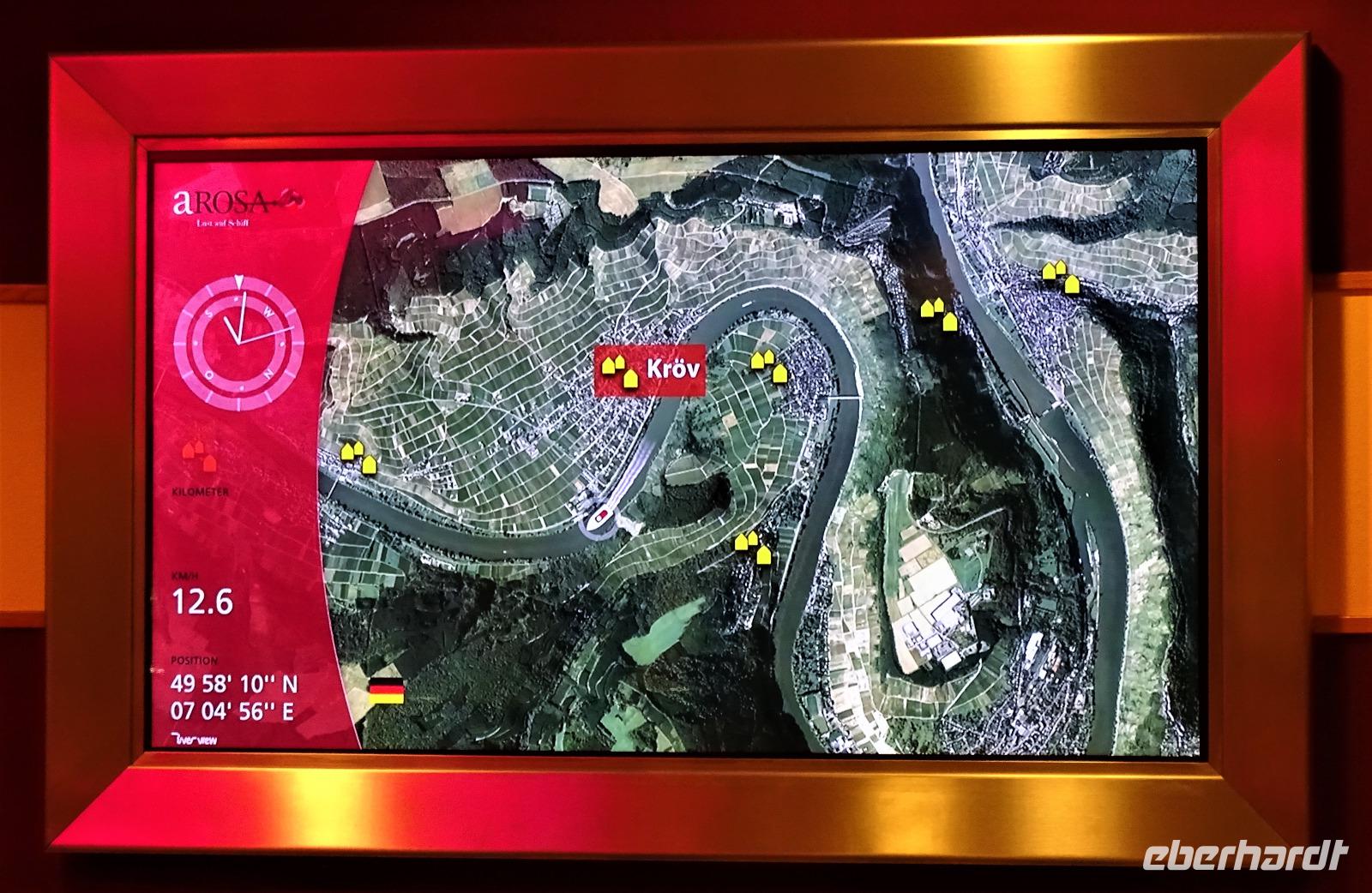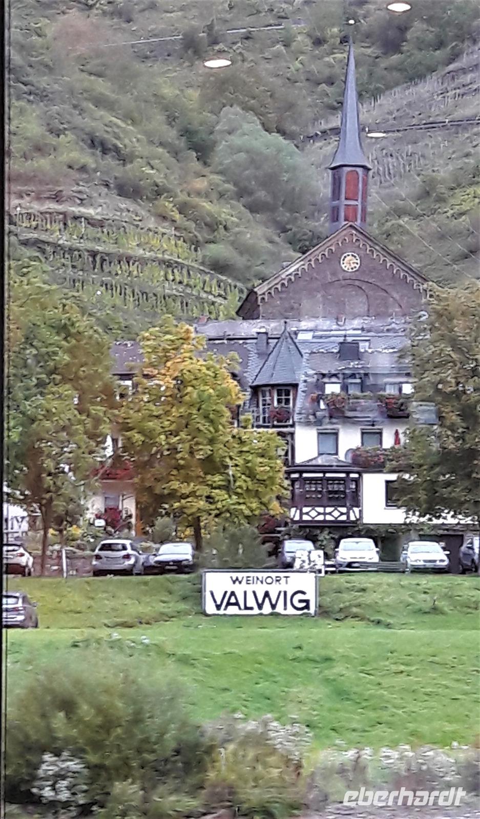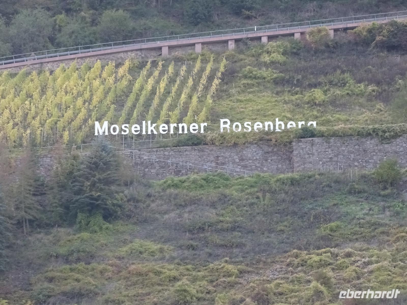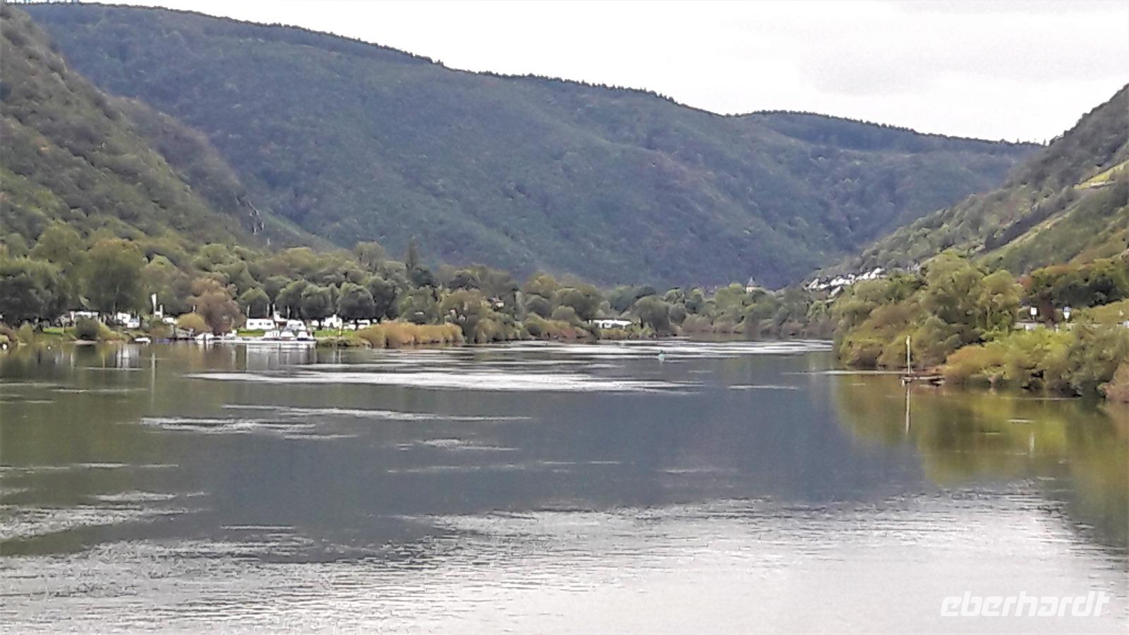 Nun beginnt die Zeit der Schleusungen. Immerhin zehn an der Zahl werden wir bis Mehring und zurück erleben. Über den Tag verteilt gab es die verschiedensten Angebote auf dem Schiff. So konnte man sich filmisch über die Rhone-Schiffe der A-Rosaflotte, bekam viele interessante Hinweise zu Aufenthaltsorten Bernkastel- Kues, Trier und Cochem sowie einer Diskus-sionsrunde „Rund ums Glas". Hier konnten die Teilnehmer Wissenswertes über den Ursprung, die Arten, die Verarbeitung von Glas erfahren sowie die Besonderheiten der Bleiglasfenster in sakralen Bauten. Beeindruckend war auch die Passage bei Edinger- Eller, wo sich gegenüber der ehrwürdigen Ruine des Klosters Bremm der Bremmer Calmont erhebt, der steilste Weinberg Europas.
