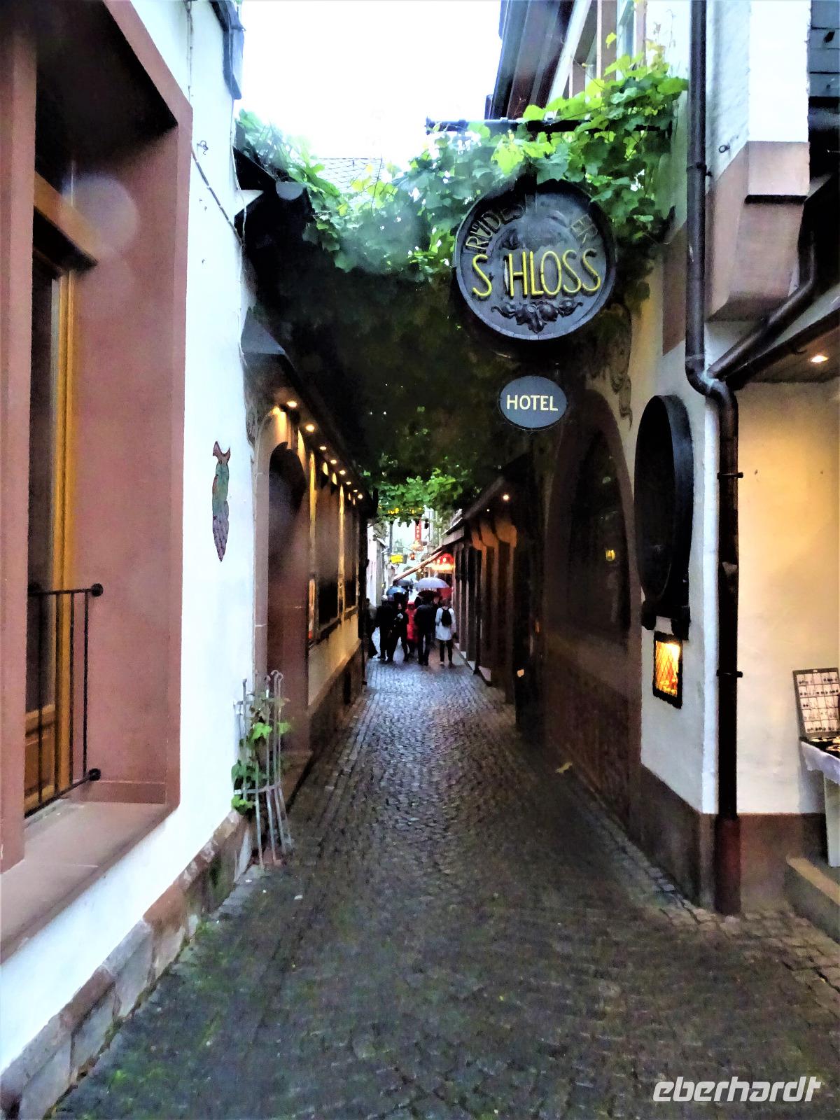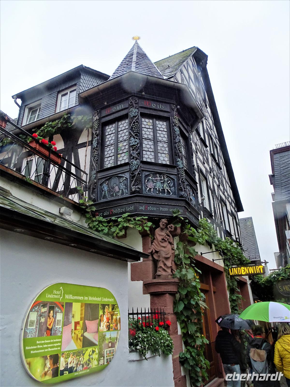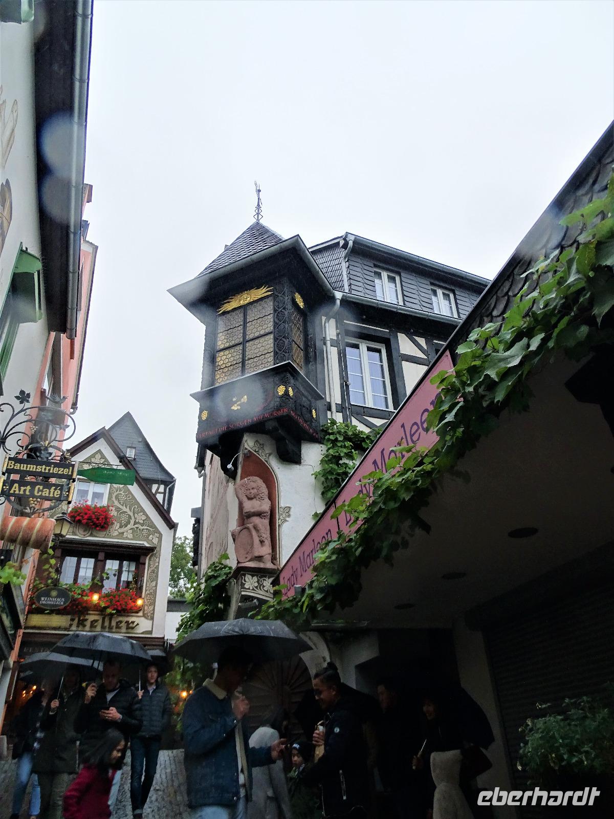 Auch die Rückfahrt in den offenen Gondeln gestaltete sich als eine recht feuchte Angelegenheit und wir haben den Stadtrundgang auf das Wesent-lichste verkürzt. Die Drosselgasse, das Haus mit dem Glockenspiel, dem Hotel, das u.a. zum Nächtigen in Weinfässern einlädt und auch das Geschäft, in dem man den weltbekannten Aspach Uralt präsentiert bekommt.