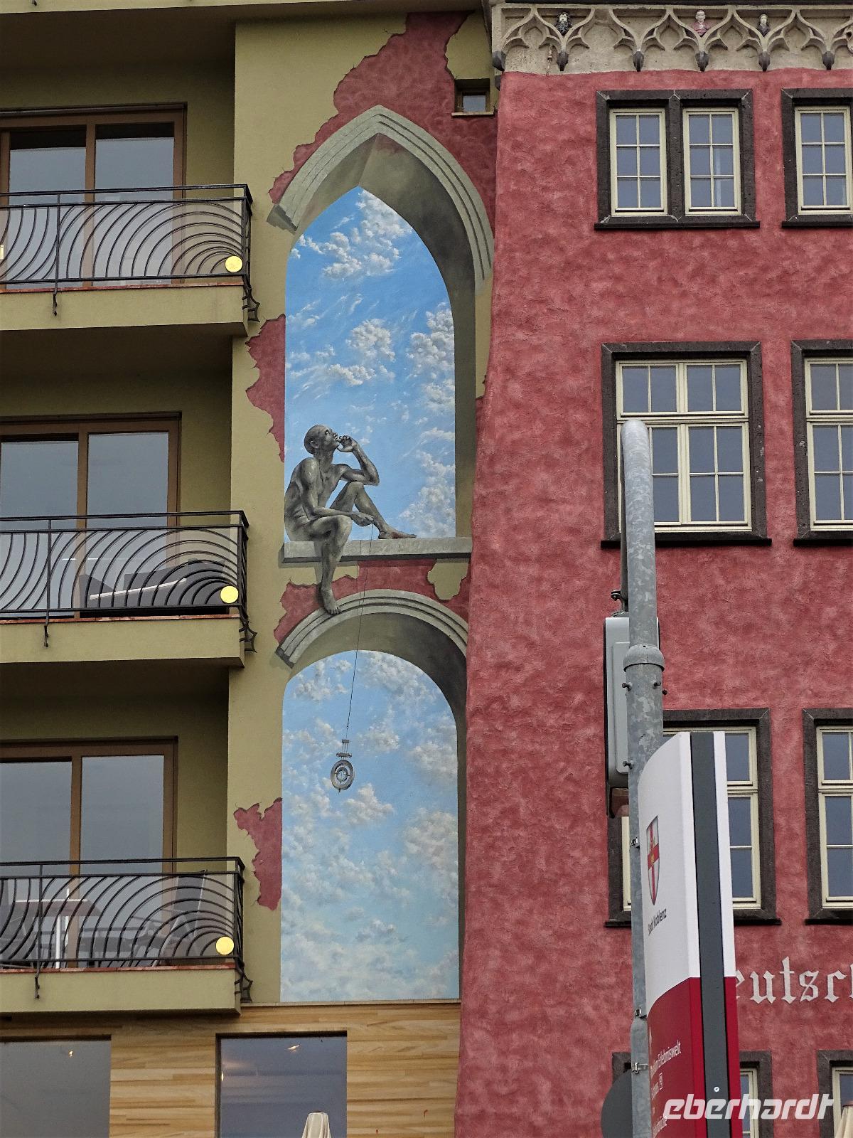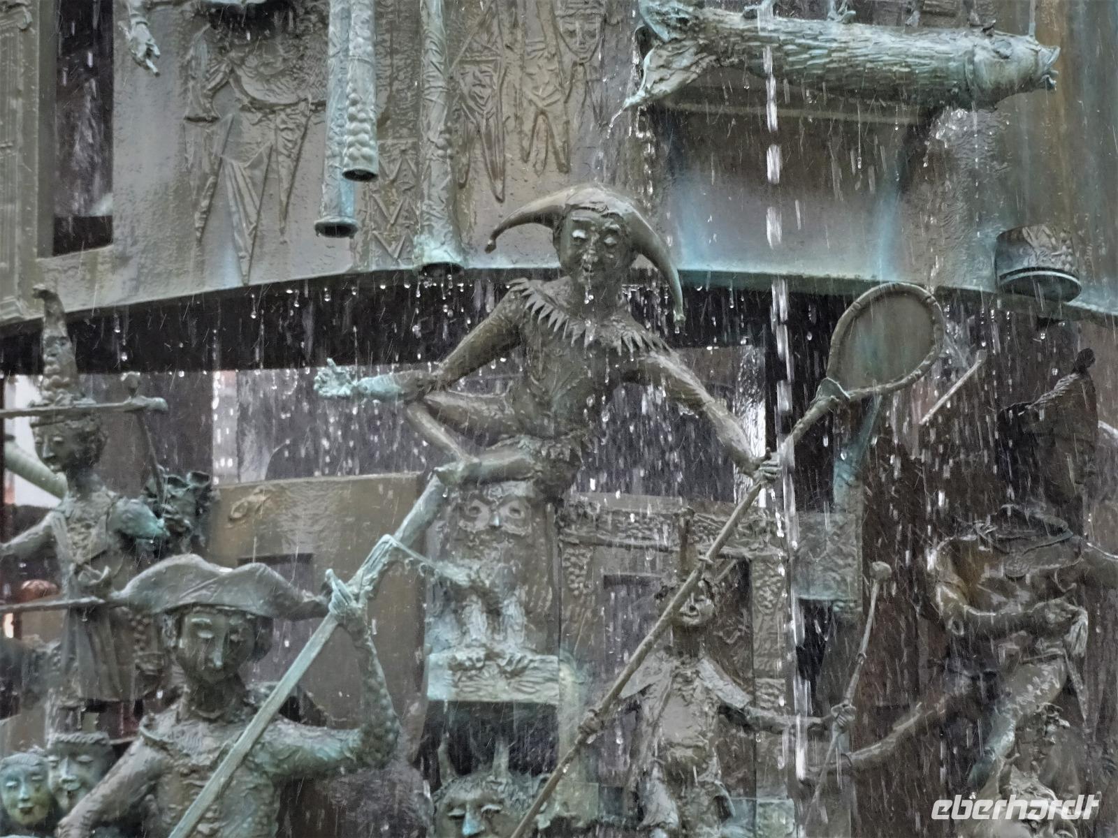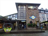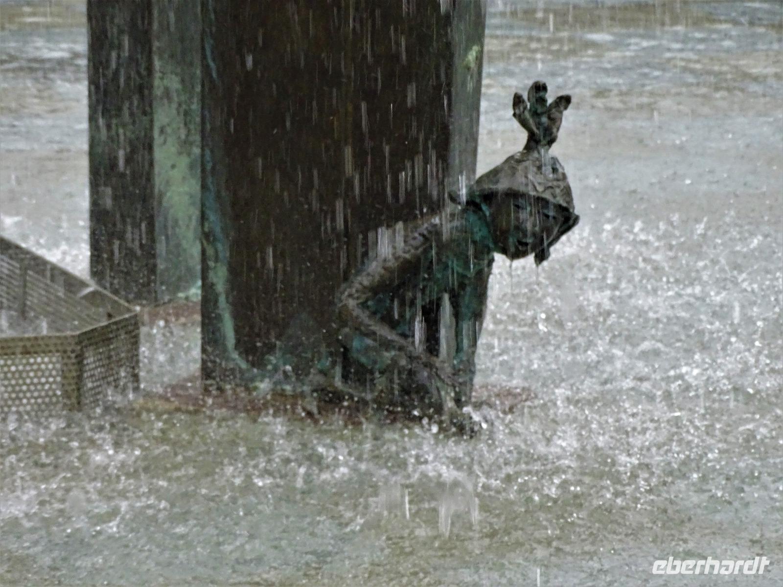 Auch die Rückfahrt in den offenen Gondeln gestaltete sich als eine recht feuchte Angelegenheit und wir haben den Stadtrundgang auf das Wesent-lichste verkürzt. Die Drosselgasse, das Haus mit dem Glockenspiel, dem Hotel, das u.a. zum Nächtigen in Weinfässern einlädt und auch das Geschäft, in dem man den weltbekannten Aspach Uralt präsentiert bekommt.