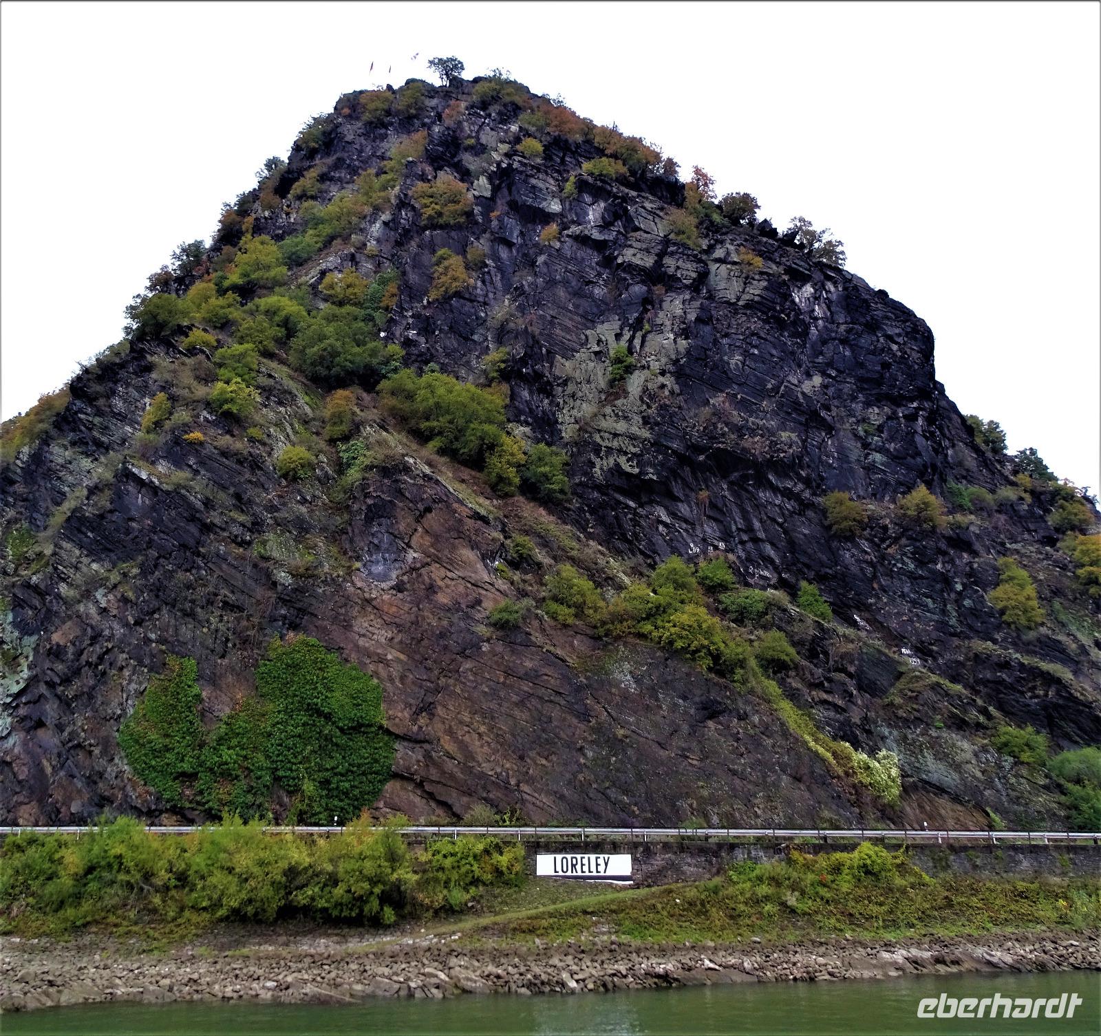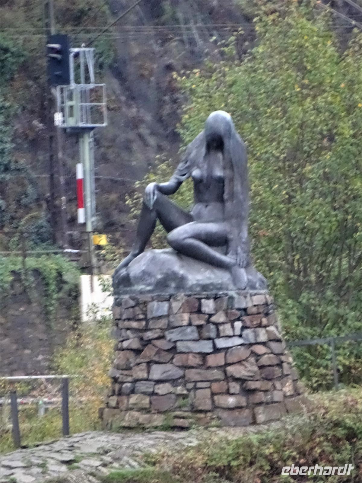 Und dann erhob sich das Felsmotiv Loreley hoch über den Rhein und zu unserem Erstaunen „begrüßte uns die Dame" als Skulptur am Fuße des sagenumwobenen Felsmassivs.