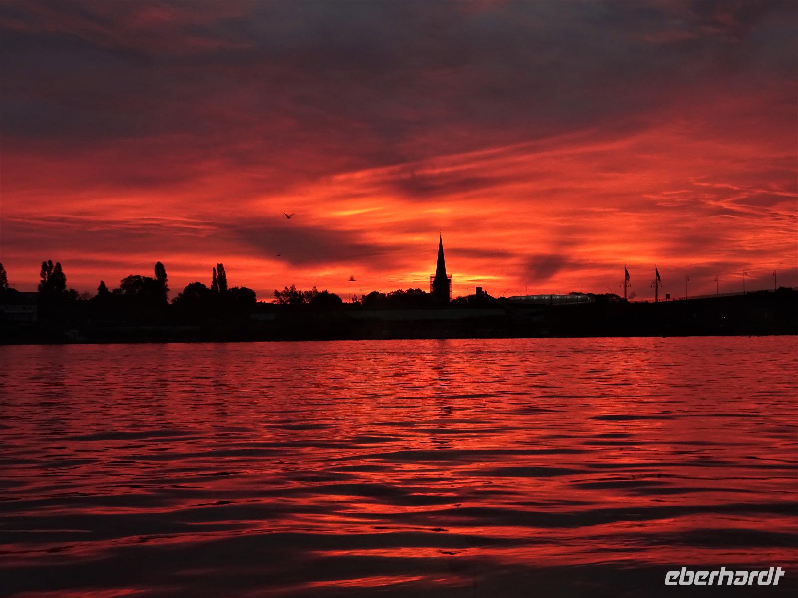 Durch die Fenster verfolgten wir die Uferbebauung links und rechts des Rheines, während unser Schiff immer mehr in die Abenddämmerung fuhr.