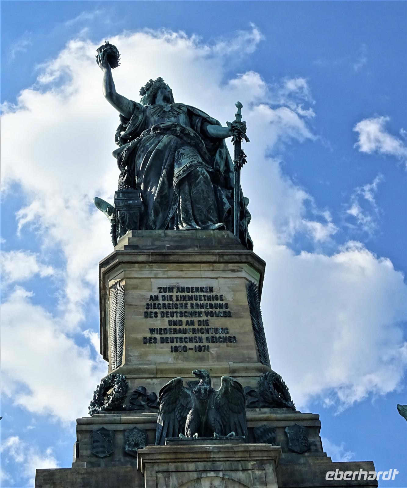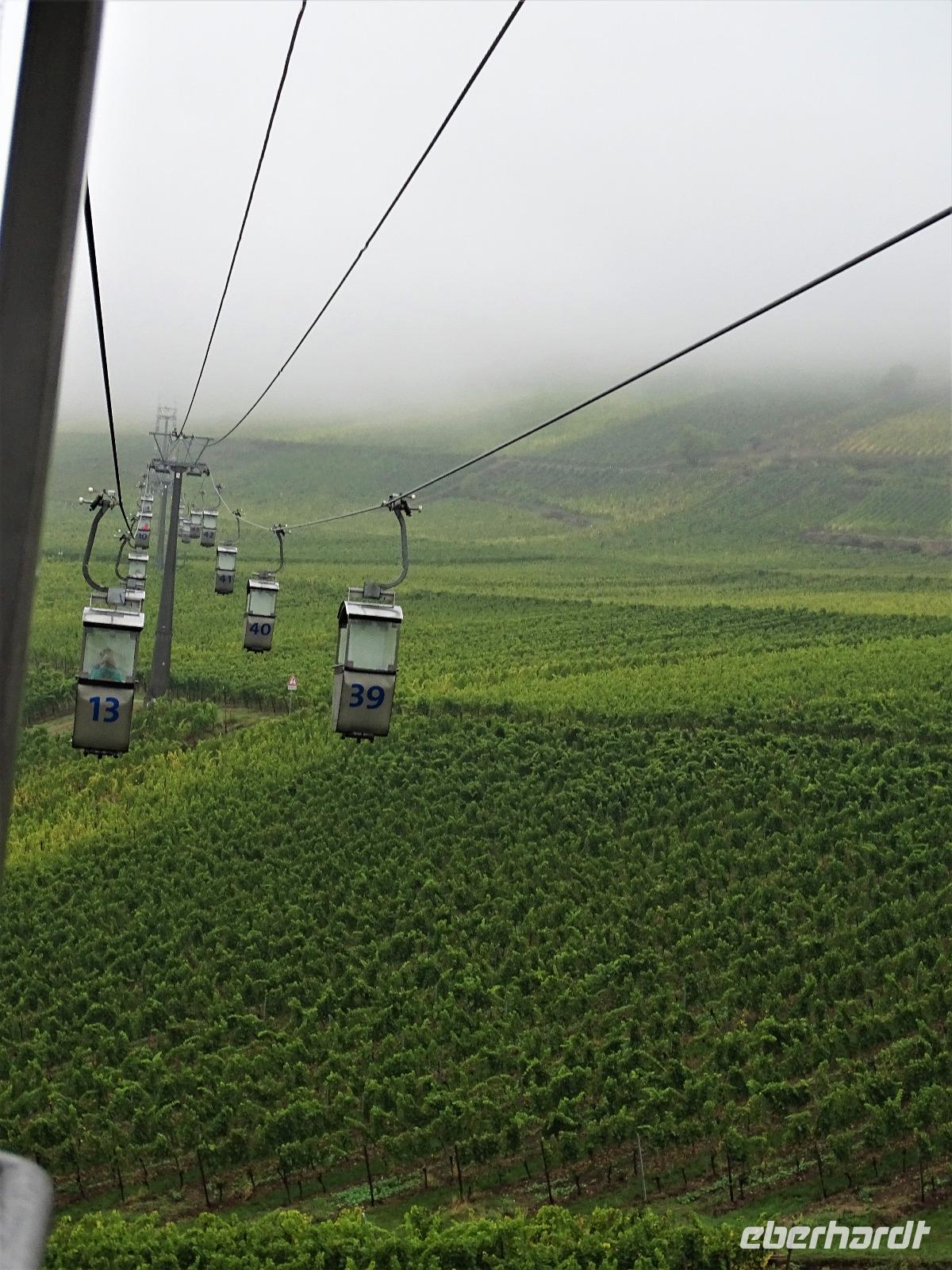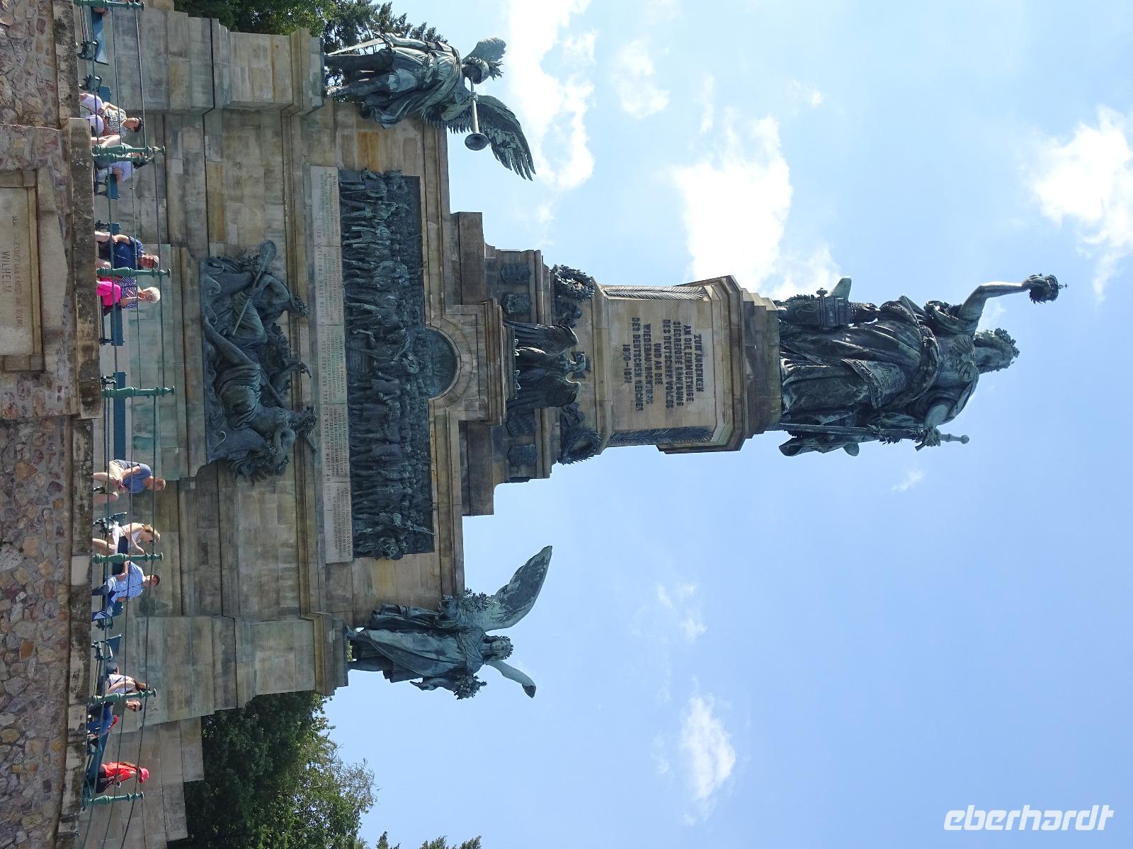 Und das Engelswetter hielt auch am Nachmittag durch. Mit dem Winzerexpress ließen wir uns durch die malerischen Gassen zur Seilbahn schuggern, bekamen lauschten dem kurzen Statement unserer Stadtführerinnen und fuhren dann hinauf zum Niederwalddenkmal mit der alles überragenden Germania, eigentlich besser, in die Wolken.