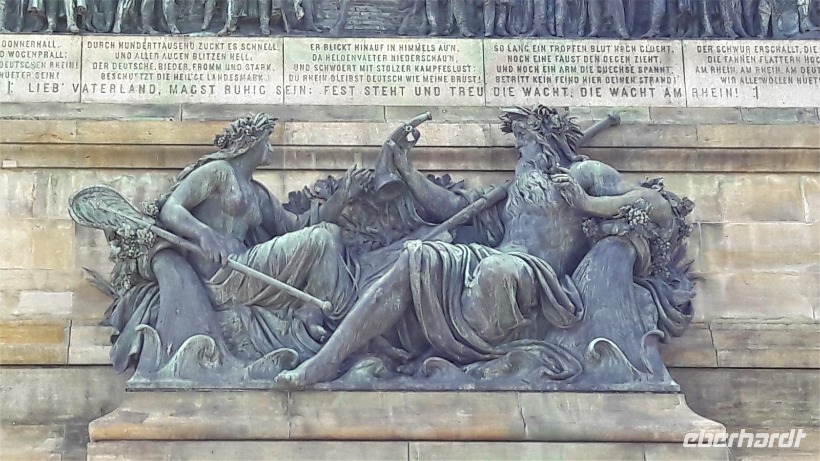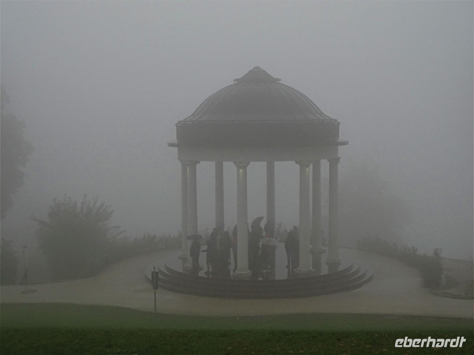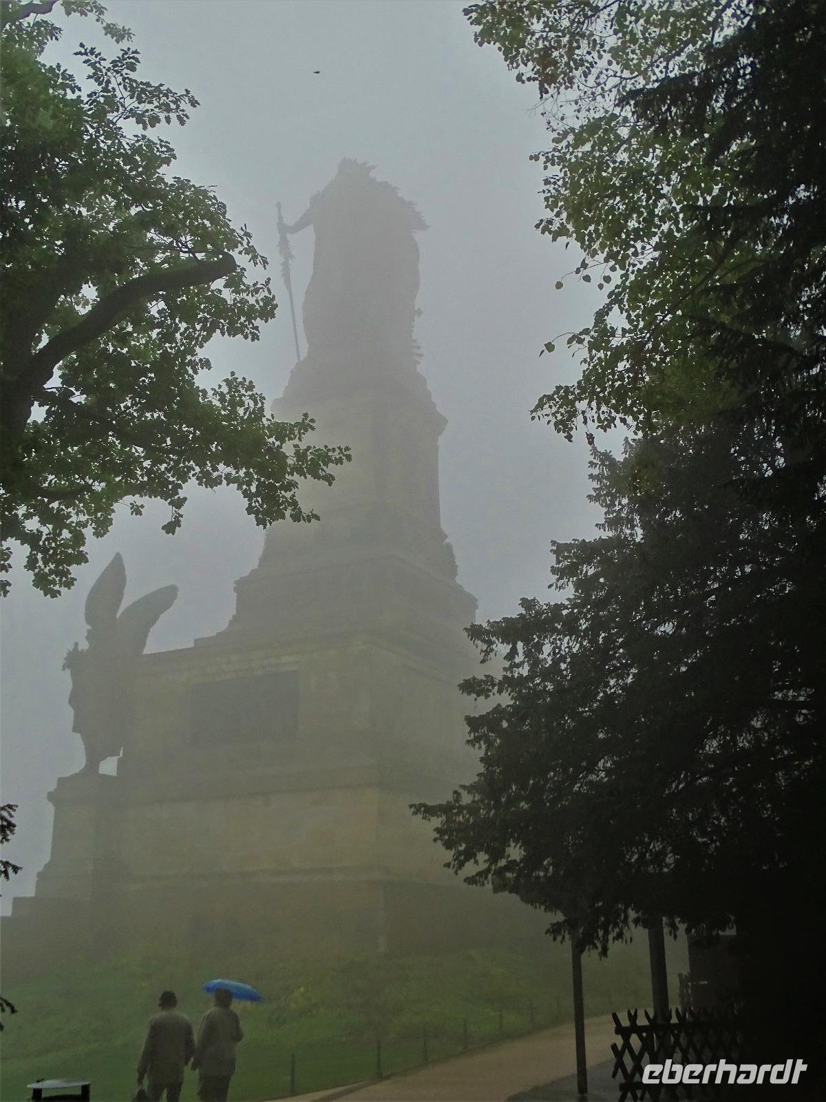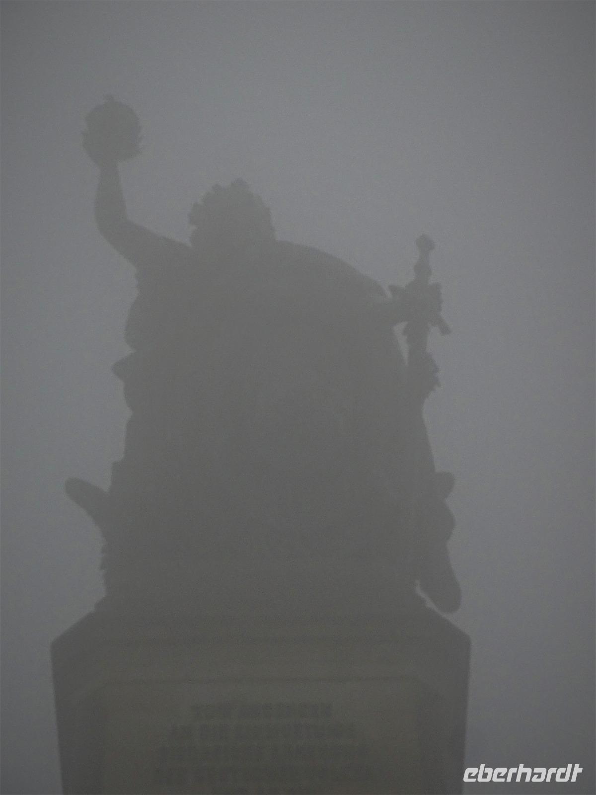Gut, dass die Gruppen geteilt waren, so konnte wenigstens der Letzte den Ersten gerade noch so sehen. Das Denkmal im Nebel, doch umso interes-sierter lauschten wir den Ausführungen unserer Guides, insbesondere horchten wir auf, als Germania als Sächsin geoutet wurde. So blieb für uns leider auch der wunderbare Blick über das Rheintal, Bingen, die Stadt der Hildegard von Bingen, die Rochuskapelle und die Mündung der Nahe im Nebel verborgen.
