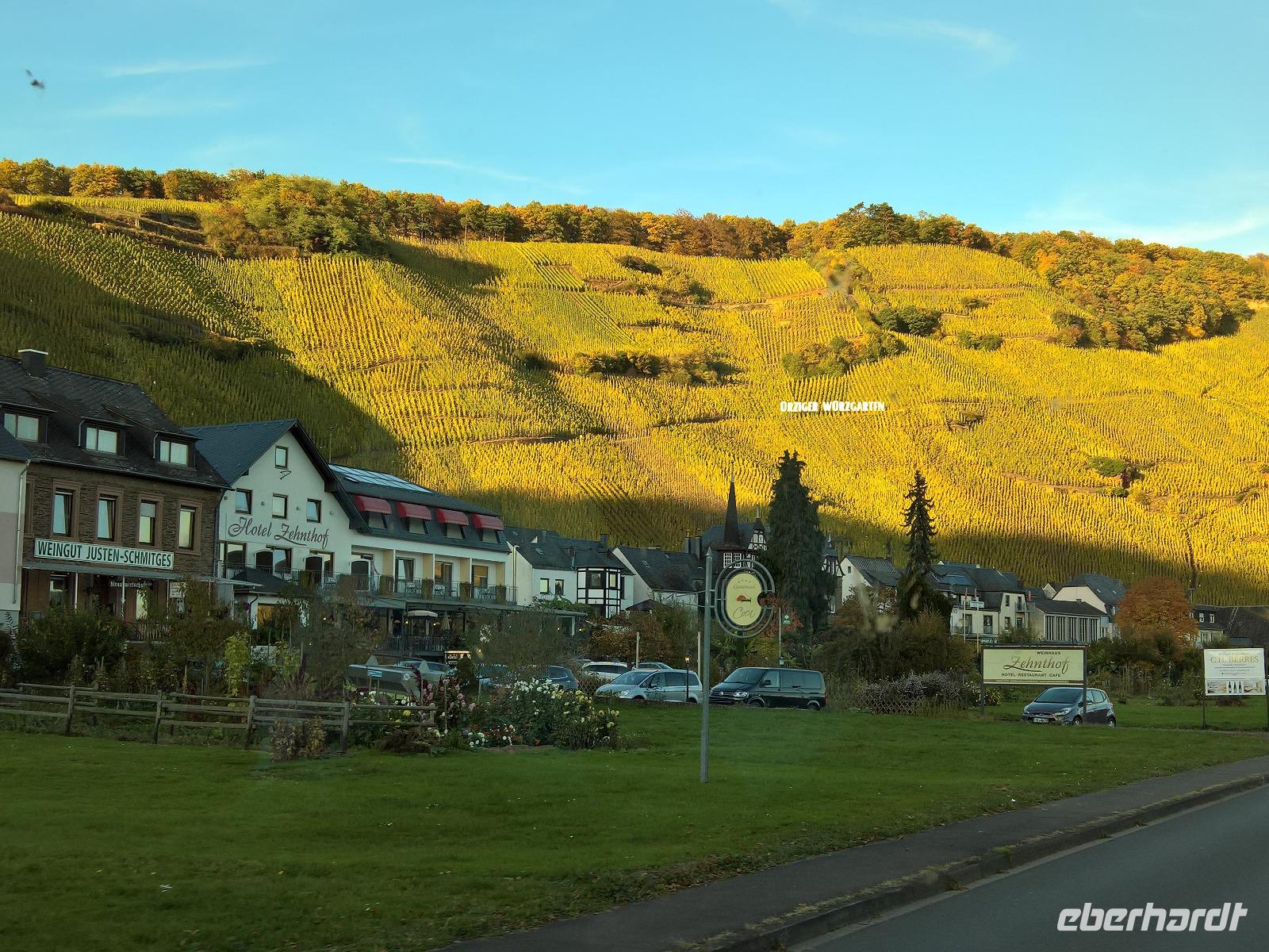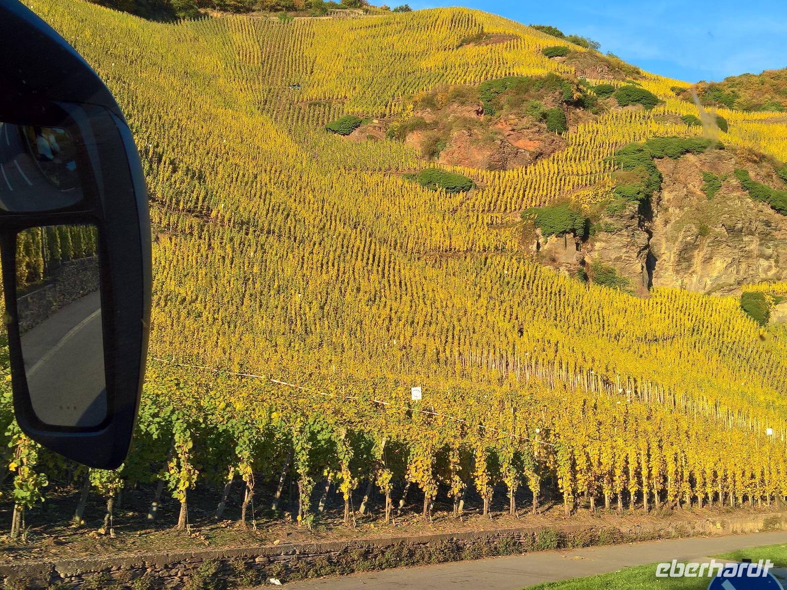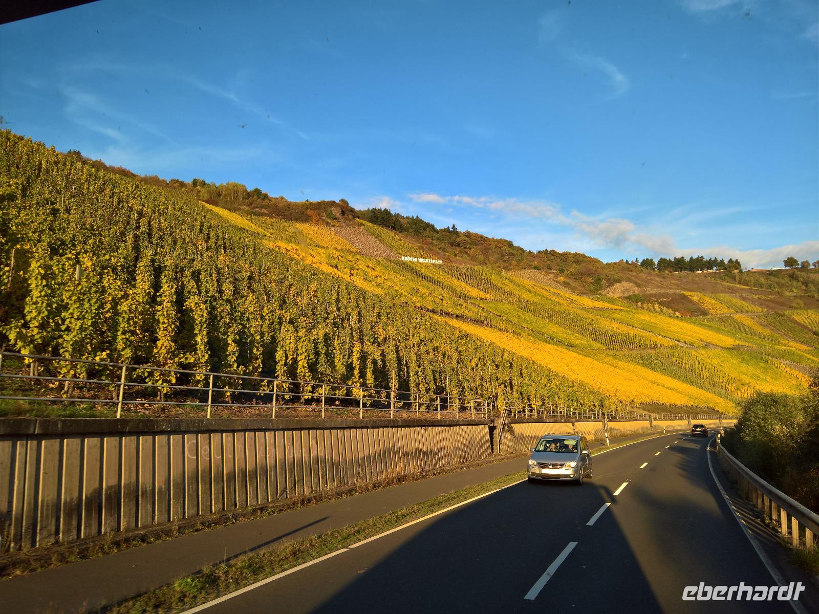 Die Fahrt geht weiter durch das herbstlich wunderschöne Ahrtal, wo der Rotweinwanderweg durch die Weinberge daraufhin deutet, dass wir uns in Deutschlands größtem Rotweinanbaugebiet befinden.