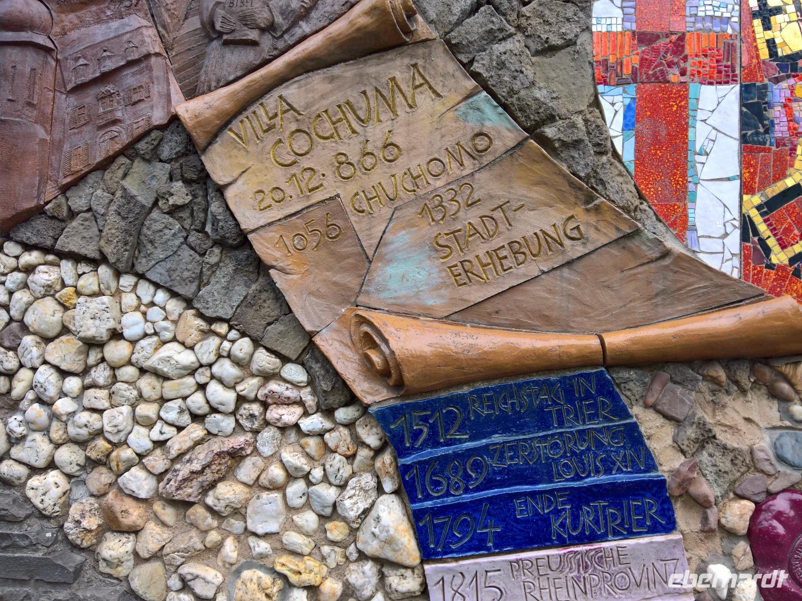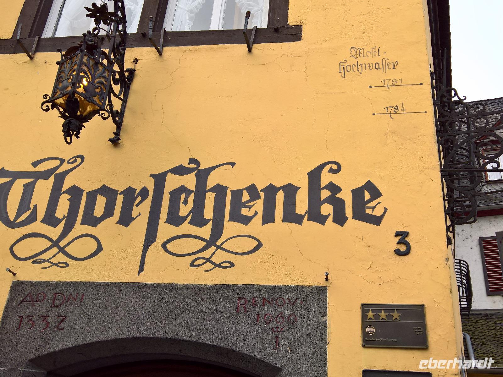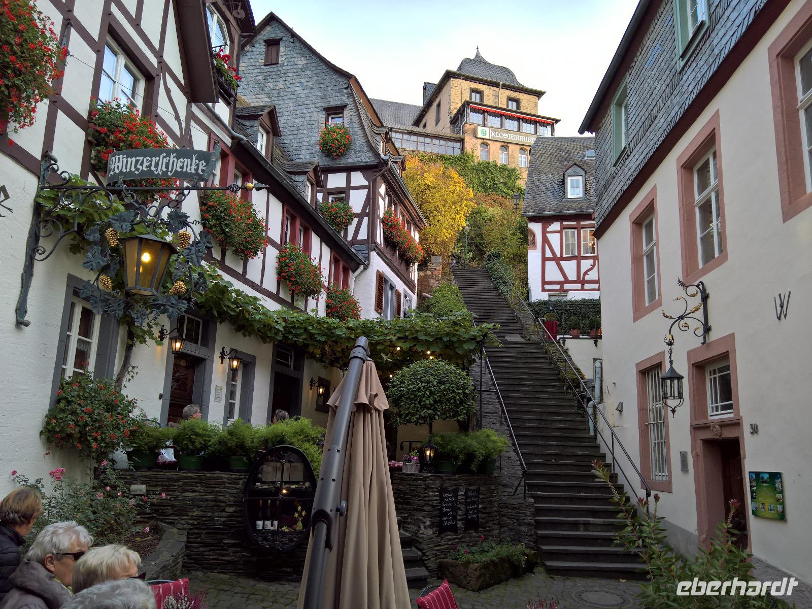 Gleichwohl ist das Städtchen eine Augenweide und die Häuser klettern förmlich den Hang hinauf, gleich den Rebstöcken. Beilstein steht unter Denkmalschutz und ganz oben trohnt auch noch die Burg Metternich als eine viel gemalte Ruine mit bewirtschafteter Burgterrasse und vermutlich einem tollen Panoramablick über die Mosel und die Moselberge. Keiner von unserer Reisegesellschaft wagt heute die Anstrengung des Aufstiegs und so treffen wir uns wieder am Moselufer bei unseren Bussen, die uns ins nicht mehr weit entfernte Cochem zurückfahren.