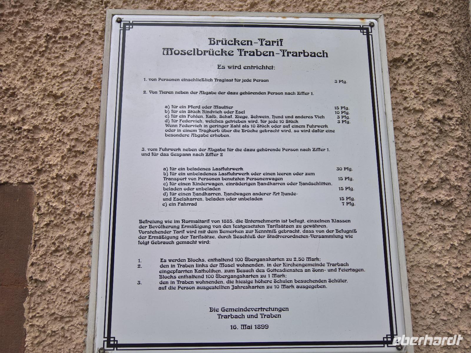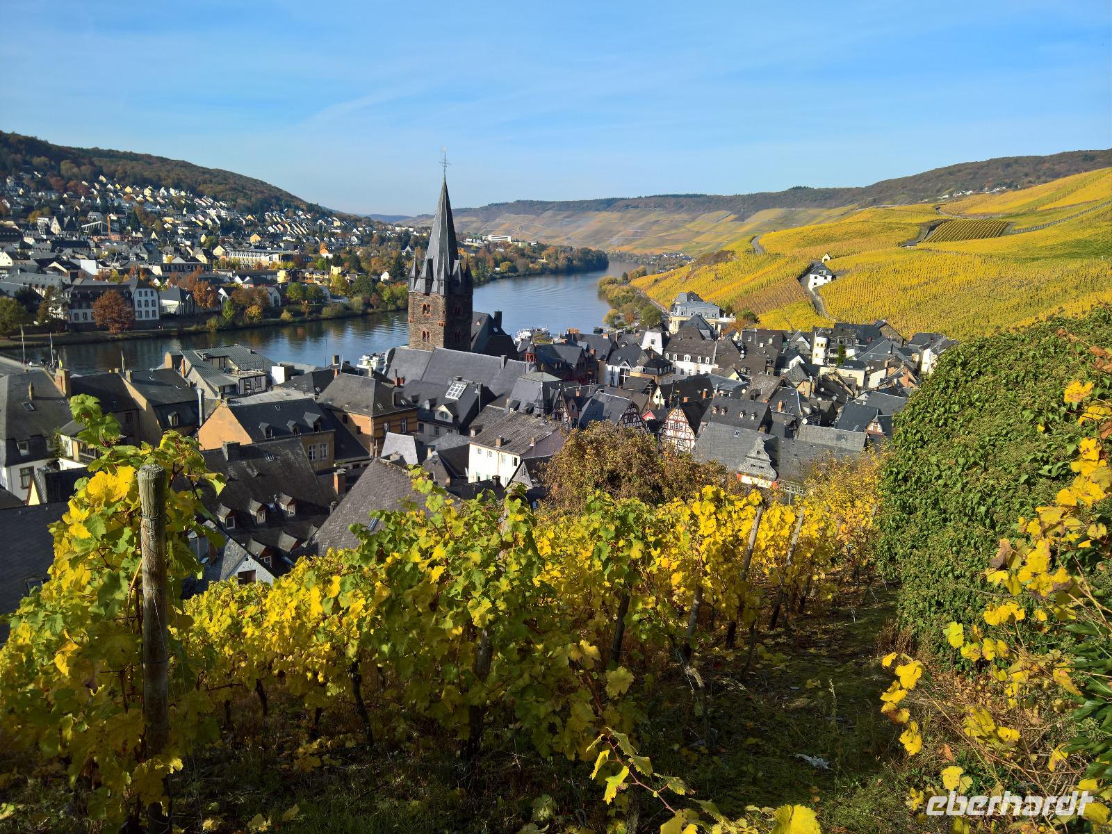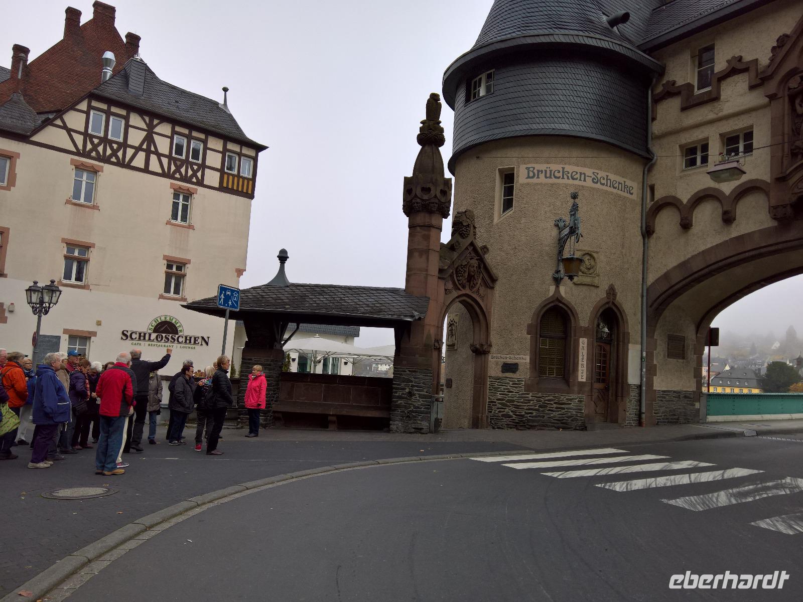 Mit unseren beiden örtlichen Reiseführern machen wir einen Rundgang durch den Weinort Traben-Trabach. der Rundgang endet an dem bekannten Wahrzeichen der Stadt, dem Brückentor. Durch dieses und über die Moselbrücke hinweg gelangt man auf die andere Seite der Mosel nach Traben. Wieder zurückgewandert nach Trabach wartet auf uns bereits ein Ausflugsschiff, mit dem wir auf der Mosel bei herrlichstem Sonnenschein nach Bernkastel-Kues schippern. Der nächste berühmte Moselweinort ist erreicht. Ein kunstvolles Karree rund um den Bernkasteler Marktplatz zeigt uns Fachwerkhäuser wie das rot-weiße Café mit halbrundem Erker, die Straußwirtschaft goldverziert oder das im Jahre 1608 gebaute Rathaus im Renaissance-Stil. Besonders beeindruckt uns das Spitzhäuschen aus dem Jahre1583 mit der extrem schmalen Vorderfront und dem hohen Giebel. Wer den Weg bergauf in Richtung der Burg Landstuhl nicht scheut, kann über den Dächern der Stadt einen grandiosen Ausblick über die Mosel hinweg auf den Zwillingsort Kues genießen oder sich auch nur begeistern an den Farben des herbstlichen Weinlaubes in den Weinbergen.