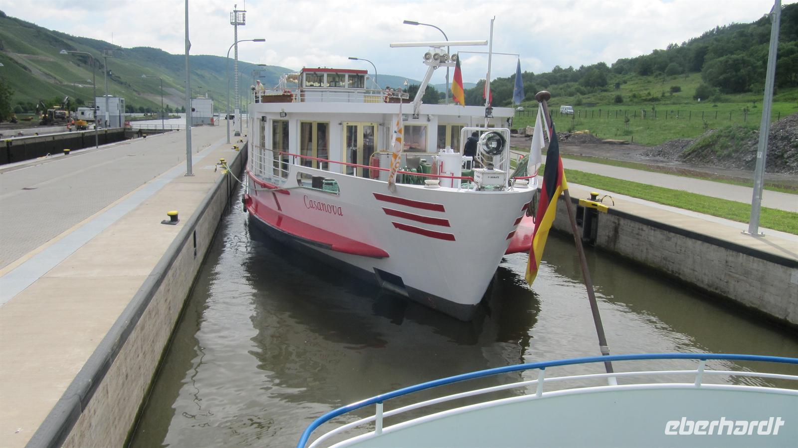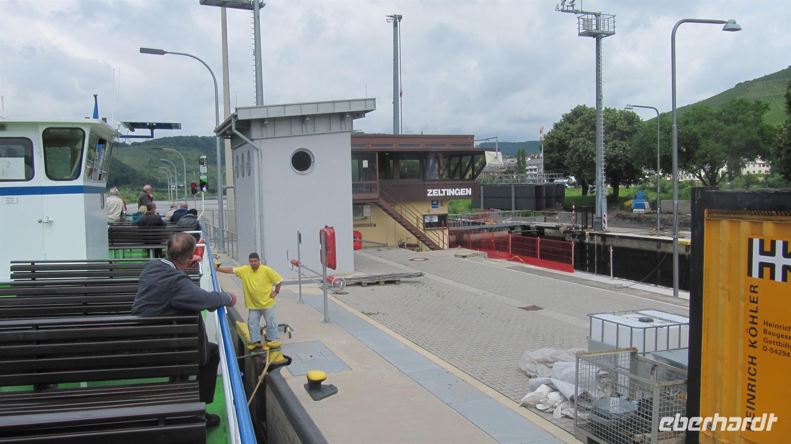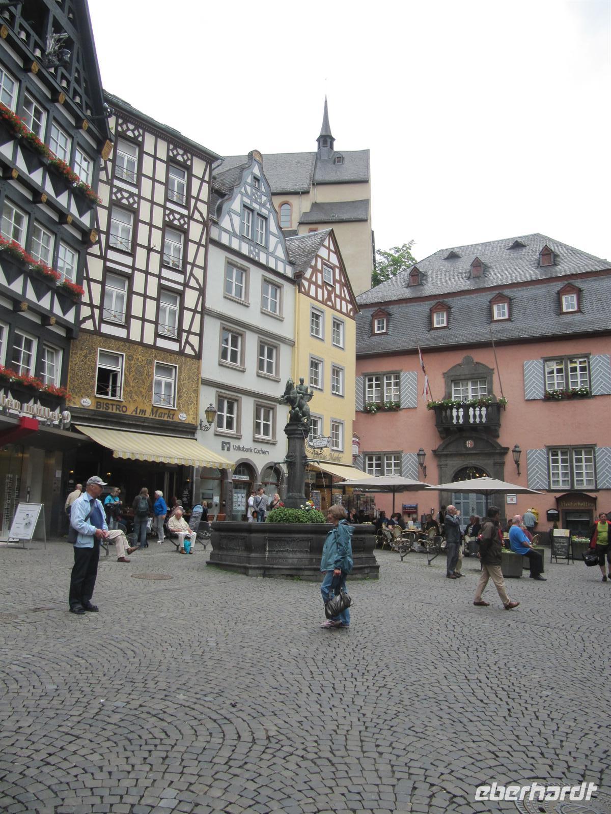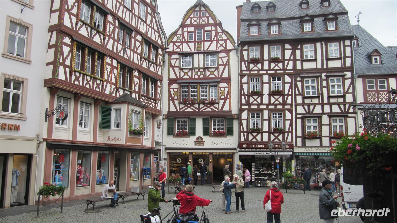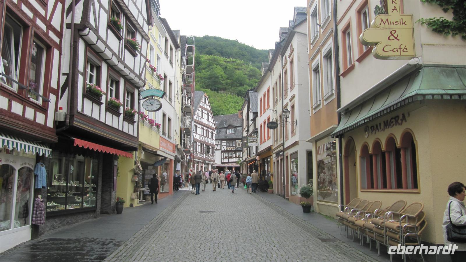 Am nächsten Tag stand die Mosel im Mittelpunkt unserer Reise. Wir fuhren nach Bernkastel-Kues, wo uns Volker Beck Informationen zur Stadt und deren Geschichte gab. Nach etwas Freizeit gingen wir an Bord eines Schiffes, welches uns nach Traben-Trarbach brachte. Entlang des Flussufers begleiteten uns kleine Weindörfer, Burgen, Schlösser, Klöster und bekannte Weinlagen. Bei Zeltingen befuhren wir eine Schleuse, denn die Mosel hat mehrere Staustufen. Dieser Fluß verbreitet ein ganz besonderes Flair. Davon konnten wir uns während der Weiterfahrt mit dem Bus in Richtung Cochem überzeugen. Ein Halt im Weinort Beilstein, der von der Ruine der Burg Metternich überragt wird, war das zu spüren. Weiter fuhren wir in Richtung Cochem. Von weitem begrüßte uns schon die Reichsburg, die hoch über der Stadt liegt. Bei der Stadtführung erläuterte Sandor das Wesentliche zur Stadt und deren historischen Entwicklung. In den Straßen der Stadt sind viele Menschen unterwegs, die sich deren Reiz nicht entziehen können. Geschäfte, Restaurants, Cafe`s und Eisstände sorgen sich für deren Wohl. Die Fahrt zum Hotel führte uns weiter flussabwärts in Richtung Koblenz, wo wir die steilsten Weinberge Europas sehen konnten.