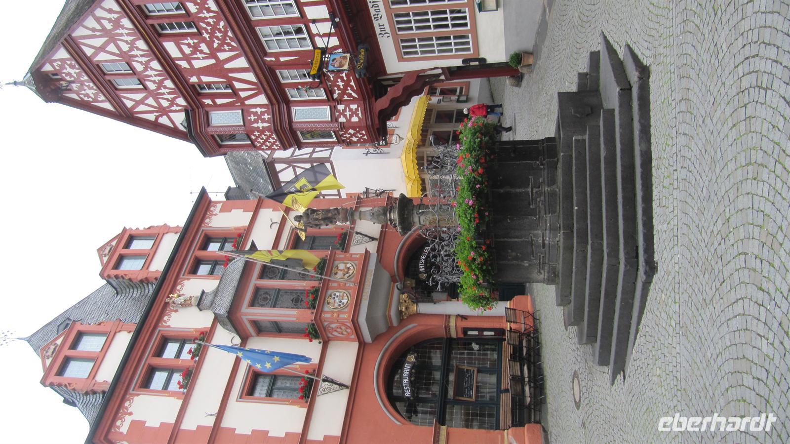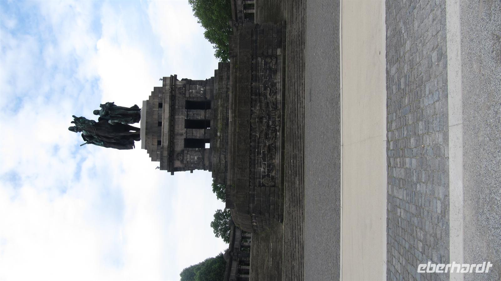 steht das Reiterstandbild des deutschen Kaisers Wilhelm I. Anschließend gingen wir zur Bootsanlegestelle, wo uns schon der Schaufelraddampfer „Goethe“ erwartete, um uns in knapp sechs Stunden Rheinaufwärts nach Assmannshausen zu bringen. Für die Gäste war der Salon reserviert und die gastronomische Betreuung gewährleistet. Wir befuhren den vielleicht schönsten Teil des Rheins, das zum Weltkulturerbe der UNESCO gehörende Mittelrhein-gebiet. An uns zogen u.a. Schloss Stolzenfels, die Marksburg und die Burgen Katz und Maus vorbei. Bekannte Städte und Orte wie Boppard, St. Goar, St. Goarshausen, Oberwesel, Bacharach wurden von uns passiert. Der von allen Gästen erwarteten Höhepunkt der Schiffsfahrt erwartete uns am Flusskilometer 555. Hier, kurz nach St. Goarshausen erhebt sich der Loreleyfelsen und die Loreley-Statue auf der Mole. Weiter ging es vorbei an den 7 Jungfrauen, einer Untiefe, der Rheininsel Pfalz, einer ehemaligen kurpfälzischen Zollburg aus dem 14.Jh., nach Assmannshausen, das von der Ruine Ehrenfels überragt wird. Mit dem Bus fuhren wir hoch zum 1883 zur Erinnerung an den Deutsch/Französischen Krieg 1870/71 errichtete Niederwalddenkmal. In 225 m Höhe über dem Rhein auf den Höhen des Niederwaldes gelegen, steht es mit einer Gesamthöhe von 37,6 m. Die oben darauf stehende „Germania“ hat eine Höhe von 11,8 m. Vom Denkmal hat man einen weiten Blick auf Bingen, die Mündung der Nahe und das umliegende Gebiet. Zum Abschluß des Tages gab es noch einen individuellen Besuch der Drosselgasse in Rüdesheim. Nachdem wir mit der Fähre nach Bingen übergesetzt hatten, waren wir relativ schnell an unserem Hotel.