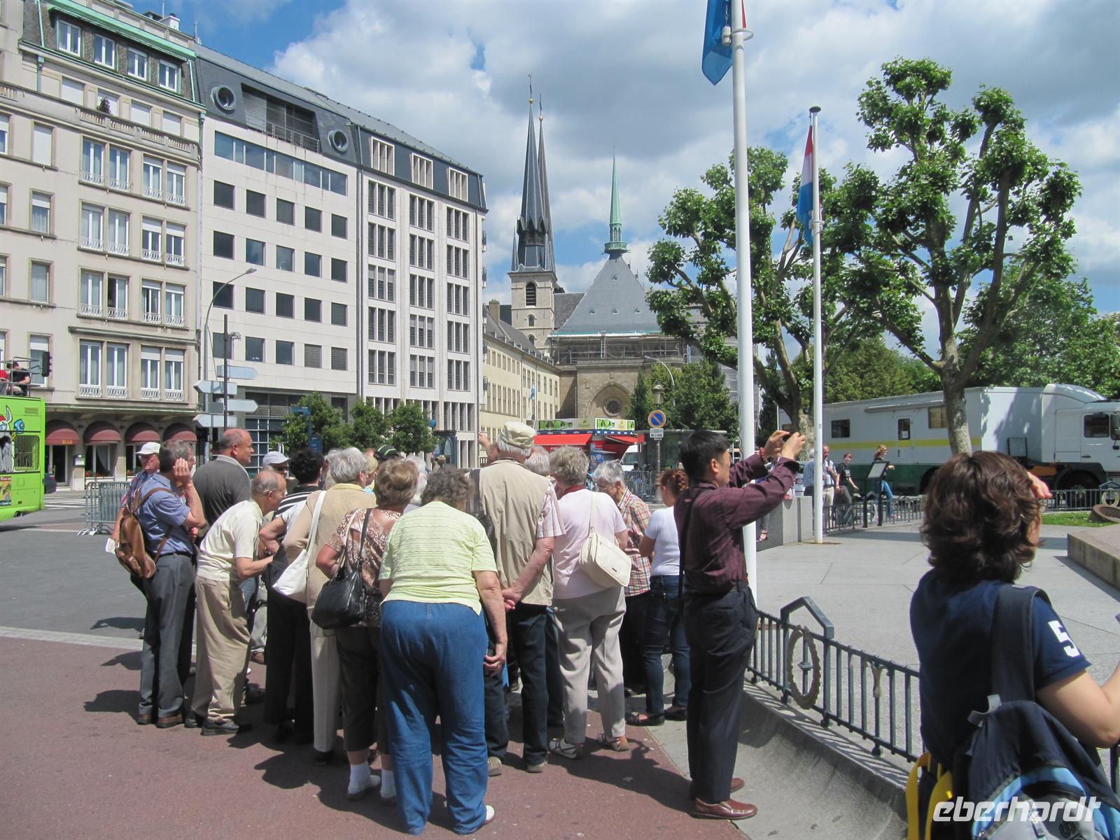 Anschließend besuchten wir die Hauptstadt des gleichnamigen Großherzogtums Luxemburg. Bei der Fahrt in die Stadt, vorbei am Flughafen, sahen wir den neuen Teil von Luxemburg. Hier entstand in den letzten Jahren ein hochmoderner Stadtteil mit unzähligen Palästen aus Glas, Stahl und Beton. Neben Kinos, Restaurants und Veranstaltungsbauten sind es vor allem Banken aus aller Welt, die sich hier niedergelassen haben. In der Altstadt angekommen, stiegen wir an der „Goldenen Frau“ aus und begannen unseren Besuch. Der Rundgang führte zum Marktplatz und durch eine Passage zum Place Guillaume mit dem Reiterdenkmal. Zuletzt sahen wir den Palast des Großherzogs, vor dem in Abständen ein Wachsoldat in Uniform im Paradeschritt auf und ab ging. Die zur Verfügung stehende Freizeit nutzten die Gäste auf ihre Art.