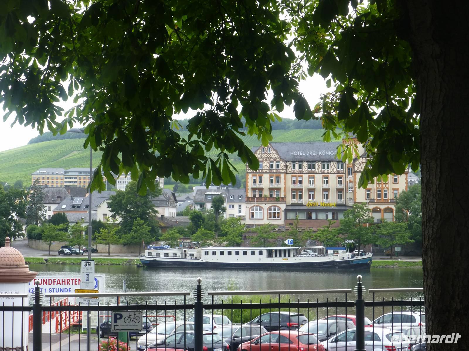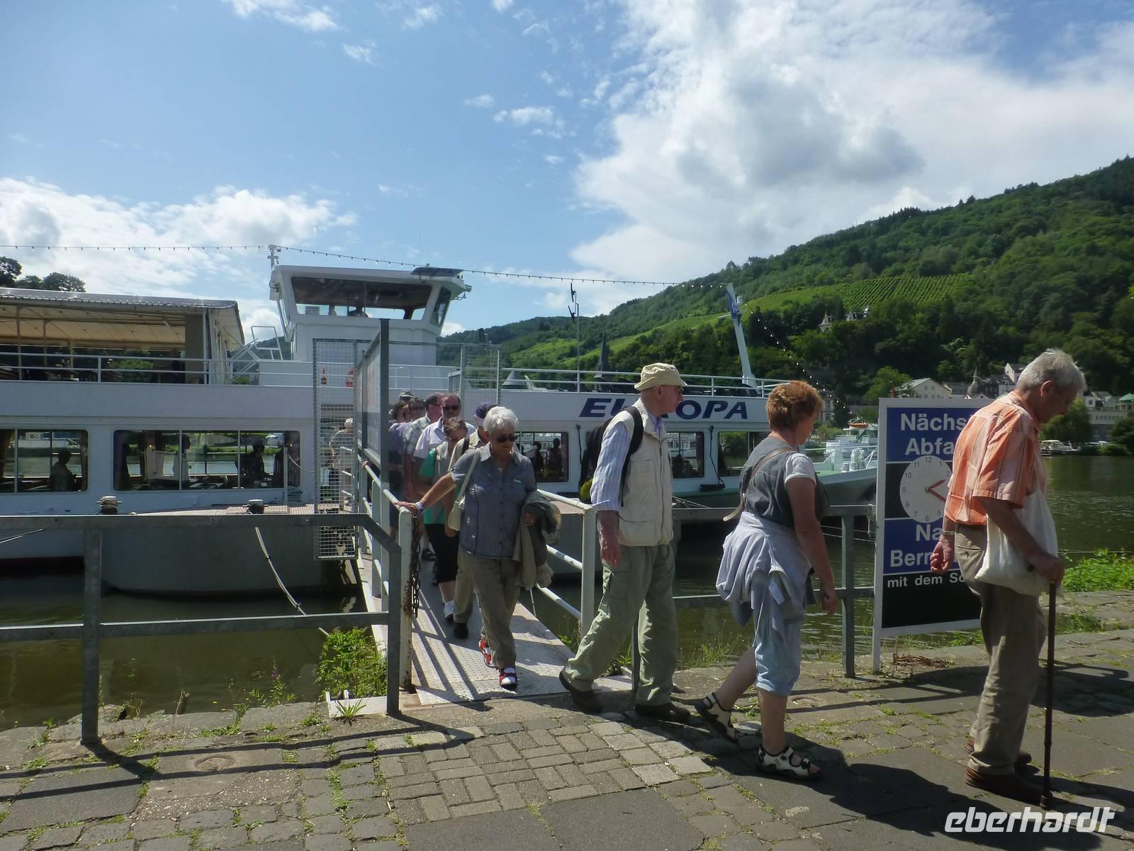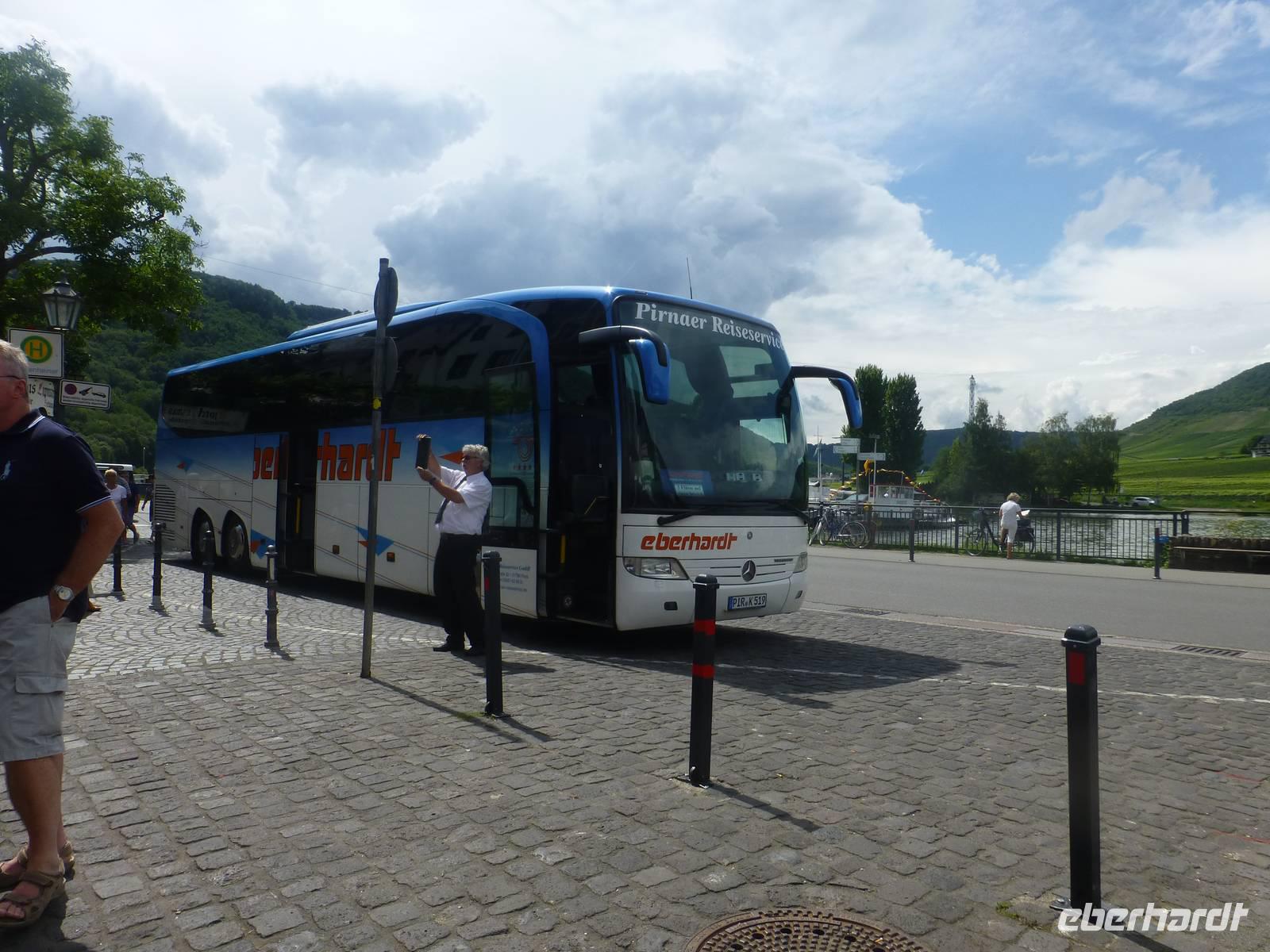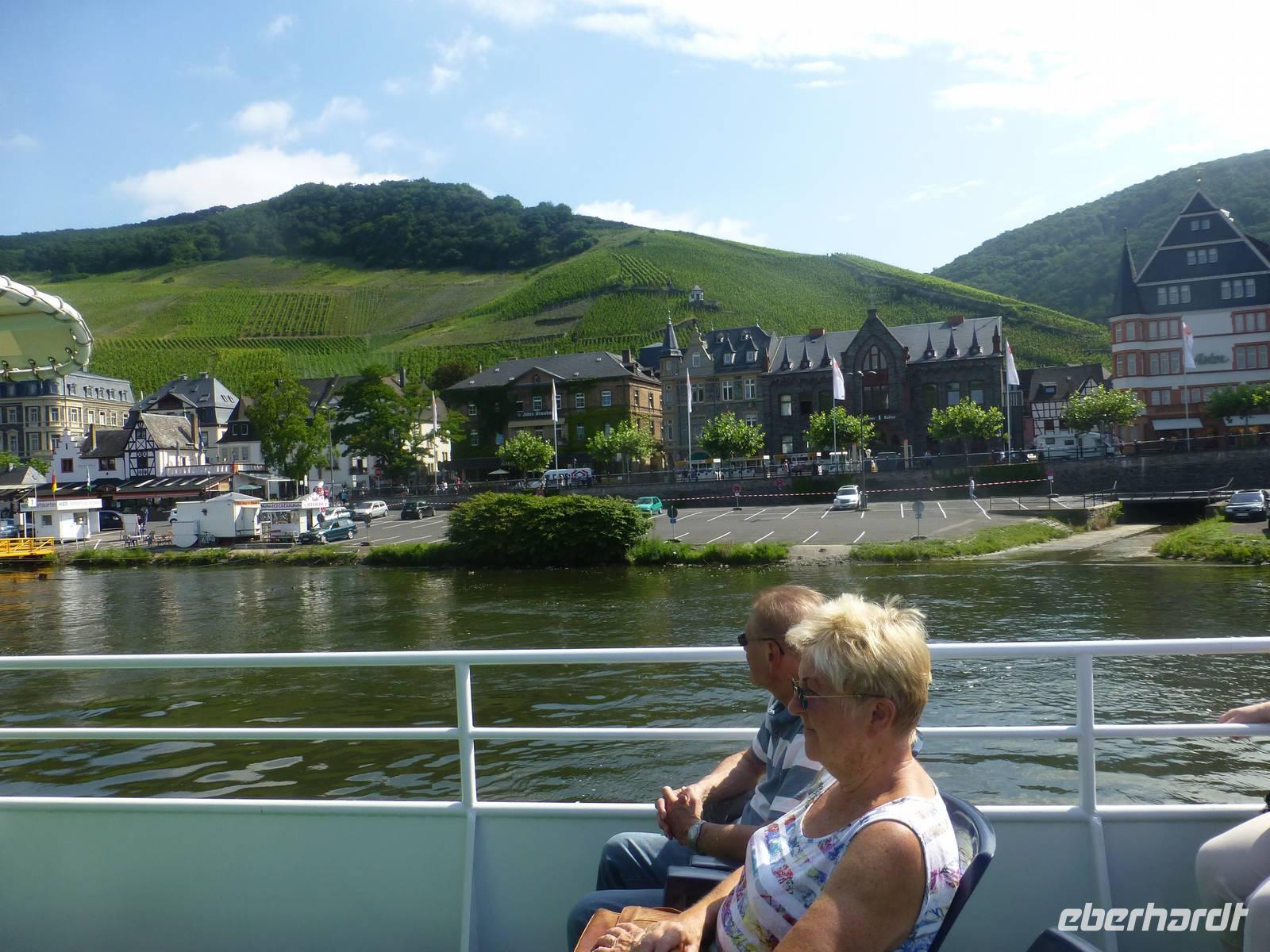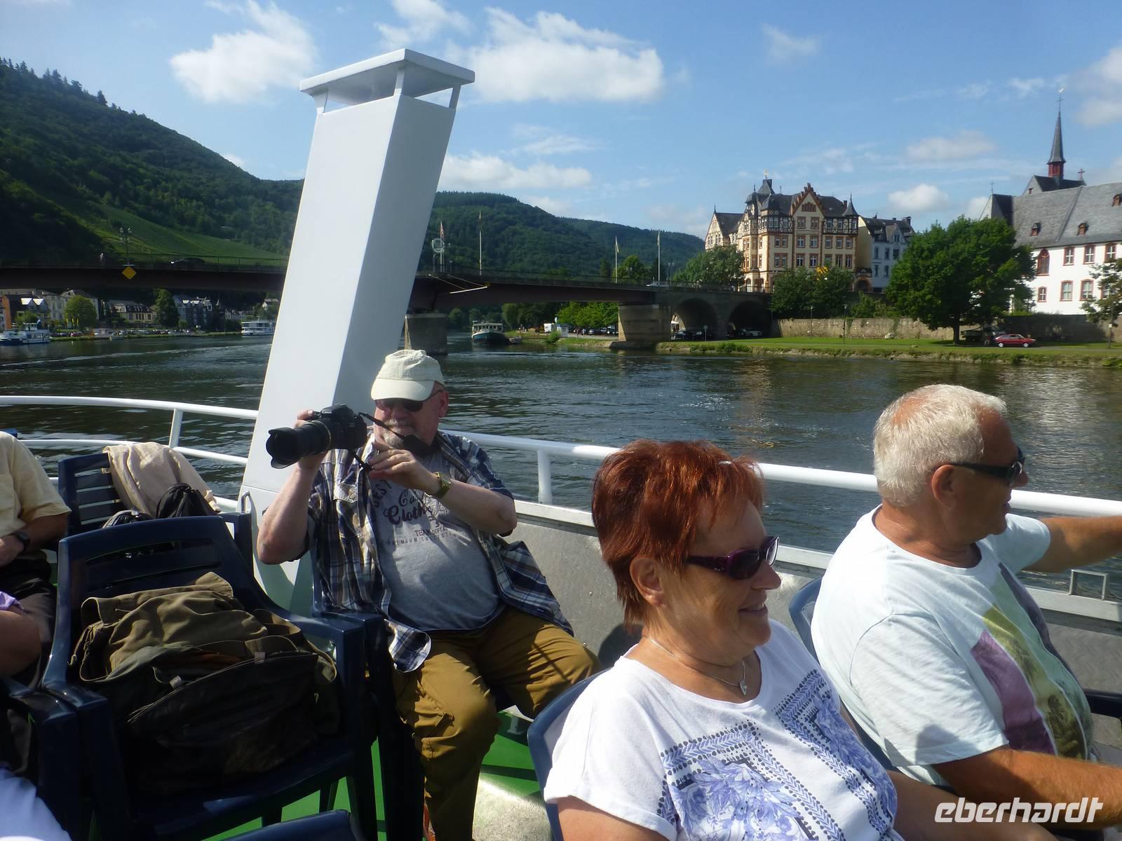 Über die Hunsrücker Höhenstrasse reisen wir heute an die Mosel. Unser erstes Ziel ist die idyllische Weinstadt Bernkastel Kues. Einer Legende nach stammt der Ortsname Bernkastel vom Begriff Bärenkessel. So lässt sich der Bär im Stadtwappen erklären, und im Bärenbrunnen finden wir gleich zwei als Brunnenfigur. Am historischen Marktplatz rund um den St.-Michaels-Brunnen stehen prächtig verzierte Giebelfachwerkhäuser aus dem 16. und 17. Jahrhundert sowie das markante Renaissance-Rathaus. Wir bummeln durch die verwinkelten Gassen des Winzerstädtchens, bevor es mit dem Schiff auf der Mosel weitergeht. Mit der "Europa" reisen wir bei strahlendem Sonnenschein bis Traben-Tarbach. Die Mosel schlängelt sich idyllisch durch weinbewachsene Berghänge. Kaum zu glauben, dass an diesen Steilhängen Wein angebaut werden kann. Plötzlich wieder eine Überraschung: Amphibienfahrzeuge kommen uns in großer Zahl entgegen. Die Eigentümer sind sichtlich stolz auf ihre fahr- und schiffbaren einzigartigen Kreationen. Kommt da ein schwimmender Trabi daher? Wir grüßen und winken und freuen uns an der "Prozession". Von Trabach geht es mit unserem Bus in die kleine, aber feine Stadt Beilstein. Diese ist recht schnell besichtigt, weil sie wirklich winzig ist, und so machen wir uns nach Cochem am Moselbogen auf. Auf den steilen Weinbergen der Umgebung gedeiht ein hervorragender Wein. Ein Weinladen neben dem anderen lädt zum Verkosten und Kaufen ein. Und das Cafe Flair wird von unserem Reiseleiter Volker wärmstens empfohlen. Deshalb begnügen wir uns mit einem Blick auf die mächtige Reichsburg, die stolz über der Stadt thront. Es war auch recht schwülwarm, ein Eis gerade recht. Die Stadt rühmt sich eines Kleinklimas, das 2 bis 3 Grad wärmer ist als anderswo...bis kurz vor Abfahrt ein schweres Gewitter ausbrach. Der Regen erwischte uns etwas heftig, aber die Sachen trockneten schnell wieder im Bus bei der Rückfahrt. Nach diesem erlebnisreichen Tag haben wir uns das deftige und reichhaltige Abendessen im Hotel redlich verdient.