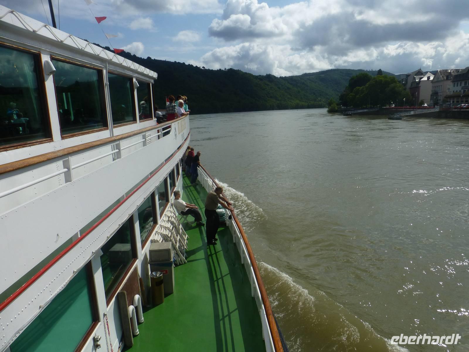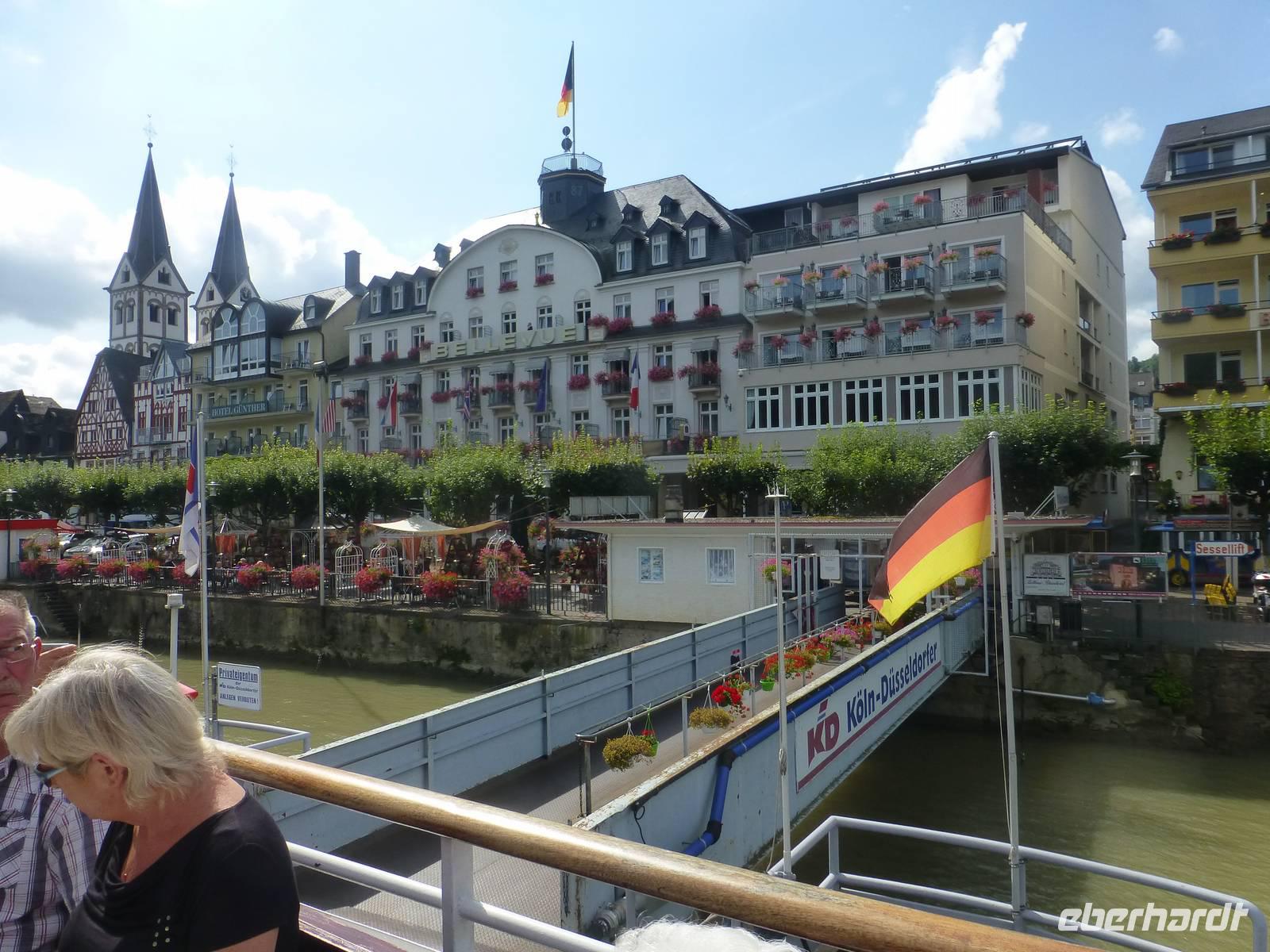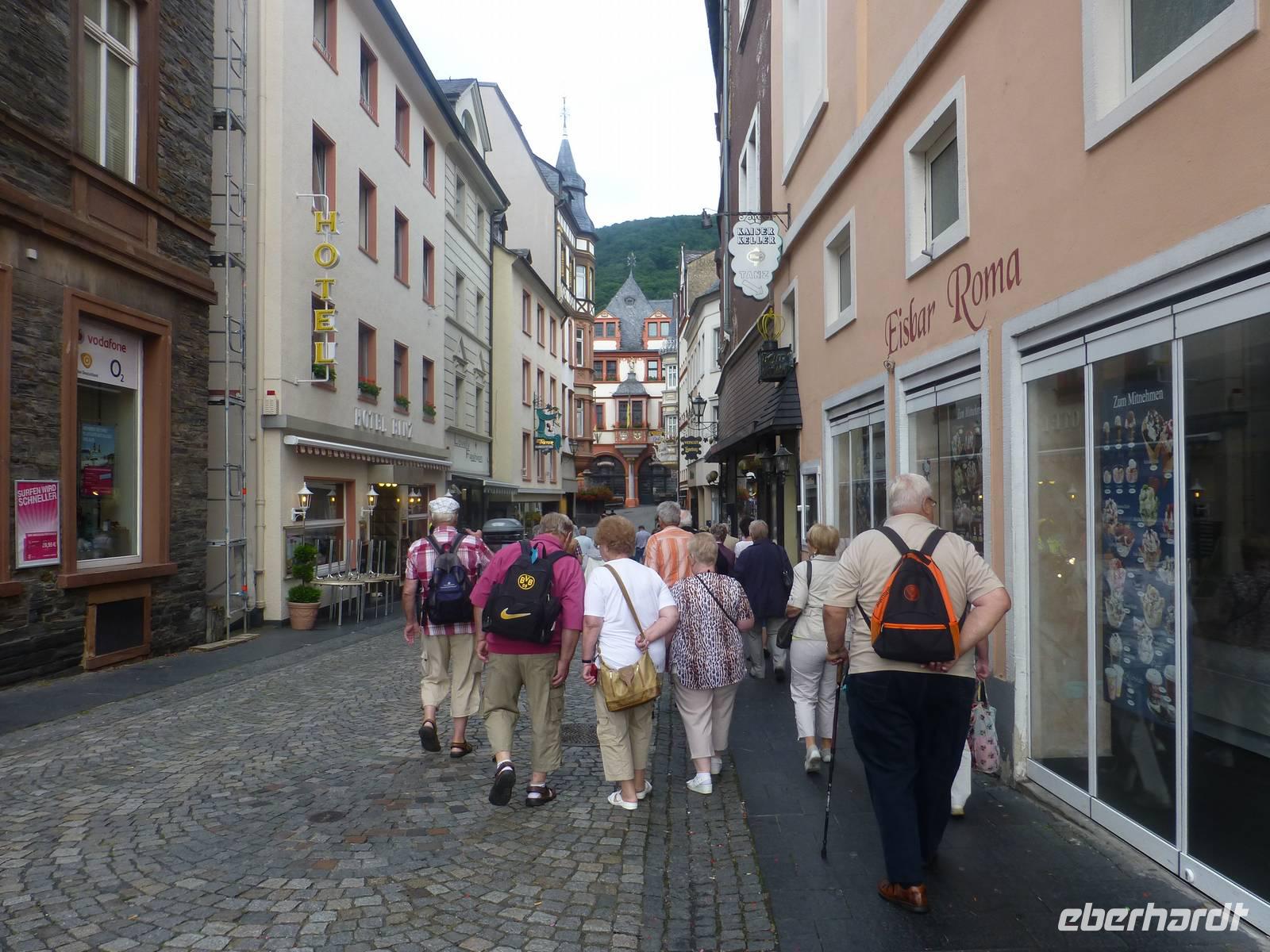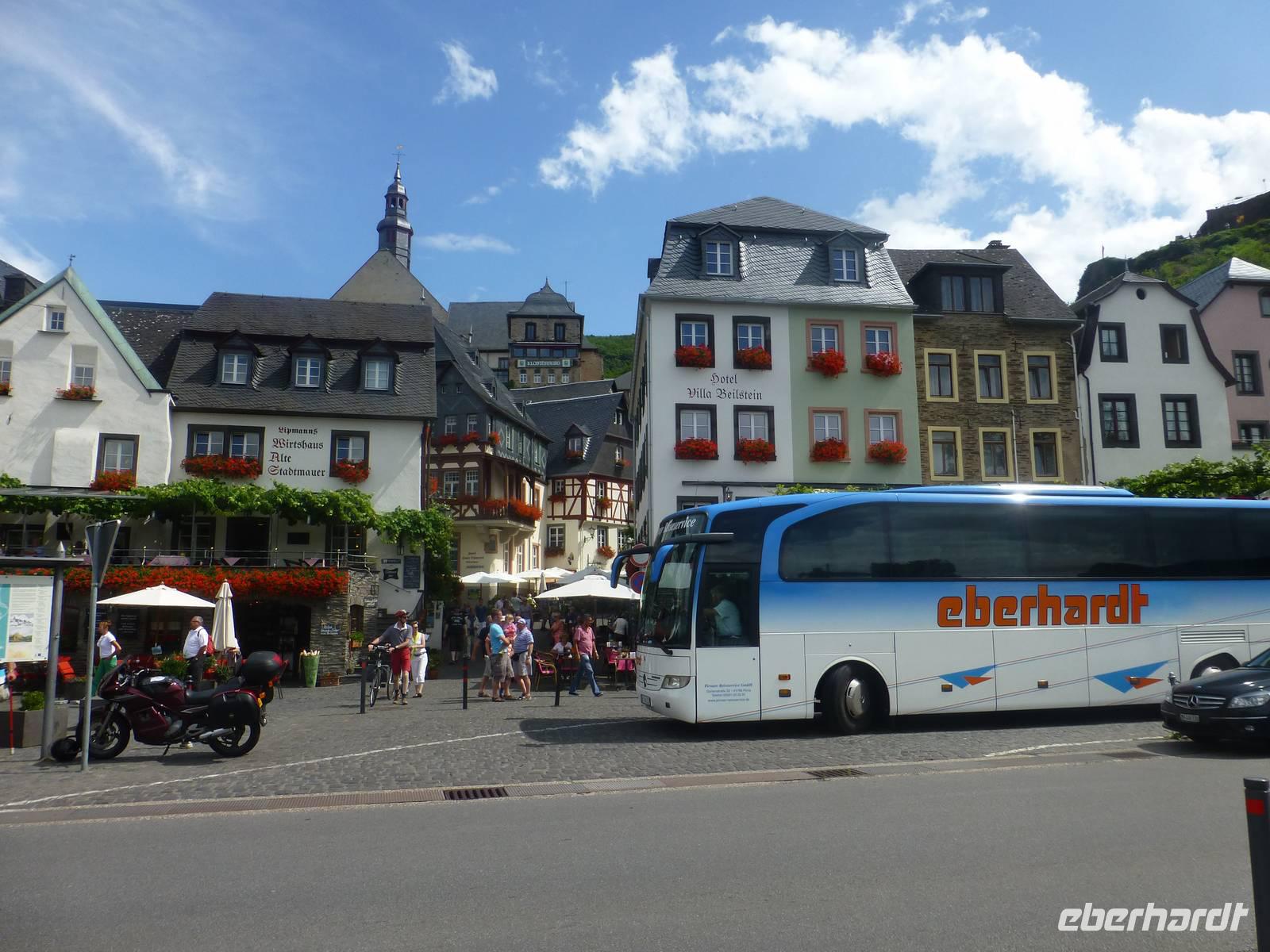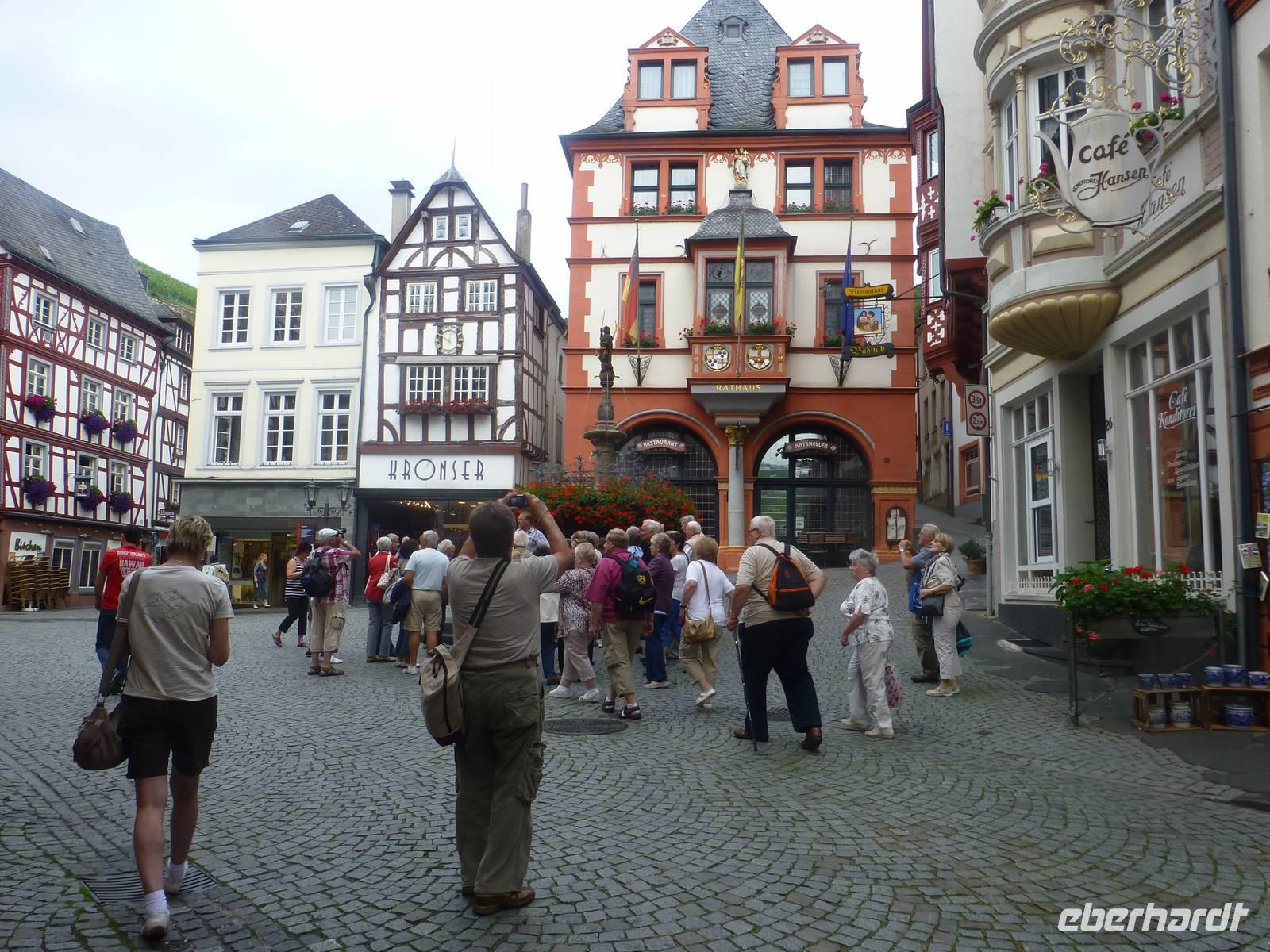 Über die Hunsrücker Höhenstrasse reisen wir heute an die Mosel. Unser erstes Ziel ist die idyllische Weinstadt Bernkastel Kues. Einer Legende nach stammt der Ortsname Bernkastel vom Begriff Bärenkessel. So lässt sich der Bär im Stadtwappen erklären, und im Bärenbrunnen finden wir gleich zwei als Brunnenfigur. Am historischen Marktplatz rund um den St.-Michaels-Brunnen stehen prächtig verzierte Giebelfachwerkhäuser aus dem 16. und 17. Jahrhundert sowie das markante Renaissance-Rathaus. Wir bummeln durch die verwinkelten Gassen des Winzerstädtchens, bevor es mit dem Schiff auf der Mosel weitergeht. Mit der "Europa" reisen wir bei strahlendem Sonnenschein bis Traben-Tarbach. Die Mosel schlängelt sich idyllisch durch weinbewachsene Berghänge. Kaum zu glauben, dass an diesen Steilhängen Wein angebaut werden kann. Plötzlich wieder eine Überraschung: Amphibienfahrzeuge kommen uns in großer Zahl entgegen. Die Eigentümer sind sichtlich stolz auf ihre fahr- und schiffbaren einzigartigen Kreationen. Kommt da ein schwimmender Trabi daher? Wir grüßen und winken und freuen uns an der "Prozession". Von Trabach geht es mit unserem Bus in die kleine, aber feine Stadt Beilstein. Diese ist recht schnell besichtigt, weil sie wirklich winzig ist, und so machen wir uns nach Cochem am Moselbogen auf. Auf den steilen Weinbergen der Umgebung gedeiht ein hervorragender Wein. Ein Weinladen neben dem anderen lädt zum Verkosten und Kaufen ein. Und das Cafe Flair wird von unserem Reiseleiter Volker wärmstens empfohlen. Deshalb begnügen wir uns mit einem Blick auf die mächtige Reichsburg, die stolz über der Stadt thront. Es war auch recht schwülwarm, ein Eis gerade recht. Die Stadt rühmt sich eines Kleinklimas, das 2 bis 3 Grad wärmer ist als anderswo...bis kurz vor Abfahrt ein schweres Gewitter ausbrach. Der Regen erwischte uns etwas heftig, aber die Sachen trockneten schnell wieder im Bus bei der Rückfahrt. Nach diesem erlebnisreichen Tag haben wir uns das deftige und reichhaltige Abendessen im Hotel redlich verdient.