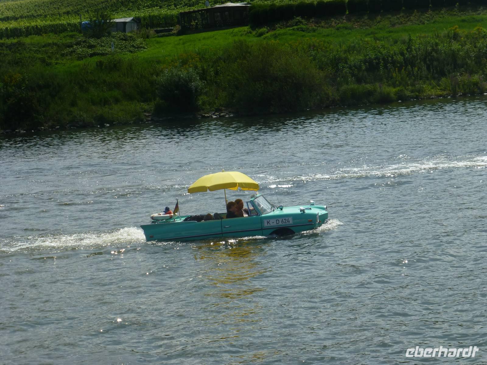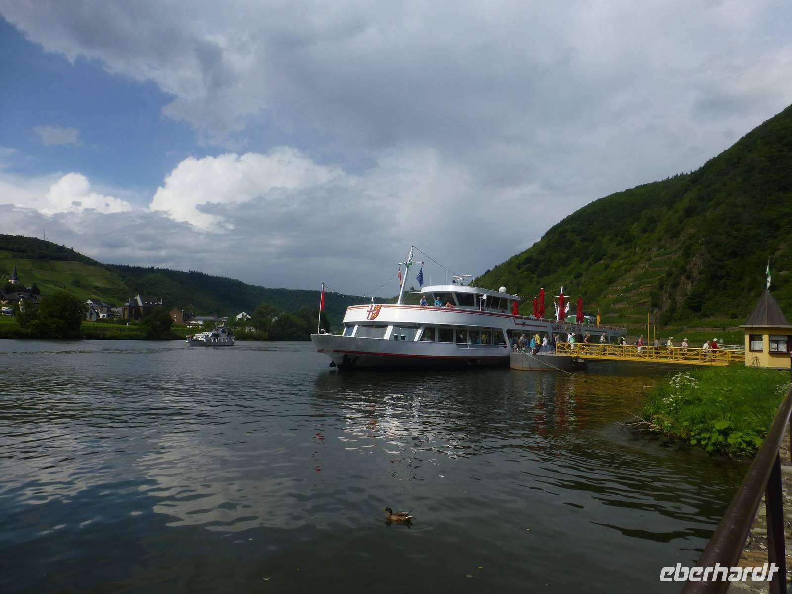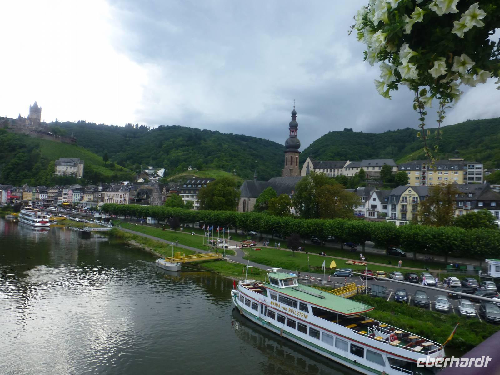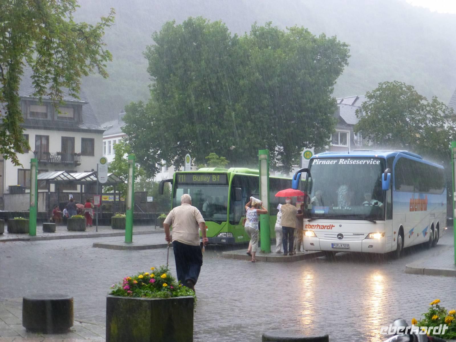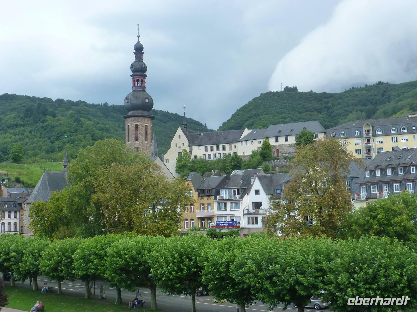 Über die Hunsrücker Höhenstrasse reisen wir heute an die Mosel. Unser erstes Ziel ist die idyllische Weinstadt Bernkastel Kues. Einer Legende nach stammt der Ortsname Bernkastel vom Begriff Bärenkessel. So lässt sich der Bär im Stadtwappen erklären, und im Bärenbrunnen finden wir gleich zwei als Brunnenfigur. Am historischen Marktplatz rund um den St.-Michaels-Brunnen stehen prächtig verzierte Giebelfachwerkhäuser aus dem 16. und 17. Jahrhundert sowie das markante Renaissance-Rathaus. Wir bummeln durch die verwinkelten Gassen des Winzerstädtchens, bevor es mit dem Schiff auf der Mosel weitergeht. Mit der "Europa" reisen wir bei strahlendem Sonnenschein bis Traben-Tarbach. Die Mosel schlängelt sich idyllisch durch weinbewachsene Berghänge. Kaum zu glauben, dass an diesen Steilhängen Wein angebaut werden kann. Plötzlich wieder eine Überraschung: Amphibienfahrzeuge kommen uns in großer Zahl entgegen. Die Eigentümer sind sichtlich stolz auf ihre fahr- und schiffbaren einzigartigen Kreationen. Kommt da ein schwimmender Trabi daher? Wir grüßen und winken und freuen uns an der "Prozession". Von Trabach geht es mit unserem Bus in die kleine, aber feine Stadt Beilstein. Diese ist recht schnell besichtigt, weil sie wirklich winzig ist, und so machen wir uns nach Cochem am Moselbogen auf. Auf den steilen Weinbergen der Umgebung gedeiht ein hervorragender Wein. Ein Weinladen neben dem anderen lädt zum Verkosten und Kaufen ein. Und das Cafe Flair wird von unserem Reiseleiter Volker wärmstens empfohlen. Deshalb begnügen wir uns mit einem Blick auf die mächtige Reichsburg, die stolz über der Stadt thront. Es war auch recht schwülwarm, ein Eis gerade recht. Die Stadt rühmt sich eines Kleinklimas, das 2 bis 3 Grad wärmer ist als anderswo...bis kurz vor Abfahrt ein schweres Gewitter ausbrach. Der Regen erwischte uns etwas heftig, aber die Sachen trockneten schnell wieder im Bus bei der Rückfahrt. Nach diesem erlebnisreichen Tag haben wir uns das deftige und reichhaltige Abendessen im Hotel redlich verdient.