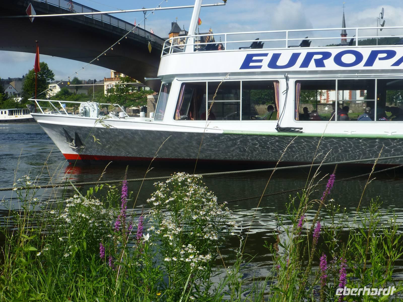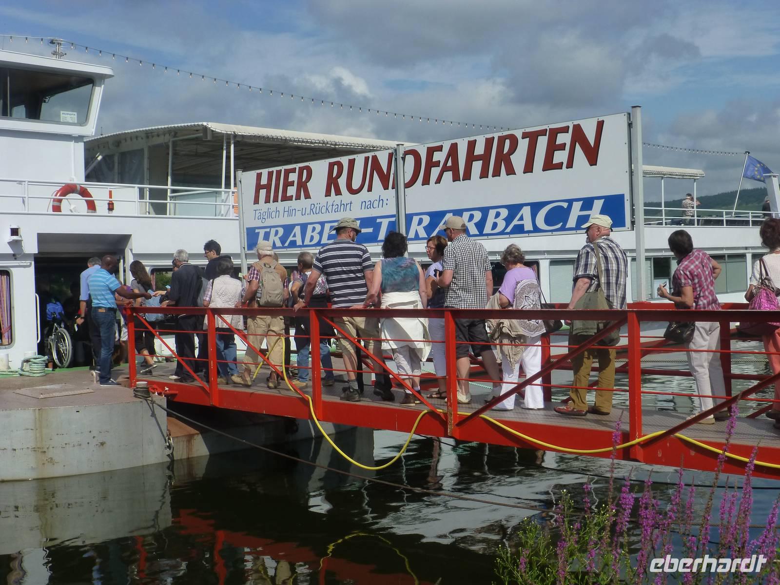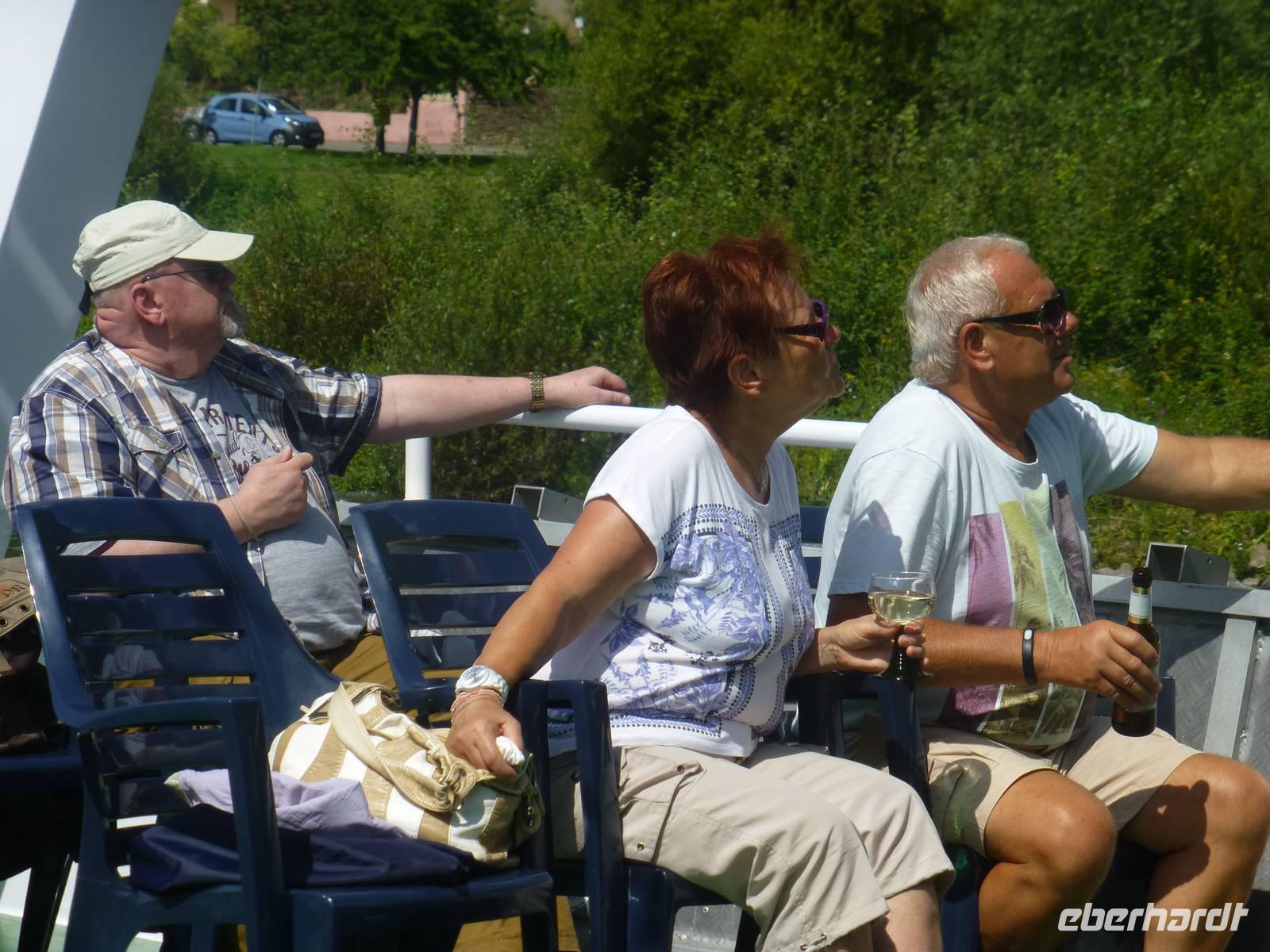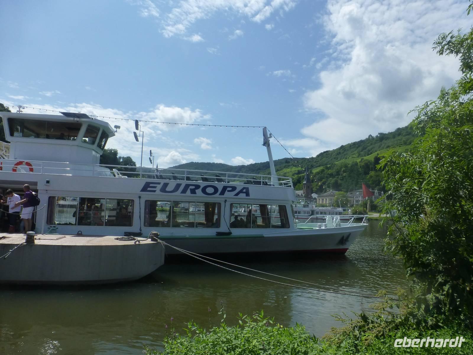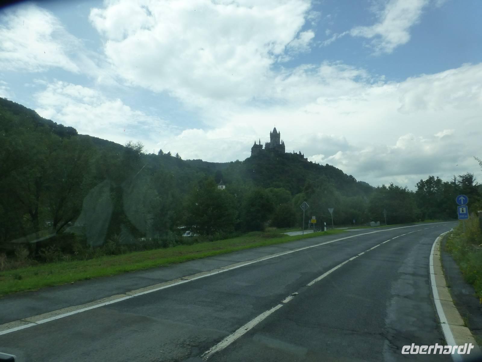 Über die Hunsrücker Höhenstrasse reisen wir heute an die Mosel. Unser erstes Ziel ist die idyllische Weinstadt Bernkastel Kues. Einer Legende nach stammt der Ortsname Bernkastel vom Begriff Bärenkessel. So lässt sich der Bär im Stadtwappen erklären, und im Bärenbrunnen finden wir gleich zwei als Brunnenfigur. Am historischen Marktplatz rund um den St.-Michaels-Brunnen stehen prächtig verzierte Giebelfachwerkhäuser aus dem 16. und 17. Jahrhundert sowie das markante Renaissance-Rathaus. Wir bummeln durch die verwinkelten Gassen des Winzerstädtchens, bevor es mit dem Schiff auf der Mosel weitergeht. Mit der "Europa" reisen wir bei strahlendem Sonnenschein bis Traben-Tarbach. Die Mosel schlängelt sich idyllisch durch weinbewachsene Berghänge. Kaum zu glauben, dass an diesen Steilhängen Wein angebaut werden kann. Plötzlich wieder eine Überraschung: Amphibienfahrzeuge kommen uns in großer Zahl entgegen. Die Eigentümer sind sichtlich stolz auf ihre fahr- und schiffbaren einzigartigen Kreationen. Kommt da ein schwimmender Trabi daher? Wir grüßen und winken und freuen uns an der "Prozession". Von Trabach geht es mit unserem Bus in die kleine, aber feine Stadt Beilstein. Diese ist recht schnell besichtigt, weil sie wirklich winzig ist, und so machen wir uns nach Cochem am Moselbogen auf. Auf den steilen Weinbergen der Umgebung gedeiht ein hervorragender Wein. Ein Weinladen neben dem anderen lädt zum Verkosten und Kaufen ein. Und das Cafe Flair wird von unserem Reiseleiter Volker wärmstens empfohlen. Deshalb begnügen wir uns mit einem Blick auf die mächtige Reichsburg, die stolz über der Stadt thront. Es war auch recht schwülwarm, ein Eis gerade recht. Die Stadt rühmt sich eines Kleinklimas, das 2 bis 3 Grad wärmer ist als anderswo...bis kurz vor Abfahrt ein schweres Gewitter ausbrach. Der Regen erwischte uns etwas heftig, aber die Sachen trockneten schnell wieder im Bus bei der Rückfahrt. Nach diesem erlebnisreichen Tag haben wir uns das deftige und reichhaltige Abendessen im Hotel redlich verdient.