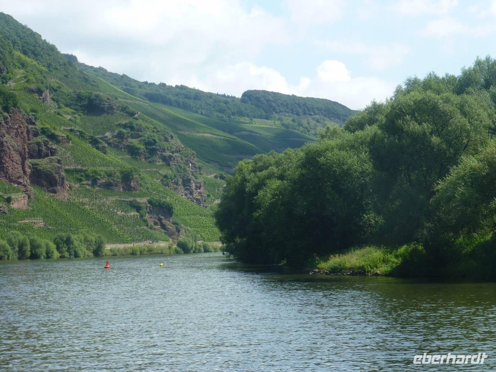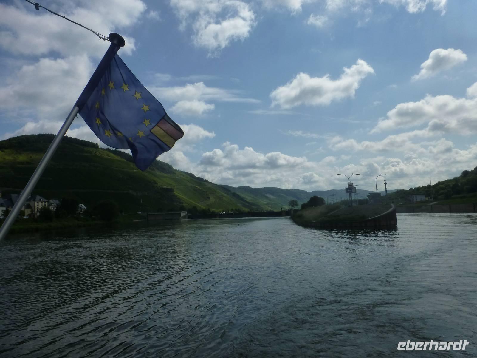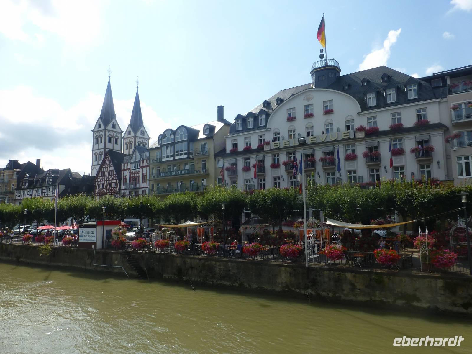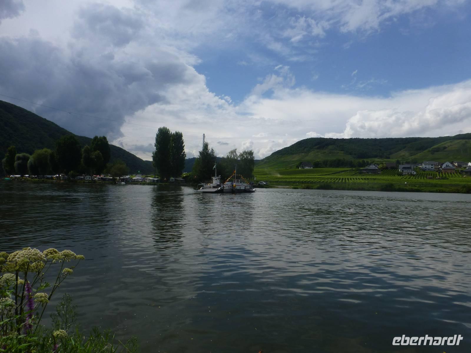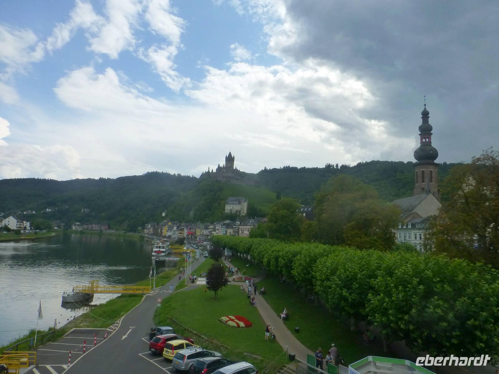 Über die Hunsrücker Höhenstrasse reisen wir heute an die Mosel. Unser erstes Ziel ist die idyllische Weinstadt Bernkastel Kues. Einer Legende nach stammt der Ortsname Bernkastel vom Begriff Bärenkessel. So lässt sich der Bär im Stadtwappen erklären, und im Bärenbrunnen finden wir gleich zwei als Brunnenfigur. Am historischen Marktplatz rund um den St.-Michaels-Brunnen stehen prächtig verzierte Giebelfachwerkhäuser aus dem 16. und 17. Jahrhundert sowie das markante Renaissance-Rathaus. Wir bummeln durch die verwinkelten Gassen des Winzerstädtchens, bevor es mit dem Schiff auf der Mosel weitergeht. Mit der "Europa" reisen wir bei strahlendem Sonnenschein bis Traben-Tarbach. Die Mosel schlängelt sich idyllisch durch weinbewachsene Berghänge. Kaum zu glauben, dass an diesen Steilhängen Wein angebaut werden kann. Plötzlich wieder eine Überraschung: Amphibienfahrzeuge kommen uns in großer Zahl entgegen. Die Eigentümer sind sichtlich stolz auf ihre fahr- und schiffbaren einzigartigen Kreationen. Kommt da ein schwimmender Trabi daher? Wir grüßen und winken und freuen uns an der "Prozession". Von Trabach geht es mit unserem Bus in die kleine, aber feine Stadt Beilstein. Diese ist recht schnell besichtigt, weil sie wirklich winzig ist, und so machen wir uns nach Cochem am Moselbogen auf. Auf den steilen Weinbergen der Umgebung gedeiht ein hervorragender Wein. Ein Weinladen neben dem anderen lädt zum Verkosten und Kaufen ein. Und das Cafe Flair wird von unserem Reiseleiter Volker wärmstens empfohlen. Deshalb begnügen wir uns mit einem Blick auf die mächtige Reichsburg, die stolz über der Stadt thront. Es war auch recht schwülwarm, ein Eis gerade recht. Die Stadt rühmt sich eines Kleinklimas, das 2 bis 3 Grad wärmer ist als anderswo...bis kurz vor Abfahrt ein schweres Gewitter ausbrach. Der Regen erwischte uns etwas heftig, aber die Sachen trockneten schnell wieder im Bus bei der Rückfahrt. Nach diesem erlebnisreichen Tag haben wir uns das deftige und reichhaltige Abendessen im Hotel redlich verdient.