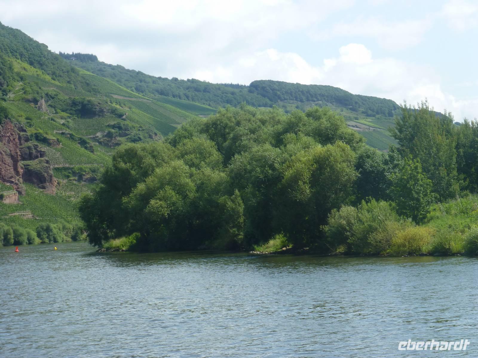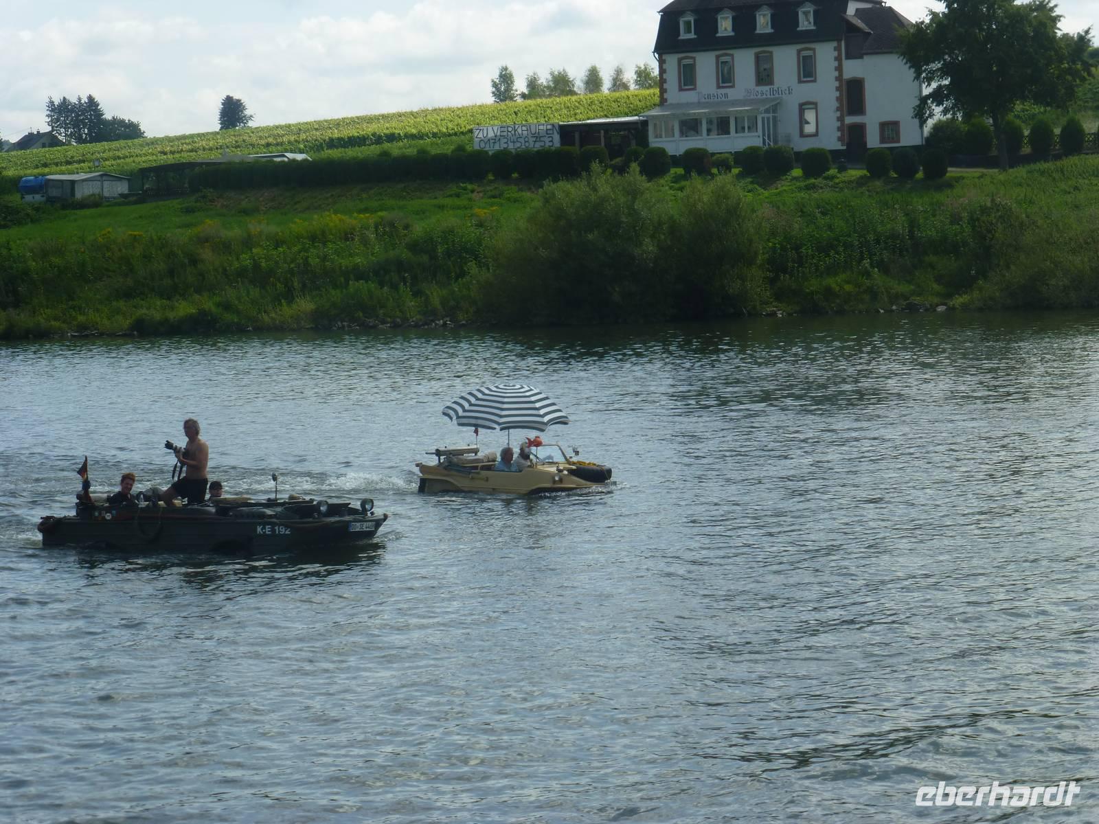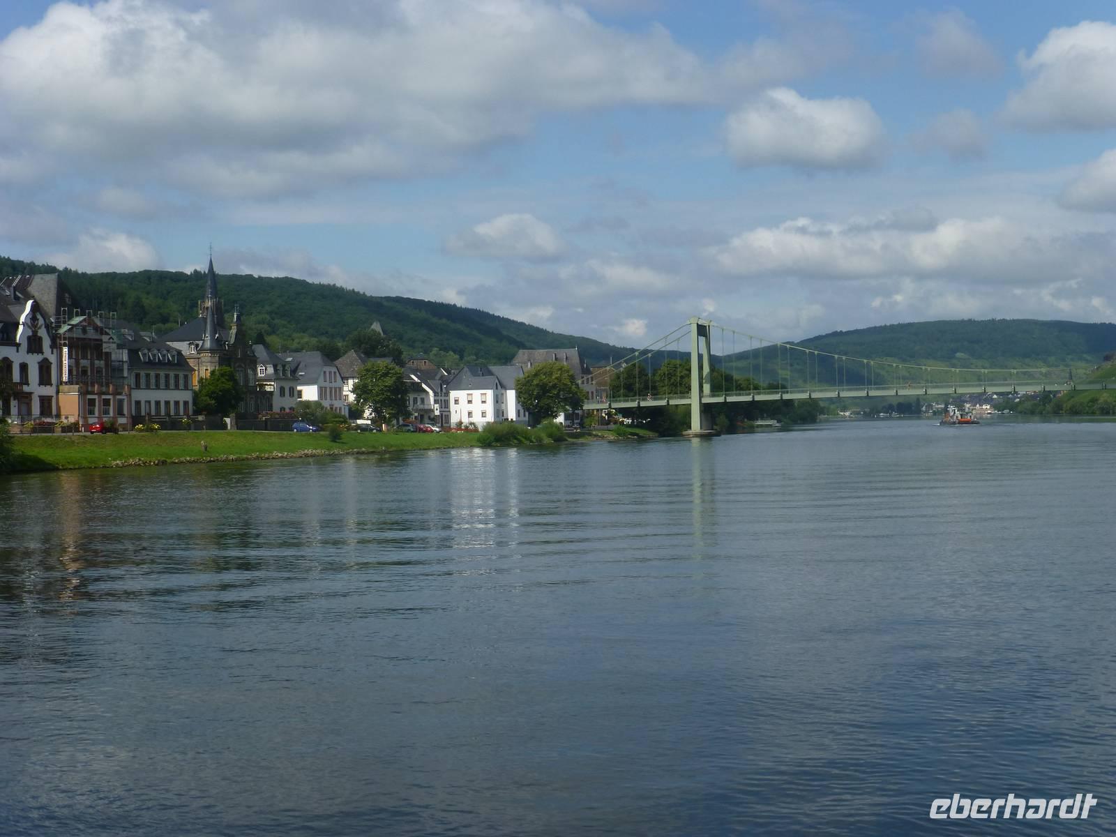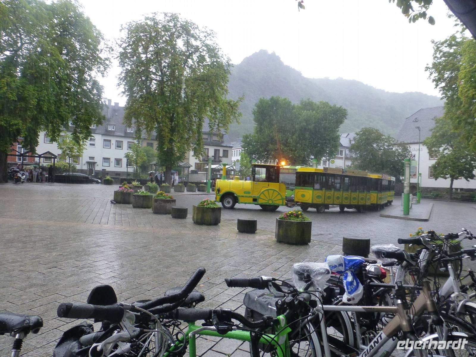 Über die Hunsrücker Höhenstrasse reisen wir heute an die Mosel. Unser erstes Ziel ist die idyllische Weinstadt Bernkastel Kues. Einer Legende nach stammt der Ortsname Bernkastel vom Begriff Bärenkessel. So lässt sich der Bär im Stadtwappen erklären, und im Bärenbrunnen finden wir gleich zwei als Brunnenfigur. Am historischen Marktplatz rund um den St.-Michaels-Brunnen stehen prächtig verzierte Giebelfachwerkhäuser aus dem 16. und 17. Jahrhundert sowie das markante Renaissance-Rathaus. Wir bummeln durch die verwinkelten Gassen des Winzerstädtchens, bevor es mit dem Schiff auf der Mosel weitergeht. Mit der "Europa" reisen wir bei strahlendem Sonnenschein bis Traben-Tarbach. Die Mosel schlängelt sich idyllisch durch weinbewachsene Berghänge. Kaum zu glauben, dass an diesen Steilhängen Wein angebaut werden kann. Plötzlich wieder eine Überraschung: Amphibienfahrzeuge kommen uns in großer Zahl entgegen. Die Eigentümer sind sichtlich stolz auf ihre fahr- und schiffbaren einzigartigen Kreationen. Kommt da ein schwimmender Trabi daher? Wir grüßen und winken und freuen uns an der "Prozession". Von Trabach geht es mit unserem Bus in die kleine, aber feine Stadt Beilstein. Diese ist recht schnell besichtigt, weil sie wirklich winzig ist, und so machen wir uns nach Cochem am Moselbogen auf. Auf den steilen Weinbergen der Umgebung gedeiht ein hervorragender Wein. Ein Weinladen neben dem anderen lädt zum Verkosten und Kaufen ein. Und das Cafe Flair wird von unserem Reiseleiter Volker wärmstens empfohlen. Deshalb begnügen wir uns mit einem Blick auf die mächtige Reichsburg, die stolz über der Stadt thront. Es war auch recht schwülwarm, ein Eis gerade recht. Die Stadt rühmt sich eines Kleinklimas, das 2 bis 3 Grad wärmer ist als anderswo...bis kurz vor Abfahrt ein schweres Gewitter ausbrach. Der Regen erwischte uns etwas heftig, aber die Sachen trockneten schnell wieder im Bus bei der Rückfahrt. Nach diesem erlebnisreichen Tag haben wir uns das deftige und reichhaltige Abendessen im Hotel redlich verdient.