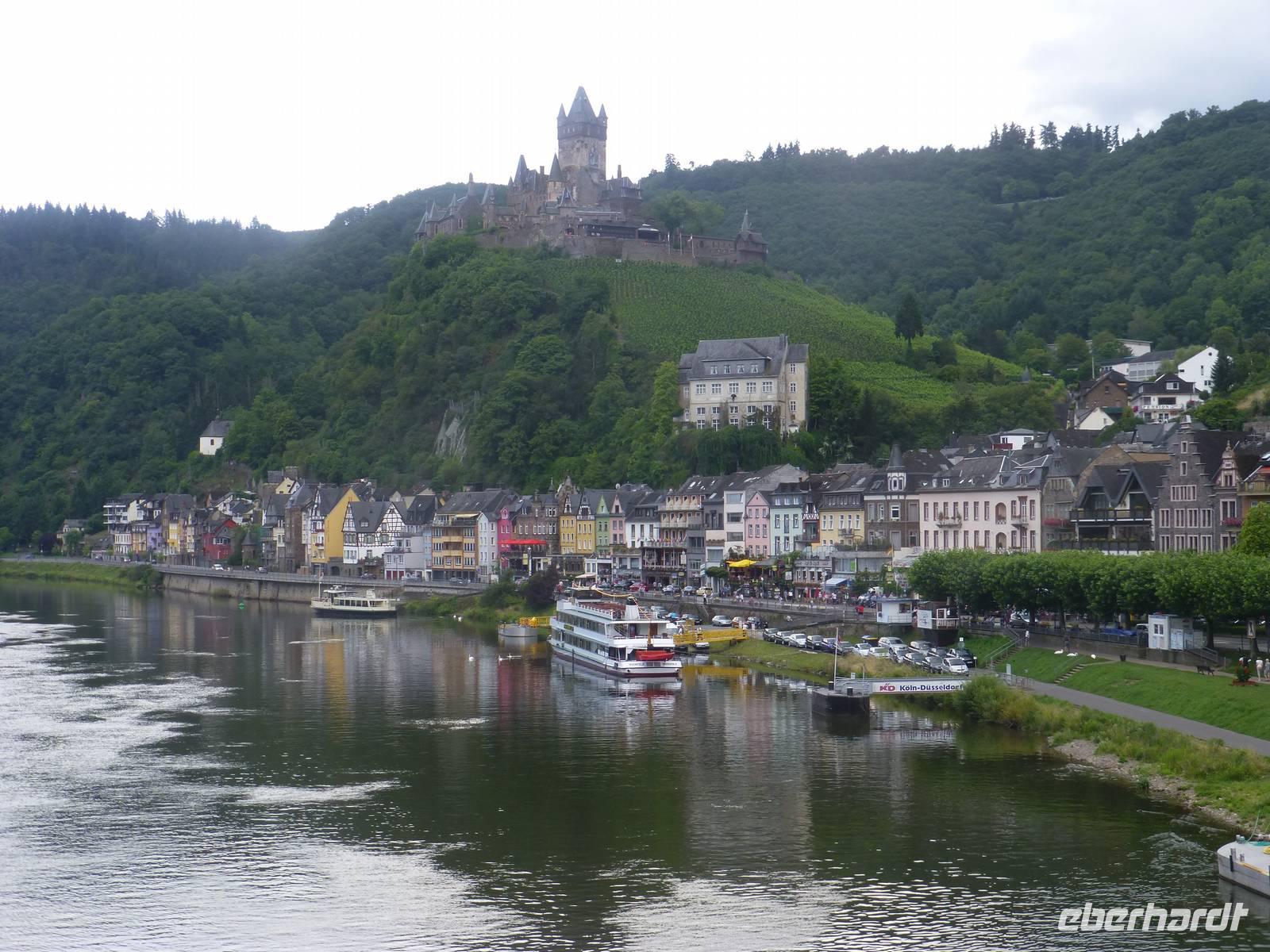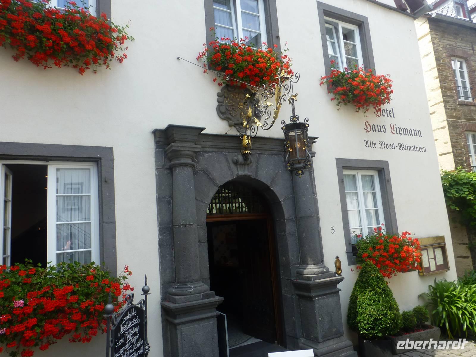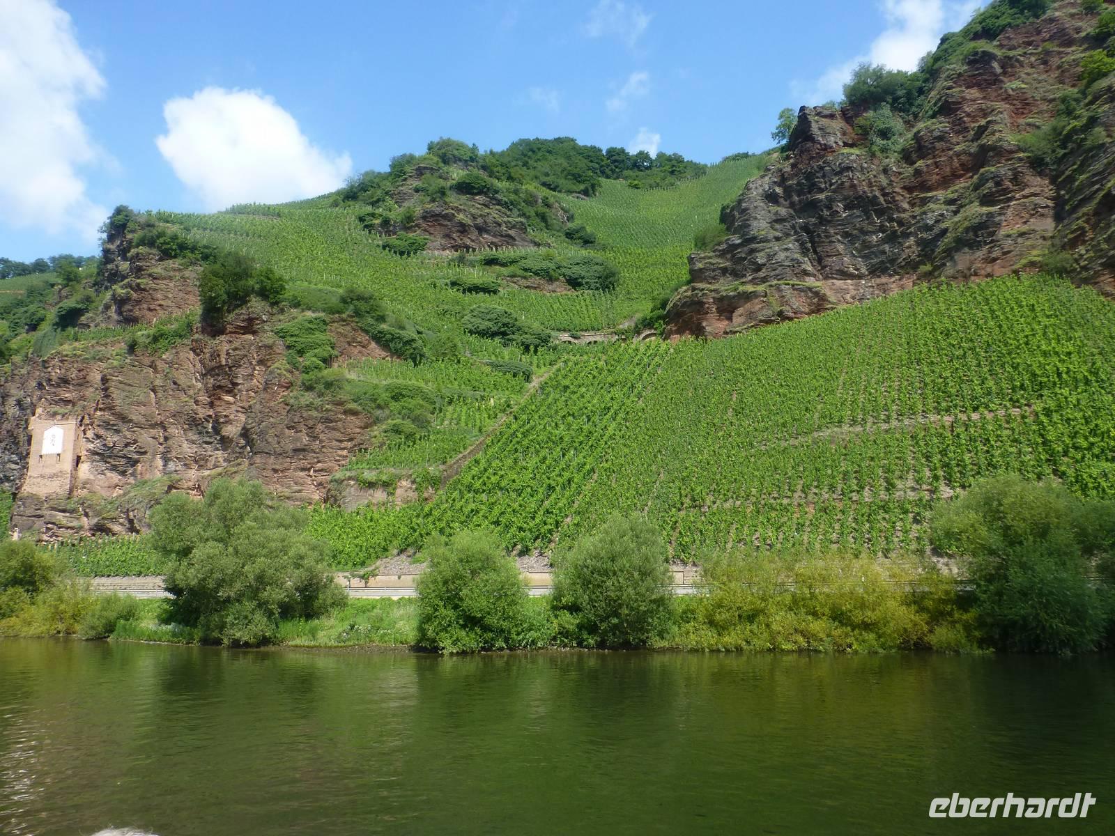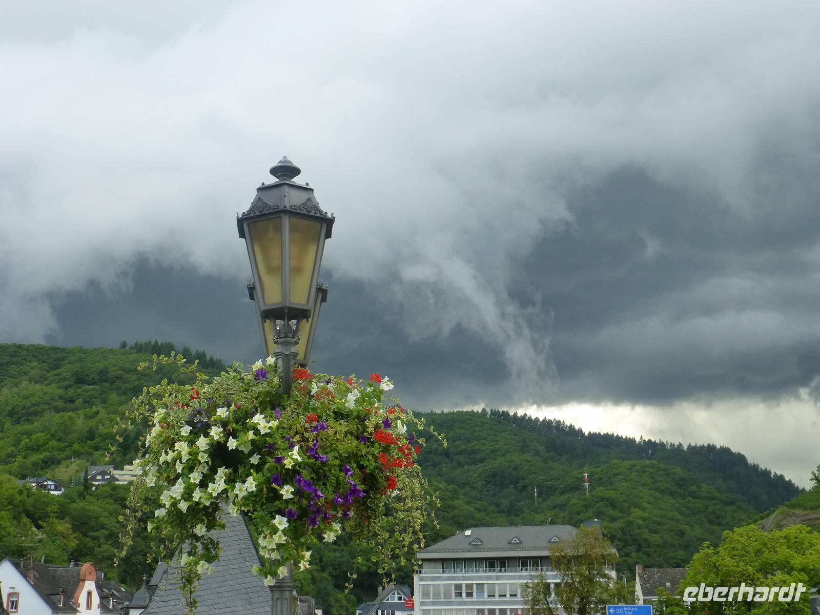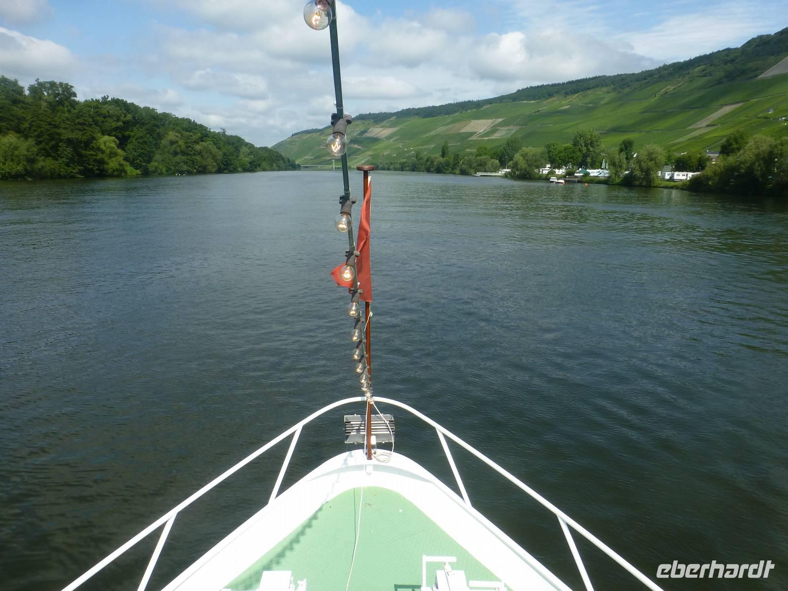 Über die Hunsrücker Höhenstrasse reisen wir heute an die Mosel. Unser erstes Ziel ist die idyllische Weinstadt Bernkastel Kues. Einer Legende nach stammt der Ortsname Bernkastel vom Begriff Bärenkessel. So lässt sich der Bär im Stadtwappen erklären, und im Bärenbrunnen finden wir gleich zwei als Brunnenfigur. Am historischen Marktplatz rund um den St.-Michaels-Brunnen stehen prächtig verzierte Giebelfachwerkhäuser aus dem 16. und 17. Jahrhundert sowie das markante Renaissance-Rathaus. Wir bummeln durch die verwinkelten Gassen des Winzerstädtchens, bevor es mit dem Schiff auf der Mosel weitergeht. Mit der "Europa" reisen wir bei strahlendem Sonnenschein bis Traben-Tarbach. Die Mosel schlängelt sich idyllisch durch weinbewachsene Berghänge. Kaum zu glauben, dass an diesen Steilhängen Wein angebaut werden kann. Plötzlich wieder eine Überraschung: Amphibienfahrzeuge kommen uns in großer Zahl entgegen. Die Eigentümer sind sichtlich stolz auf ihre fahr- und schiffbaren einzigartigen Kreationen. Kommt da ein schwimmender Trabi daher? Wir grüßen und winken und freuen uns an der "Prozession". Von Trabach geht es mit unserem Bus in die kleine, aber feine Stadt Beilstein. Diese ist recht schnell besichtigt, weil sie wirklich winzig ist, und so machen wir uns nach Cochem am Moselbogen auf. Auf den steilen Weinbergen der Umgebung gedeiht ein hervorragender Wein. Ein Weinladen neben dem anderen lädt zum Verkosten und Kaufen ein. Und das Cafe Flair wird von unserem Reiseleiter Volker wärmstens empfohlen. Deshalb begnügen wir uns mit einem Blick auf die mächtige Reichsburg, die stolz über der Stadt thront. Es war auch recht schwülwarm, ein Eis gerade recht. Die Stadt rühmt sich eines Kleinklimas, das 2 bis 3 Grad wärmer ist als anderswo...bis kurz vor Abfahrt ein schweres Gewitter ausbrach. Der Regen erwischte uns etwas heftig, aber die Sachen trockneten schnell wieder im Bus bei der Rückfahrt. Nach diesem erlebnisreichen Tag haben wir uns das deftige und reichhaltige Abendessen im Hotel redlich verdient.