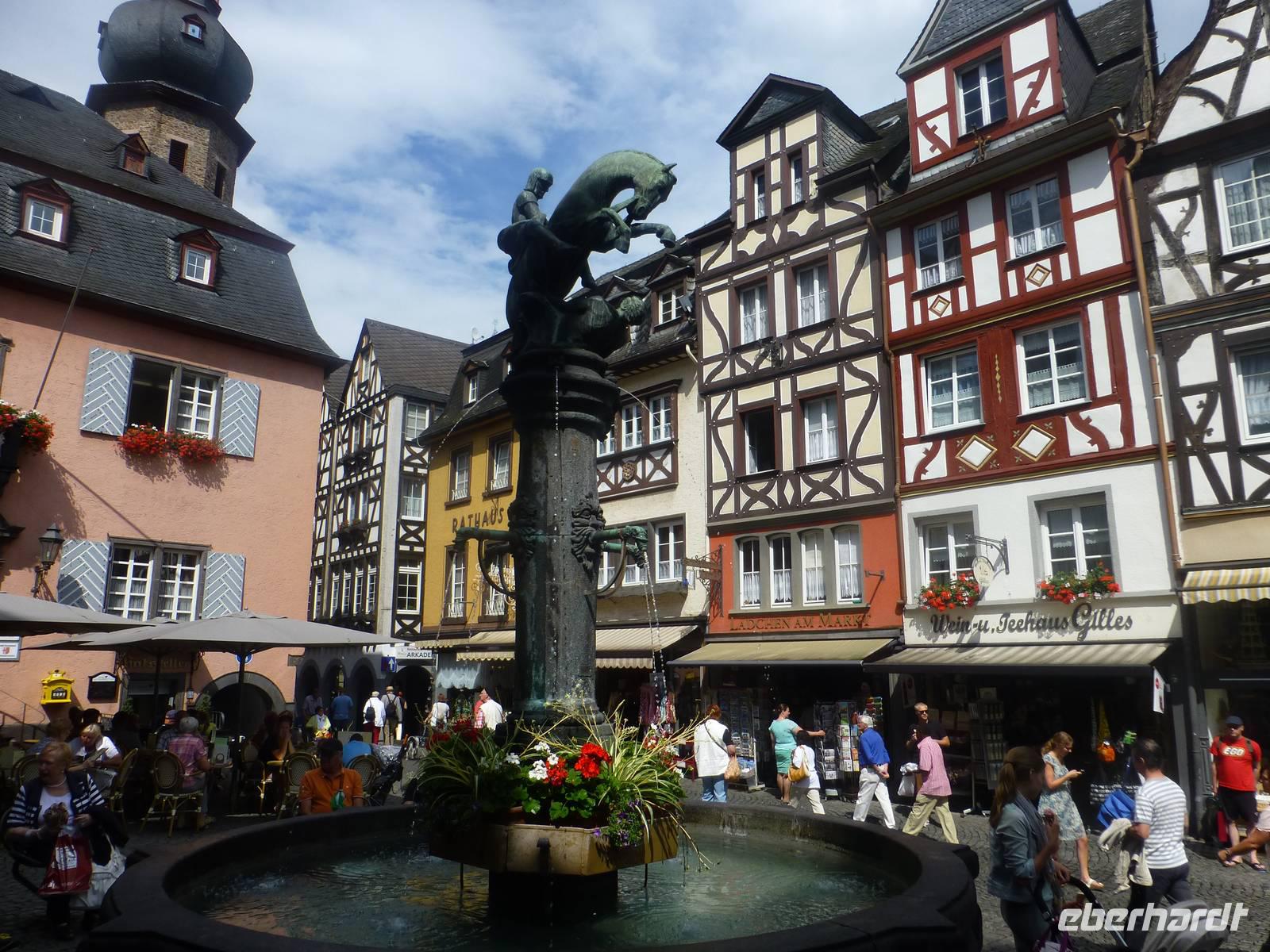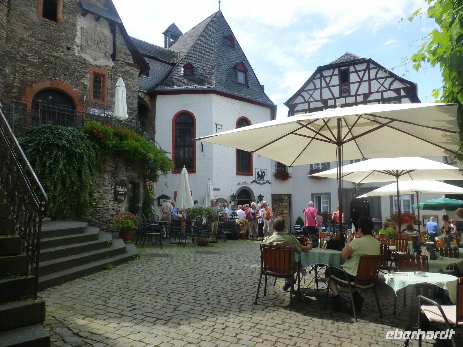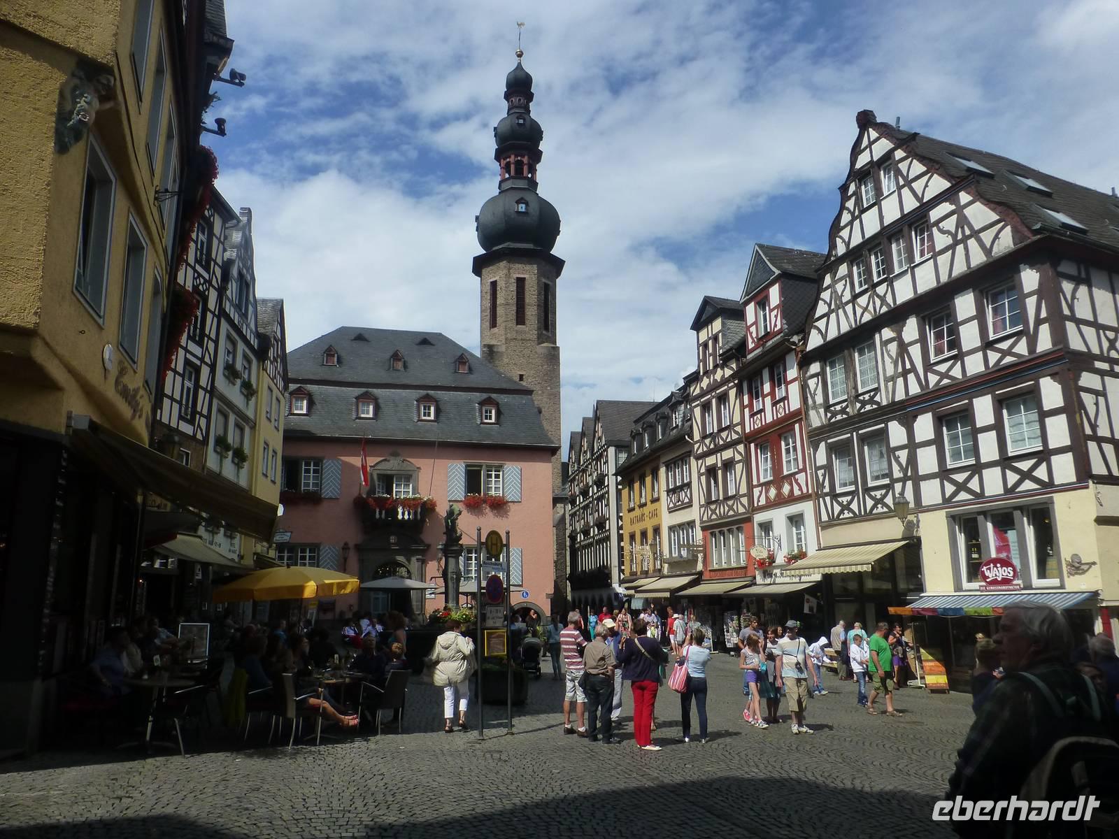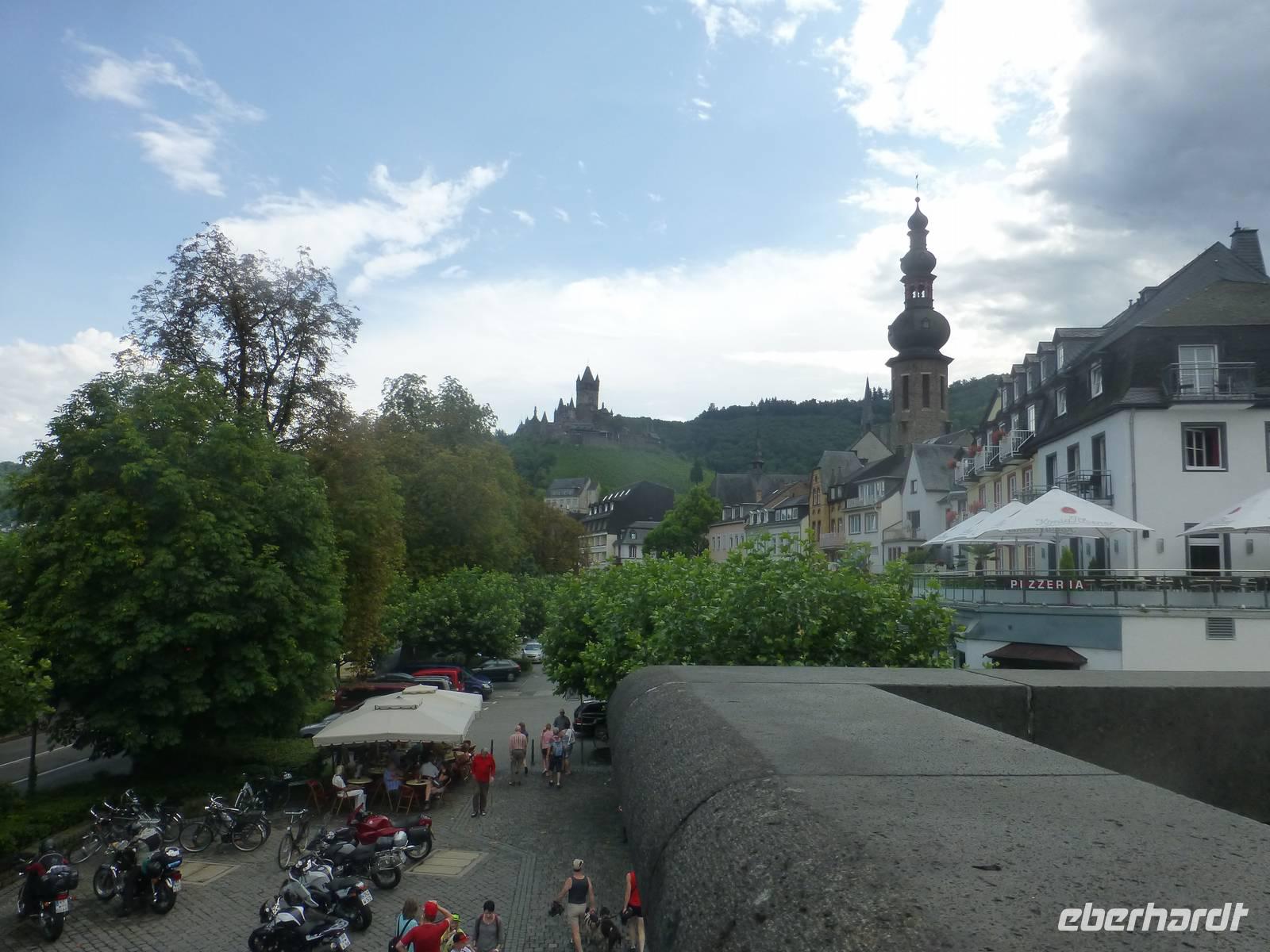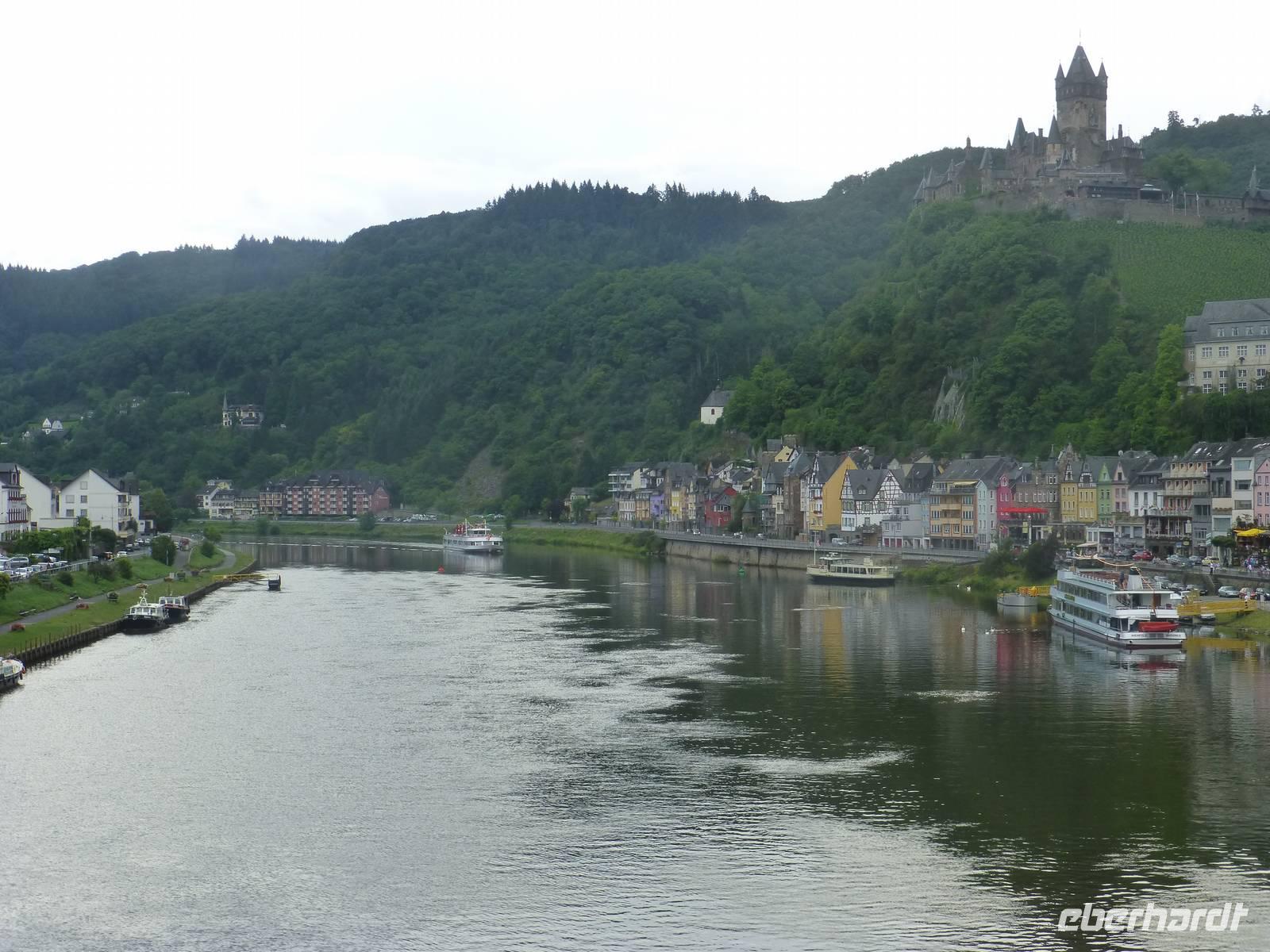 Über die Hunsrücker Höhenstrasse reisen wir heute an die Mosel. Unser erstes Ziel ist die idyllische Weinstadt Bernkastel Kues. Einer Legende nach stammt der Ortsname Bernkastel vom Begriff Bärenkessel. So lässt sich der Bär im Stadtwappen erklären, und im Bärenbrunnen finden wir gleich zwei als Brunnenfigur. Am historischen Marktplatz rund um den St.-Michaels-Brunnen stehen prächtig verzierte Giebelfachwerkhäuser aus dem 16. und 17. Jahrhundert sowie das markante Renaissance-Rathaus. Wir bummeln durch die verwinkelten Gassen des Winzerstädtchens, bevor es mit dem Schiff auf der Mosel weitergeht. Mit der "Europa" reisen wir bei strahlendem Sonnenschein bis Traben-Tarbach. Die Mosel schlängelt sich idyllisch durch weinbewachsene Berghänge. Kaum zu glauben, dass an diesen Steilhängen Wein angebaut werden kann. Plötzlich wieder eine Überraschung: Amphibienfahrzeuge kommen uns in großer Zahl entgegen. Die Eigentümer sind sichtlich stolz auf ihre fahr- und schiffbaren einzigartigen Kreationen. Kommt da ein schwimmender Trabi daher? Wir grüßen und winken und freuen uns an der "Prozession". Von Trabach geht es mit unserem Bus in die kleine, aber feine Stadt Beilstein. Diese ist recht schnell besichtigt, weil sie wirklich winzig ist, und so machen wir uns nach Cochem am Moselbogen auf. Auf den steilen Weinbergen der Umgebung gedeiht ein hervorragender Wein. Ein Weinladen neben dem anderen lädt zum Verkosten und Kaufen ein. Und das Cafe Flair wird von unserem Reiseleiter Volker wärmstens empfohlen. Deshalb begnügen wir uns mit einem Blick auf die mächtige Reichsburg, die stolz über der Stadt thront. Es war auch recht schwülwarm, ein Eis gerade recht. Die Stadt rühmt sich eines Kleinklimas, das 2 bis 3 Grad wärmer ist als anderswo...bis kurz vor Abfahrt ein schweres Gewitter ausbrach. Der Regen erwischte uns etwas heftig, aber die Sachen trockneten schnell wieder im Bus bei der Rückfahrt. Nach diesem erlebnisreichen Tag haben wir uns das deftige und reichhaltige Abendessen im Hotel redlich verdient.