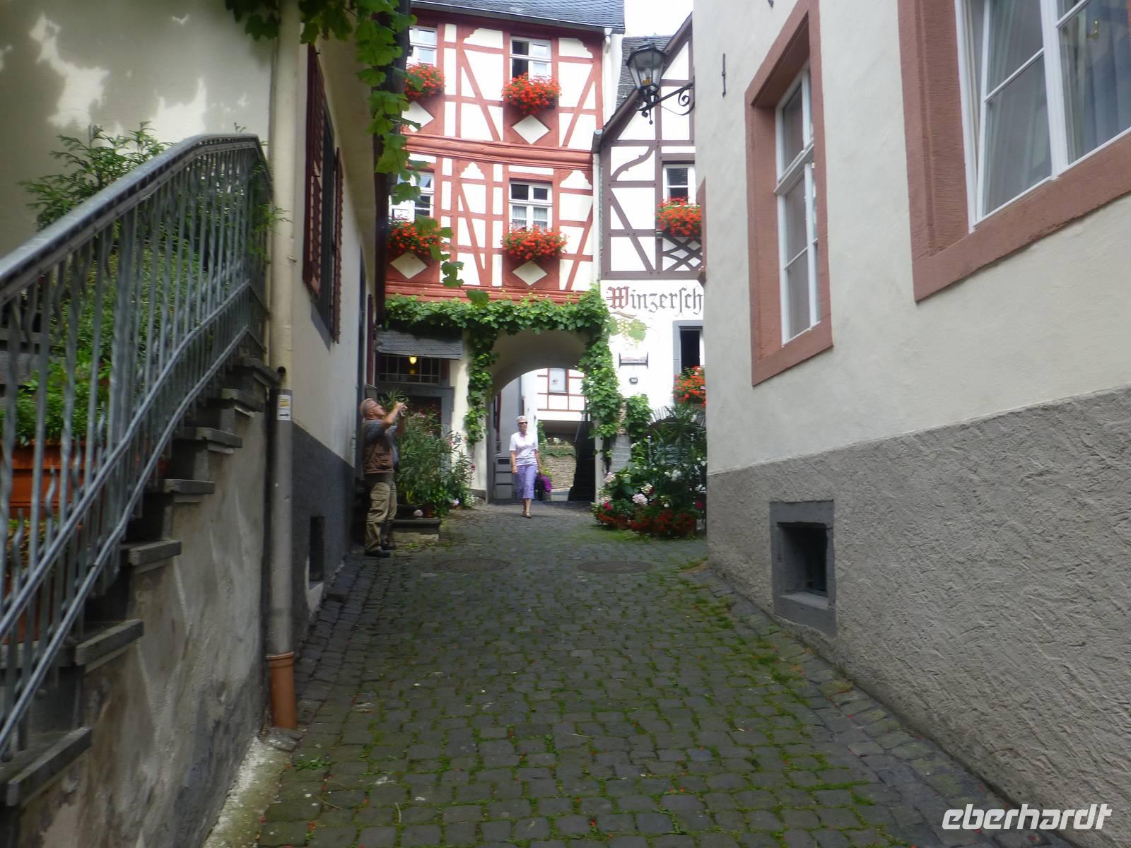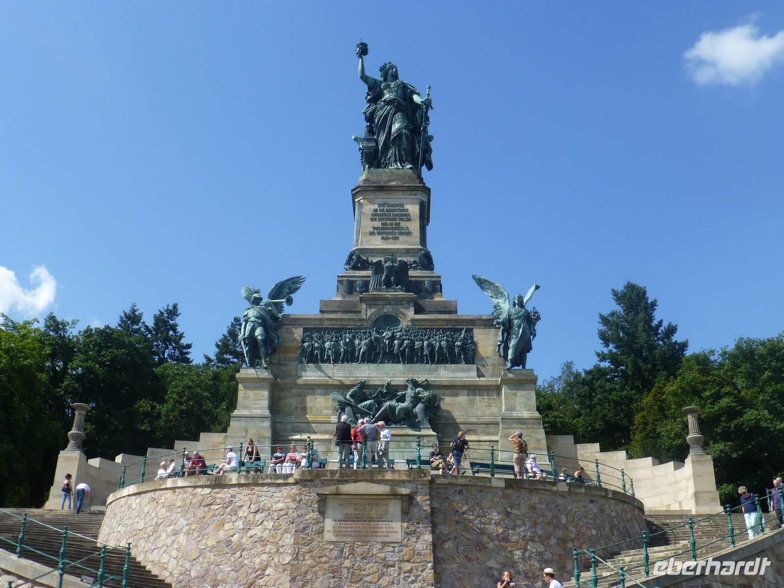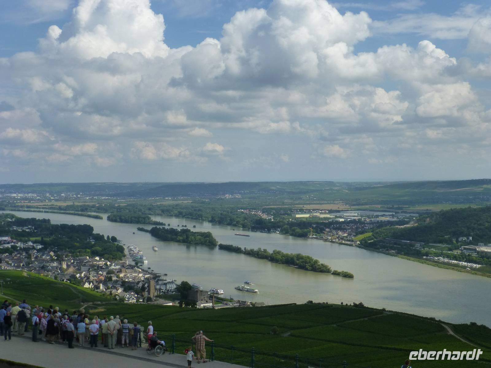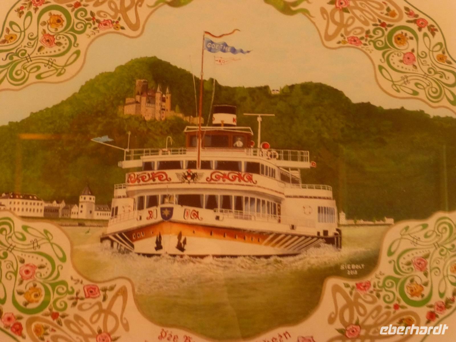 Heute heißt es, etwas zeitiger aufzustehen, denn der Höhepunkt der Reise - unsere Rhein-Schifffahrt - steht bevor. Wir erfreuen uns an der Morgenstimmung mit Frühnebel über dem Hunsrück auf unserer Fahrt nach Koblenz, der Stadt wo die Mosel sich mit dem Rhein vereinigt. Auf beiden Flüssen herrscht ein reger Verkehr an Lastkähnen, welche die verschiedensten Güter transportieren. Am Deutschen Eck, am Zusammenfluß von Rhein und Mosel, steht das national-patriotische Reiterstandbild des deutschen Kaisers Wilhelm I. Ein kurzer Spaziergang führt zur Bootsanlegestelle, wo schon der alte Schaufelraddampfer „Goethe" zur Abfahrt bereit steht, um uns in knapp sechs Stunden Rheinaufwärts nach Assmannshausen zu bringen. Wir empfanden es als angenehm, dass für uns ein Salon reserviert war. So hatten wir einen festen Platz, an dem wir uns immer wieder einfanden, wenn wir vom Schauen müde waren oder hungrig, denn hier wurden Speisen und Getränke serviert, zum Mittagessen waren wir alle im Salon beieinander. Wir befuhren den vielleicht schönsten Teil des Rheins, das zum Weltkulturerbe der UNESCO gehörende Mittel-Rhein-Gebiet. An uns zogen u.a. Schloss Stolzenfels, die Marksburg und die Burgen Katz und Maus vorbei. Bekannte Städte und Orte wie Boppard, St. Goar, St. Goarshausen, Oberwesel, Bacharach wurden von uns passiert. Der von allen Gästen erwarteten Höhepunkt der Schiffsfahrt erwartete uns am Flusskilometer 555. Hier, kurz nach St. Goarshausen, erhebt sich der Loreleyfelsen. Natürlich erschallt aus dem Schiffslautsprecher "Ich weiss nicht, was soll es bedeuten..." und jeder hält Ausschau nach der Jungfrau mit goldenem Kamme und güldenem Haar... nur unser Kapitän schaut auf die Klippen und umschifft alle Untiefen sicher. Weiter ging es vorbei an den sieben Jungfrauen und der Rheininsel Pfalz nach Assmannshausen, das von der Ruine Ehrenfels überragt wird. Mit dem Bus fuhren wir zum Niederwalddenkmal, das 1883 zur Erinnerung an den Deutsch/Französischen Krieg 1870/71 errichtet wurde. In 225 m Höhe über dem Rhein auf den Höhen des Niederwaldes gelegen, steht es mit einer Gesamthöhe von 37,6 m. Die oben darauf stehende „Germania" hat eine Höhe von 11,8 m. Vom Denkmal ereöffnet sich eine fantastische Aussicht auf den Rhein, die Mündung der Nahe und die Umgebung. Das Städtchen Rüdesheim hat einen magischen Klang. Wer hat nicht schon von der Drosselgasse gehört? Am Nachmittag gab es noch einen individuellen Besuch der Drosselgasse in Rüdesheim. Nun wollten wir, leicht ermüdet und voller Erlebnisse des Tages, möglichst schnell heim. Nur gibt es da ein Problem: Zwischen Koblenz und Wiesbaden/Mainz gibt es keine einzige Brücke, so dass man nur mit Fähren das andere Flußufer erreichen kann. Deshalb setzten wir mit der Auto-Fähre nach Bingen über und waren rechtzeitig im Hotel Beck zum Abendessen da. Familie Beck hatte noch eine Überraschung für jeden Gast. Zusätzlich zu netten Abschiedsworten gab es ein Gruppenfoto und eine individuelle Potraitaufnahme für jeden von uns, um die Reise auch fotografisch in Erinnerung zu behalten.
