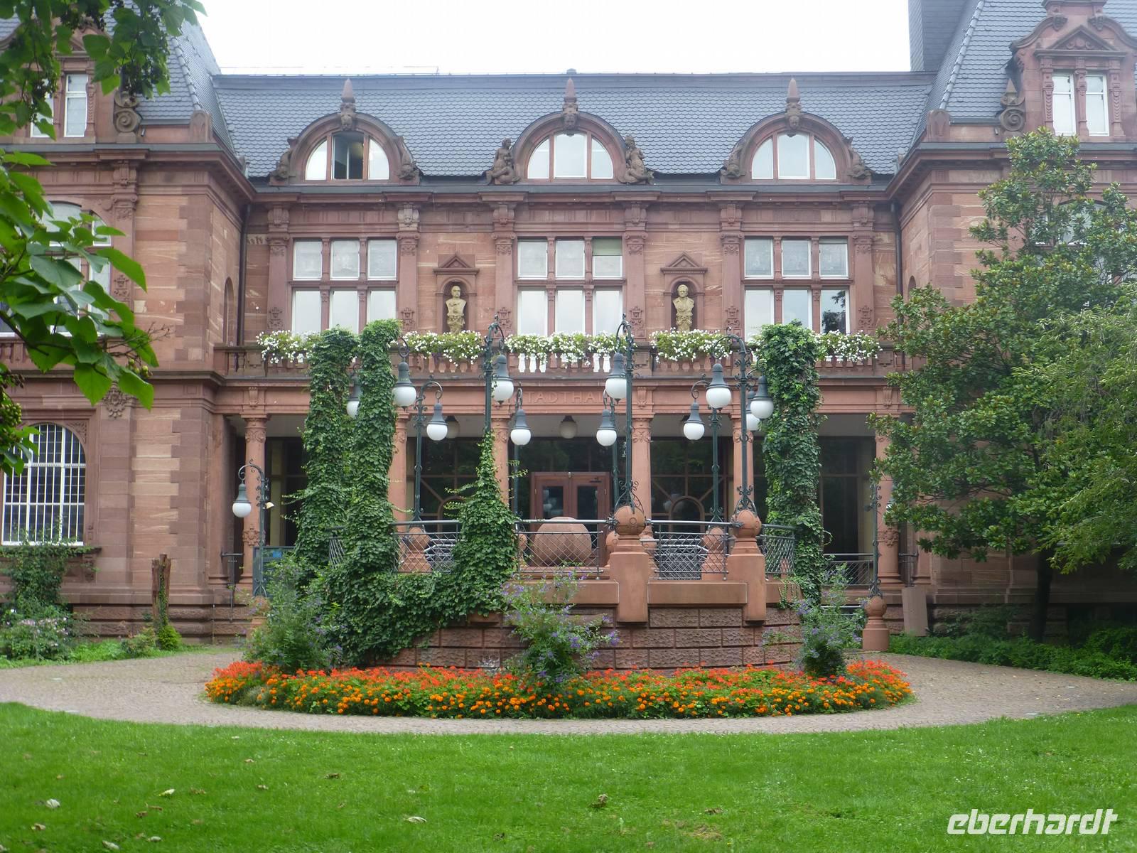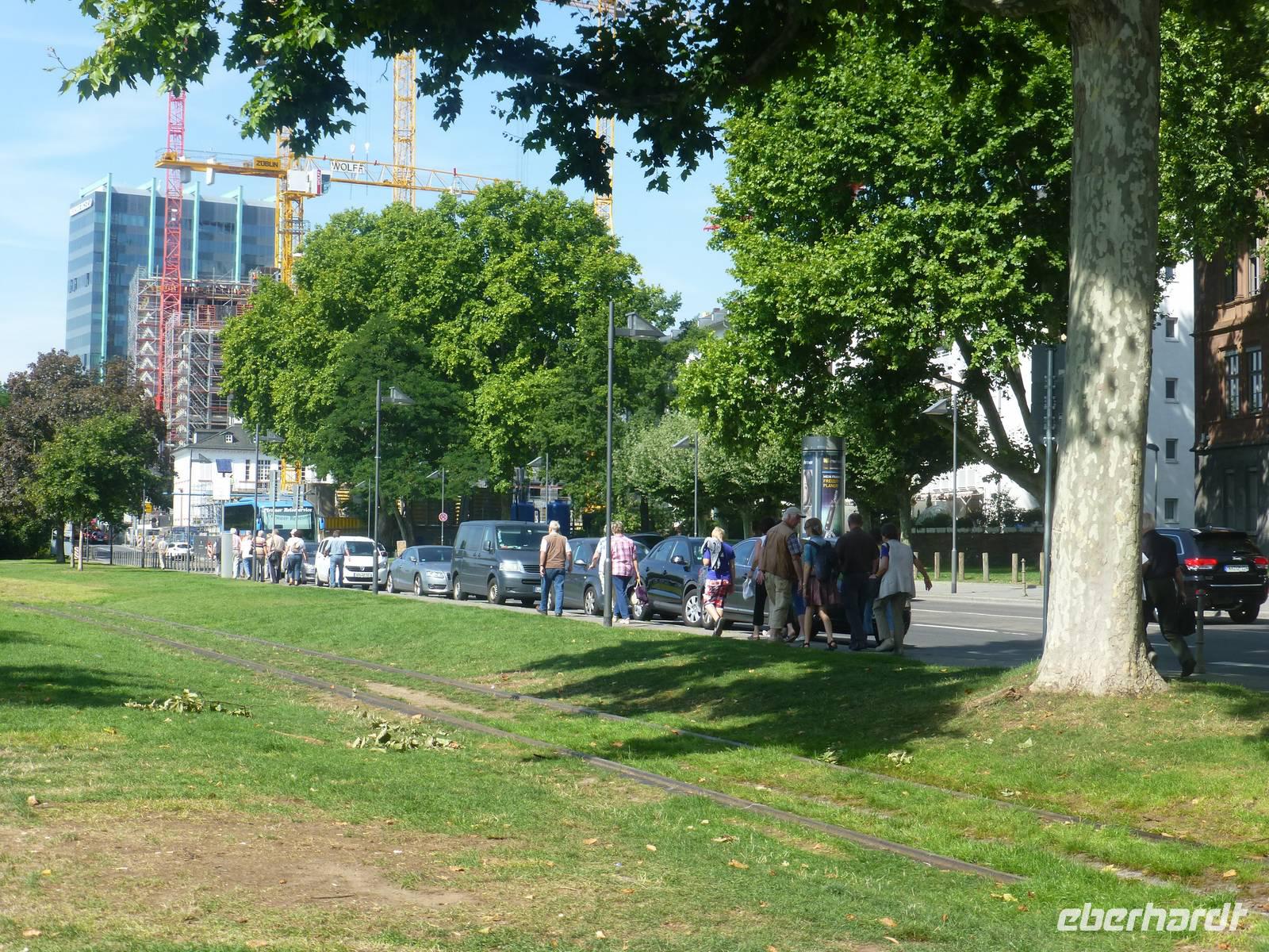 Zügig ging es über die Autobahn Richtung Frankfurt am Main. Nur ein kleines braunes Schild erinnert noch an die Stelle, wo mal eine fast unüberwindbare Grenze war. Unvergessen die Zeiten des Mauerfalls... Kurze Zeit später haben wir das Kirchheimer Dreieck erreicht und legen eine Pause ein. Frieder hatte schon die Wiener und Bockwurst heiß gemacht und die meisten entschieden sich für einen Snack im Bus. Auf der Autobahn war reger Verkehr, aber kein Stau, und so wären wir pünktlich in Frankfurt am Main angekommen. Aber unser Reiseleiter Volker rief an und sagte, da sei an diesem Sonntag kein Durchkommen, denn wegen dem Main-Festival mit Marathon sei die ganze Innenstadt abgeriegelt. Kurzerhand stellten wir das Programm um und entschieden, nach Wiesbaden und Mainz zu fahren. Volker empfing uns in Kurhausnähe und wir machten eine kleine Rundfahrt durch de elegant-vornehmen und gepflegten Ort mit seinen schönen alten Villen im Stil des Historizismus. Die Leute,, die hier bauten, hatten offensichtlich keine Geldsorgen. Beschaulich im Grünen ist jede Villa einzigartig und originell.
