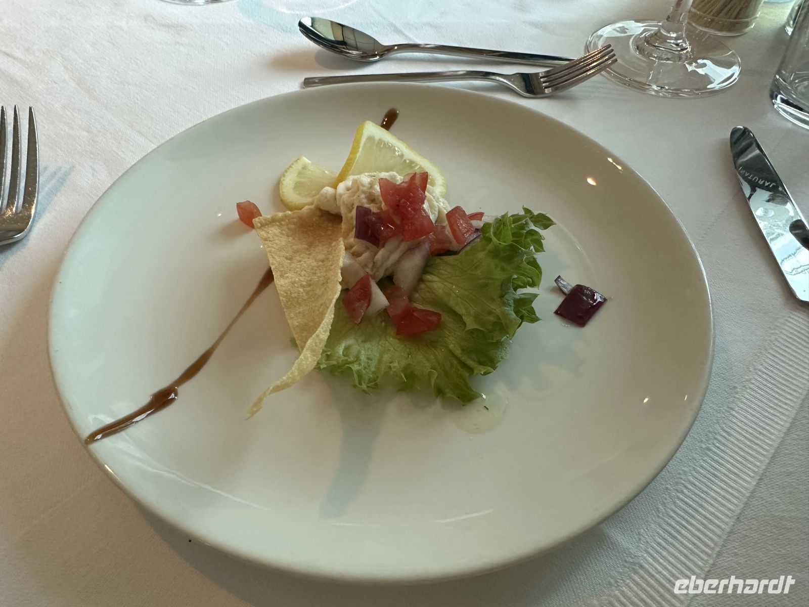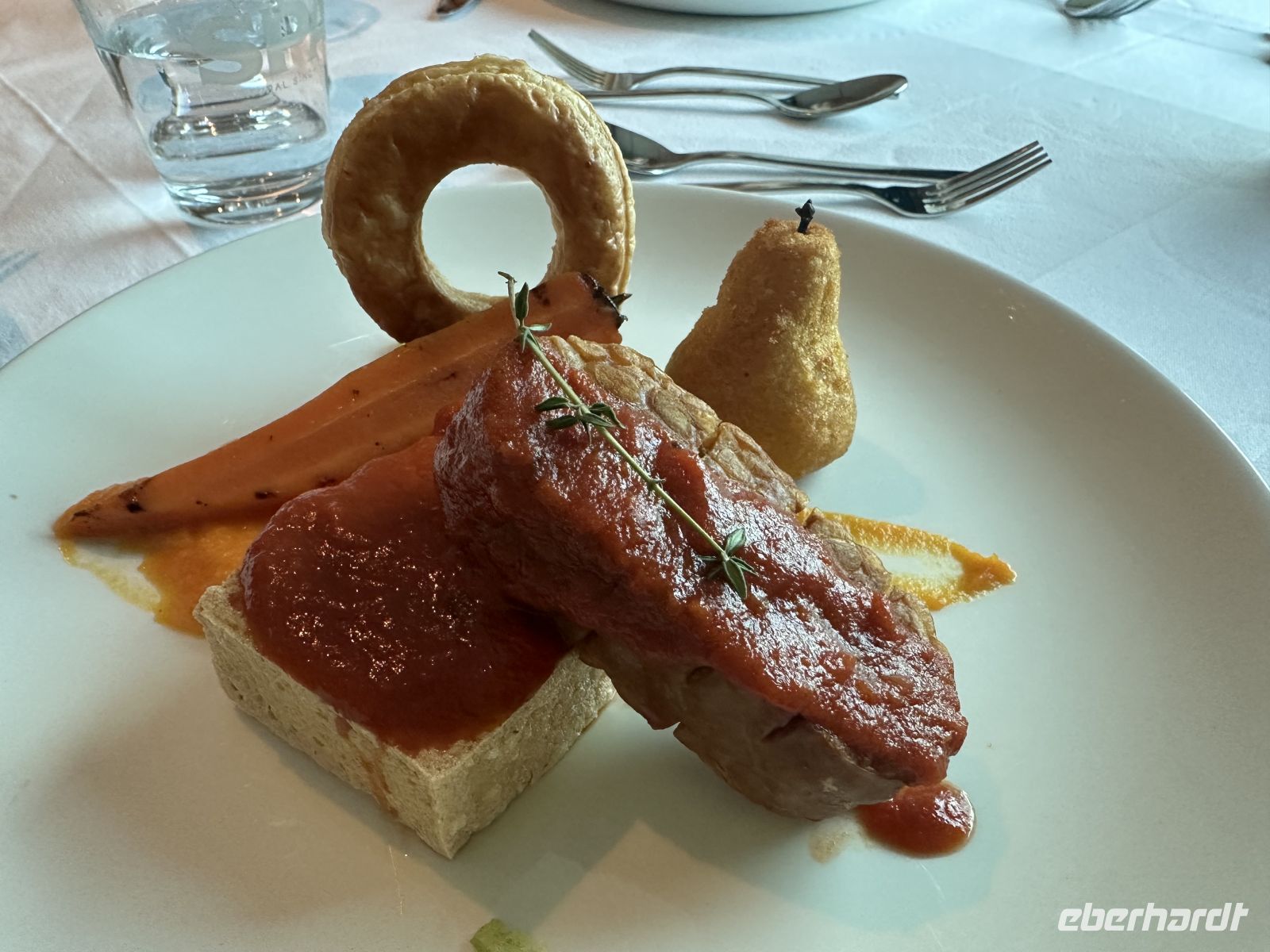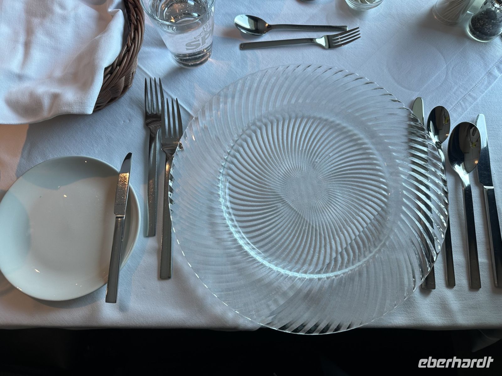 Am Abend sind wir zum Gala Abendessen eingeladen. Mit folgendem Menü werden wir verwöhnt: als Vorspeise gibt es Räucherlachstatar mit Senfcreme, Zitronen-Dill-Vinaigrette und Salat, gefolgt von einer Cappuccino-Suppe mit Waldpilzen. Als Zwischenmahlzeit genießen wir Zitroneneis mit Champagner. Das Hauptgericht darf gewählt werden: entweder Rinderfilet mit Rotweinsauce oder frittierter Tofu mit Bohnenquark und Käsesauce. Zum Abschluss gibt es eine Überraschung: die berühmte Eisparade.
