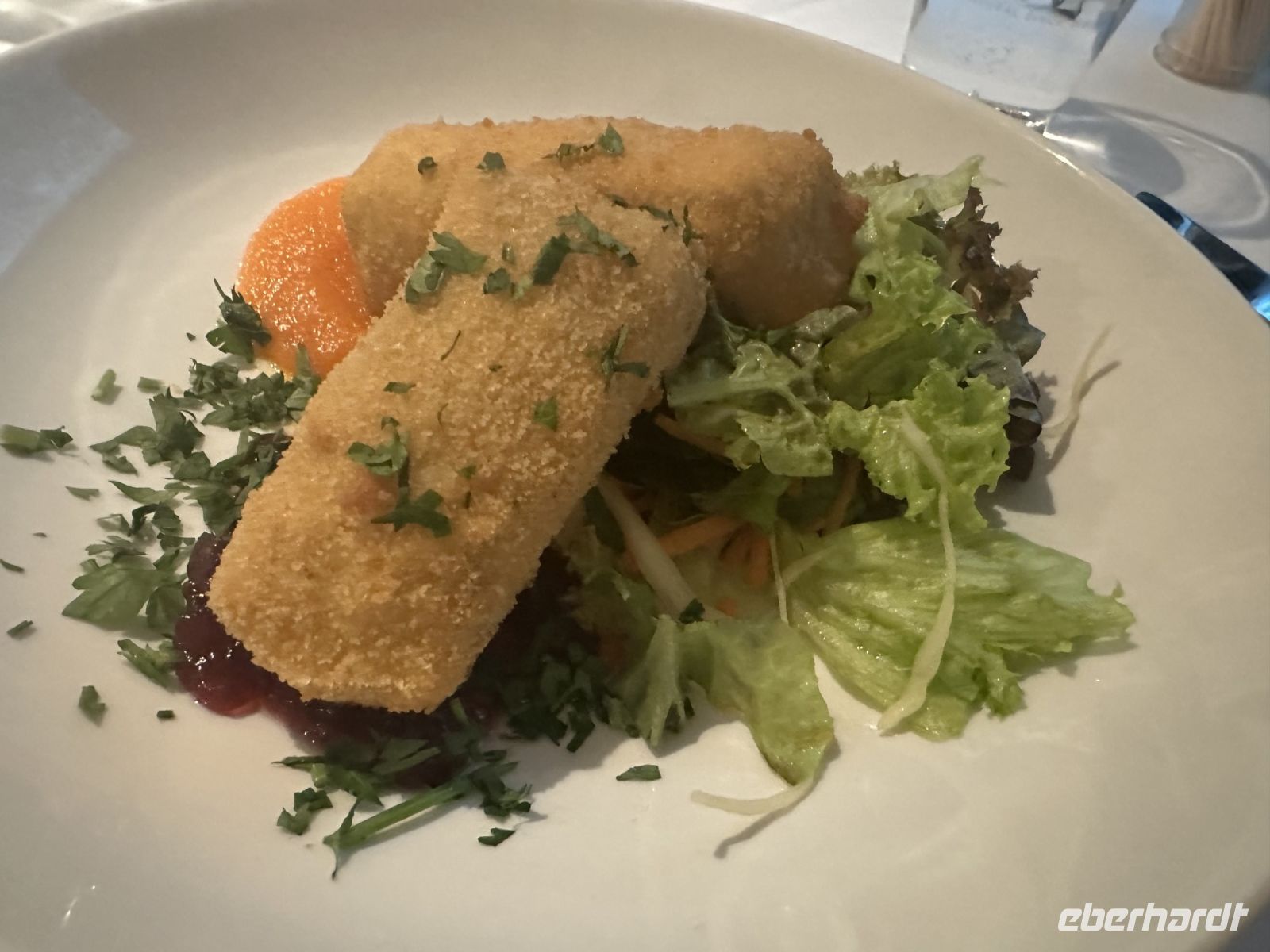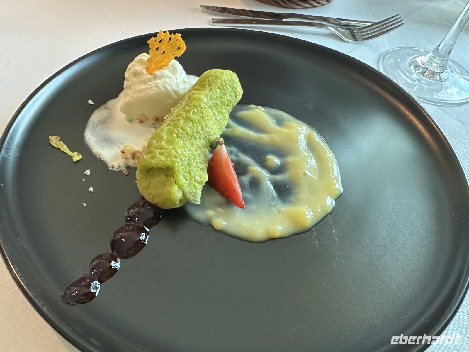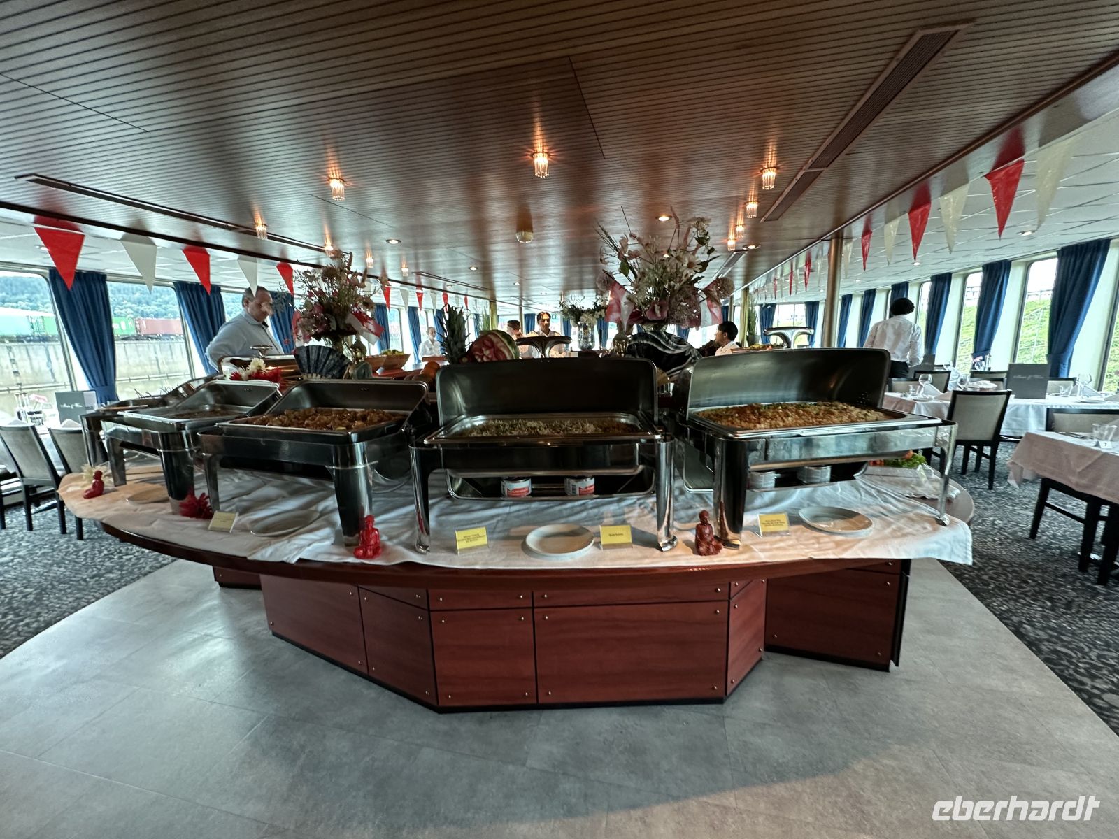 Am Abend sind wir zum Gala Abendessen eingeladen. Mit folgendem Menü werden wir verwöhnt: als Vorspeise gibt es Räucherlachstatar mit Senfcreme, Zitronen-Dill-Vinaigrette und Salat, gefolgt von einer Cappuccino-Suppe mit Waldpilzen. Als Zwischenmahlzeit genießen wir Zitroneneis mit Champagner. Das Hauptgericht darf gewählt werden: entweder Rinderfilet mit Rotweinsauce oder frittierter Tofu mit Bohnenquark und Käsesauce. Zum Abschluss gibt es eine Überraschung: die berühmte Eisparade.