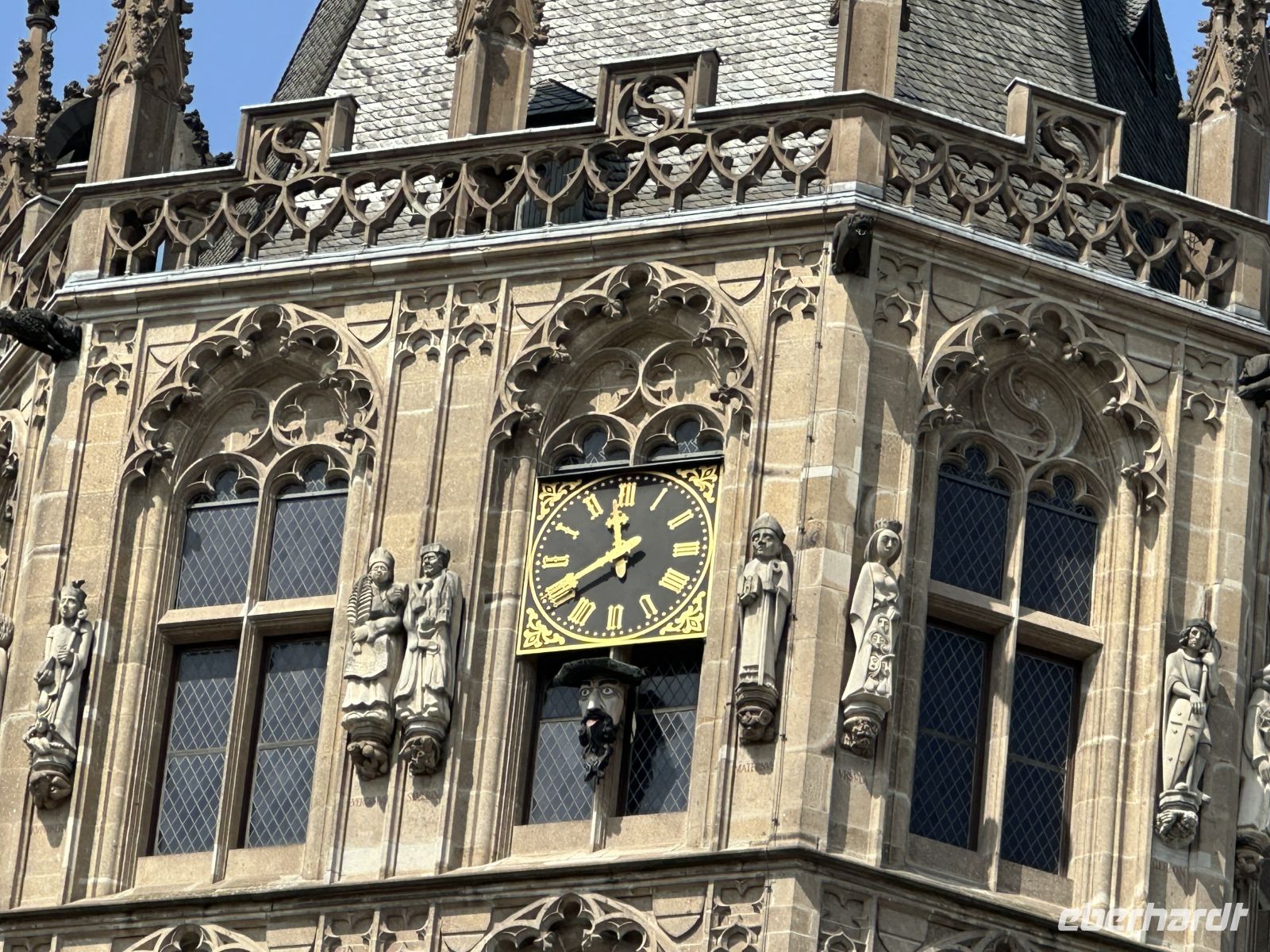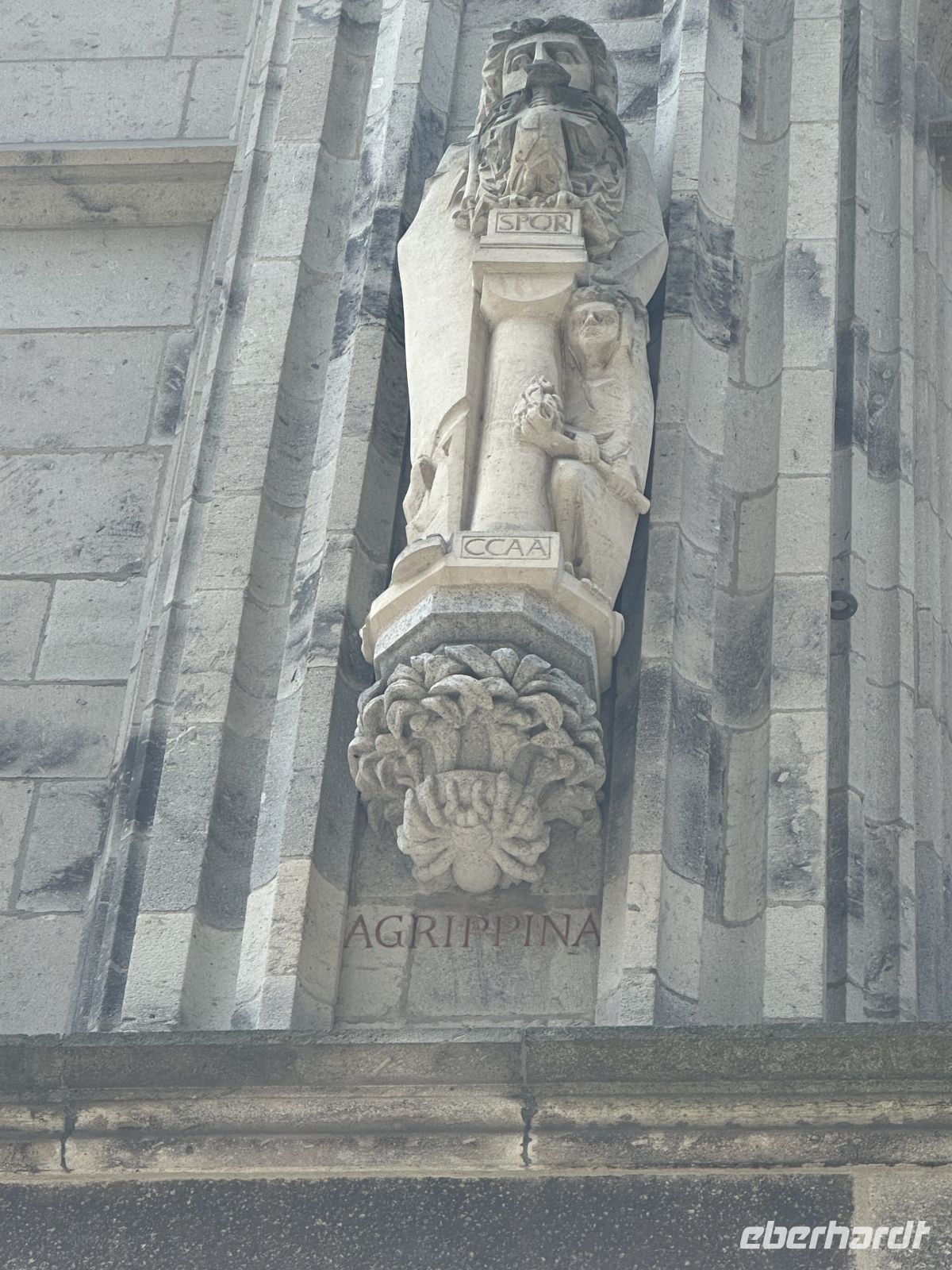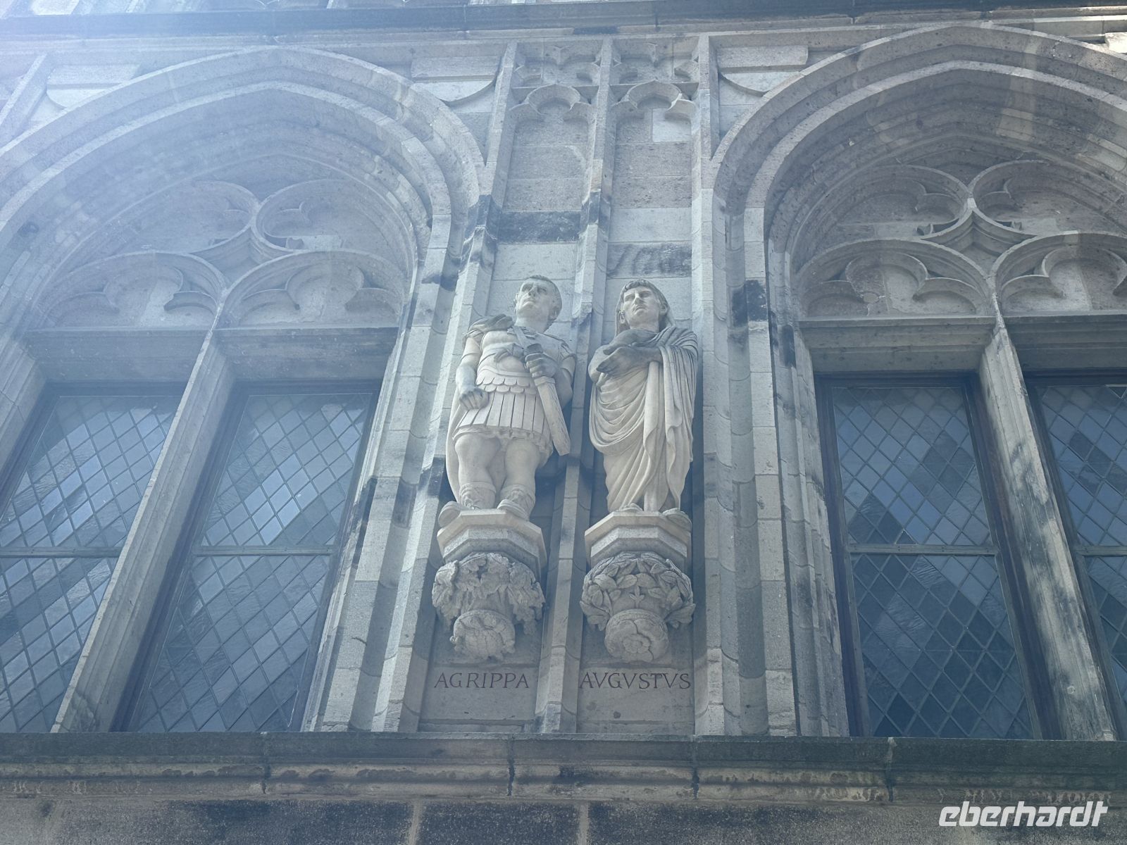 Unser Weg führt uns nun weiter zum historischen Rathaus, einem Gebäudekomplex, der Jahrhunderte Kölner Stadtgeschichte in sich vereint. Besonders bemerkenswert ist der Rathausturm mit seinen zahlreichen Figuren und der berühmten Figur des "Platzjabbeck". Hier, im politischen Zentrum der Stadt, spüren wir den Geist vergangener Zeiten. Kölns Geschichte ist untrennbar mit der römischen Kaiserzeit verbunden. Die Gründung der Stadt geht auf die römische Kaiserin Agrippina die Jüngere zurück. Sie wurde in Köln geboren und setzte sich bei ihrem Mann, Kaiser Claudius, erfolgreich für die Erhebung ihrer Heimatstadt zur römischen Kolonie ein – ein Meilenstein für die Entwicklung Kölns. Später war es Kaiser Augustus, der durch seine Verwaltungsreformen die Grundlagen für die florierende römische Provinz Germanien legte, zu der Köln gehörte. Diese römischen Wurzeln sind bis heute im Stadtbild und im Namen Kölns, abgeleitet von "Colonia", spürbar. Vom Rathaus schlendern wir weiter zum angrenzenden alten Markt. Dieser lebendige Platz, umrahmt von historischen Giebelhäusern und gesäumt von Restaurants und Brauhäusern, ist seit jeher das pulsierende Herz Kölns. Hier herrschte einst reges Markttreiben, und noch heute ist er ein beliebter Treffpunkt für Einheimische und Besuche. Bevor wir unseren Rundgang beenden, machen wir einen kurzen Abstecher zu zwei weiteren kölschen Originalen: den Skulpturen von Tünnes und Schäl. Diese beiden Figuren, Tünnes als der verschmitzte und gutmütige Kölner und Schäl als sein kritischer und eher naiver Gegenpart, verkörpern den kölschen Humor und die rheinische Mentalität auf einzigartige Weise. Sie sind ein beliebtes Fotomotiv und ein Symbol für die Seele der Stadt. Unser Rundgang findet seinen Abschluss am sonnigen Rheinufer. Von hier aus haben wir einen wunderschönen Blick auf den Fluss, der die Stadt prägt, und auf die gegenüberliegende Seite mit der Hohenzollernbrücke. Von hier aus sind es nur noch etwa 15 Minuten Fußweg zurück zu unserem Schiff. Pünktlich zum Mittagessen sind wir wieder an Bord.