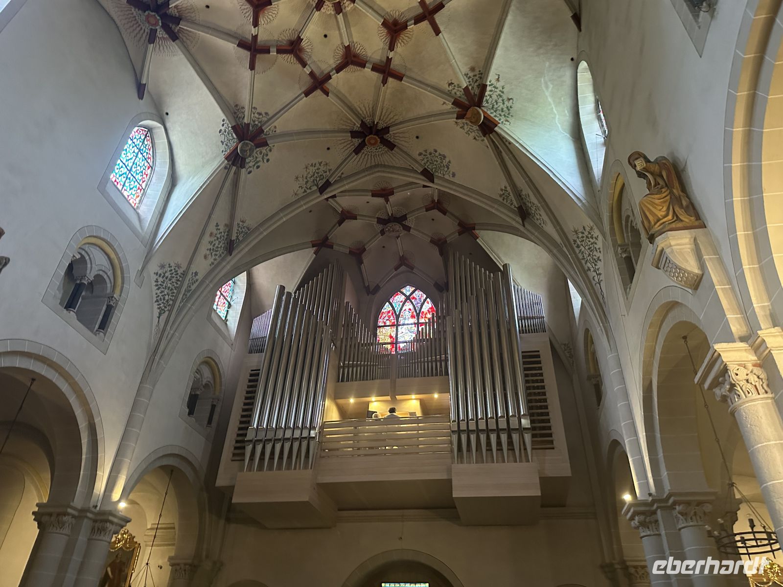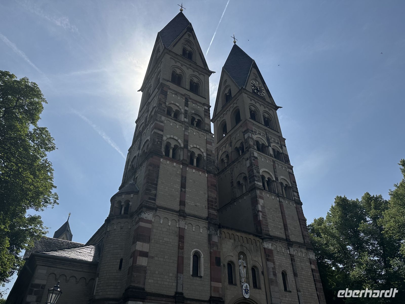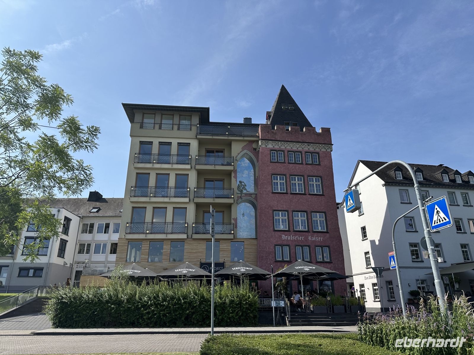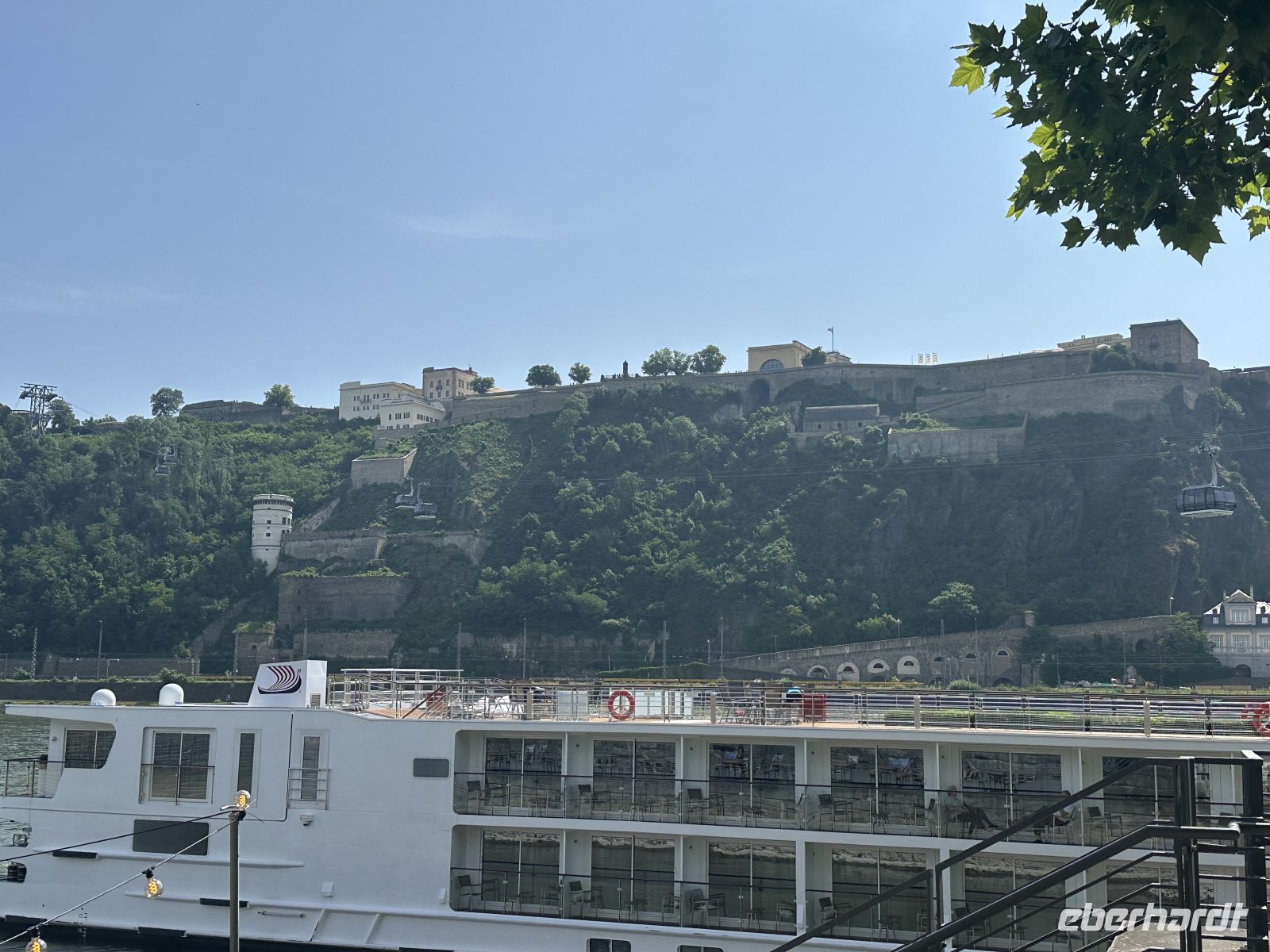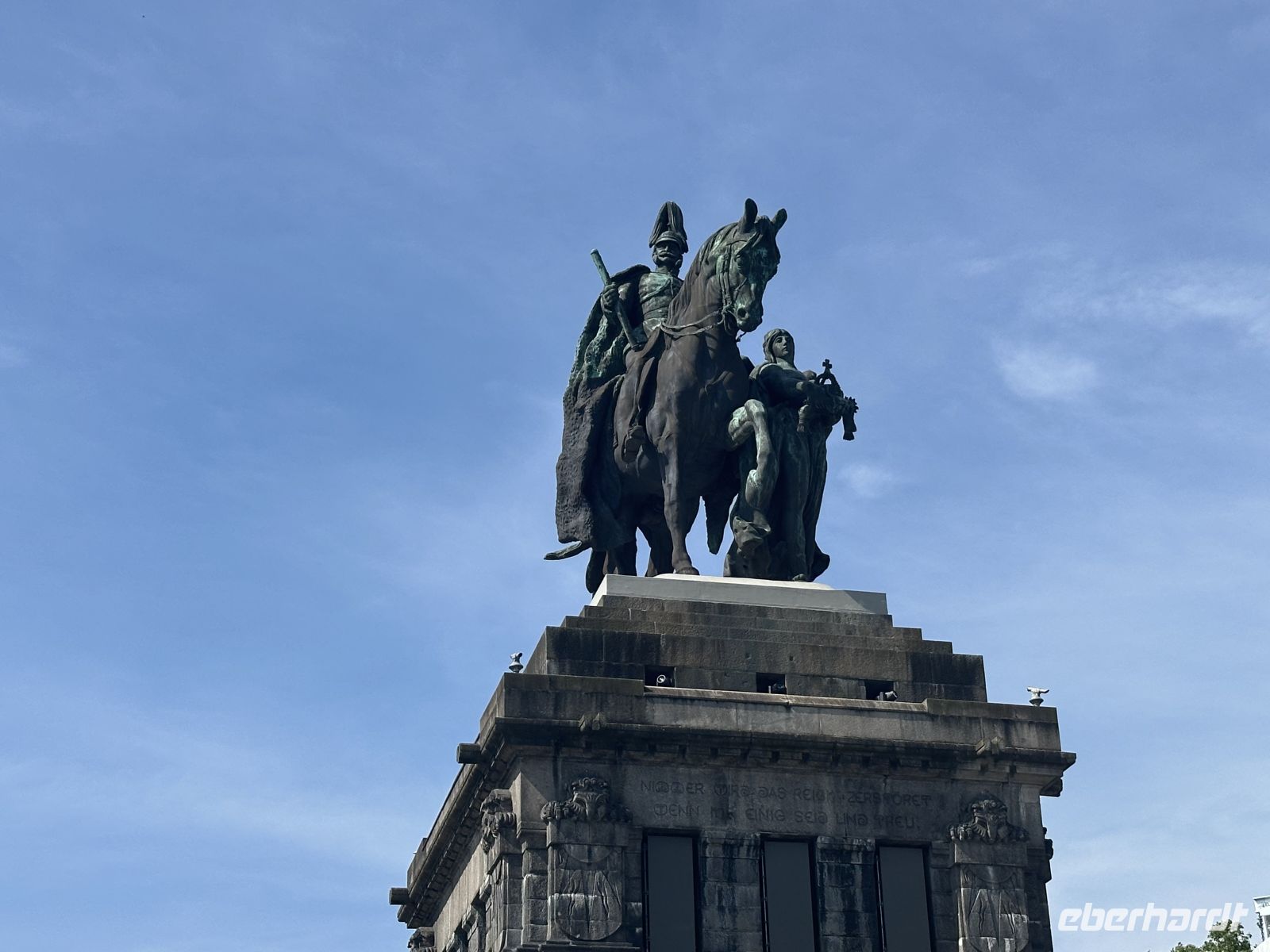 Die Sonne strahlt bereits kräftig, als wir um 10 Uhr vormittags unseren Rundgang durch Koblenz beginnen. Wir stehen direkt vor dem ältesten Wohnhaus der Stadt, dem romanischen Haus. Wir spazieren zum Deutschen Eck, eine der bekanntesten Sehenswürdigkeiten Deutschlands und ein Ort von großer historischer Bedeutung. Es markiert den Zusammenfluss von Rhein und Mosel und ist insbesondere durch das monumentale Kaiser-Wilhelm-Denkmal geprägt. Wir erfahren durch unsere ortskundige Stadtführerin, dass die Bezeichnung "Deutsches Eck" auf den Deutschen Orden zurück geht, der sich hier bereits im 13. Jahrhundert ansiedelte. Wir erreichen das Kaiser-Wilhelm-Denkmal, das am 31. August 1897 eingeweiht wurde. Rund um das Denkmal gibt es viele Geschichten, von seiner Zerstörung und dem gestohlenen Kopf bis zum Wiederaufbau 1993, finanziert von einem privaten Spender. Die Gesamthöhe des Denkmals beträgt 37 bis 44 Meter (je nach Quelle), wobei allein das Reiterstandbild des Kaisers auf einem Pferd 14 Meter misst und über 40 Tonnen wiegt. Es zeigt Wilhelm I. in Generalsuniform, begleitet von einer Figur, welche die Kaiserkrone trägt. Nur wenige Schritte vom Deutschen Eck entfernt kommen wir zur Basilika St. Kastor. Die Basilika St. Kastor in Koblenz ist nicht nur die älteste erhaltene Kirche der Stadt, sondern auch ein herausragendes Beispiel romanischer Baukunst am Mittelrhein. Ihre lange Geschichte, die bis ins 9. Jahrhundert zurückreicht, und ihre reiche Ausstattung machen sie zu einem besonderen Ort. Beim Betreten der Kirche umfängt uns sofort eine angenehme Kühle, aber nicht die erwartete Stille, denn ein Organist probt mit einem Schüler und die Orgel dröhnt recht schief in den Ohren. Nach dem Kirchenbesuch ziehen wir weiter in das Herz der Altstadt zum Jesuitenplatz. Das ehemalige Jesuitenkolleg, das dem Platz seinen Namen gibt, ist ein imposanter Bau, der heute das Rathaus beherbergt. Das Leben in diesem Gebäude sorgte dafür, dass mehr als drei Viertel der Einwohner von Koblenz bereits zu damaliger Zeit lesen und schreiben konnten, sowohl Männer als auch Frauen. Wir durchqueren ein Tor zum sogenannten Schängelbrunnen. Schängeln ist das Koblenzer Wort für Jungen, und der Brunnen, der einen Wasser spuckenden Jungen darstellt, ist ein beliebtes Wahrzeichen der Stadt. Die engen Gassen, die wir nun durchstreifen, sind geprägt von individuellen Geschäften, Weinstuben und traditionellen Restaurants. Nun ist es langsam Zeit zum Schiff zurückzukehren, denn die Sonne brennt schon kräftig und das Mittagessen ruft.