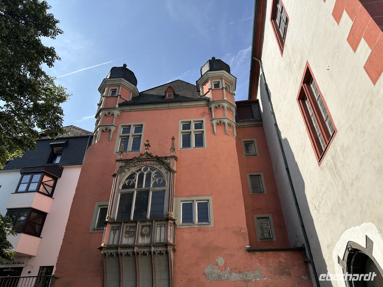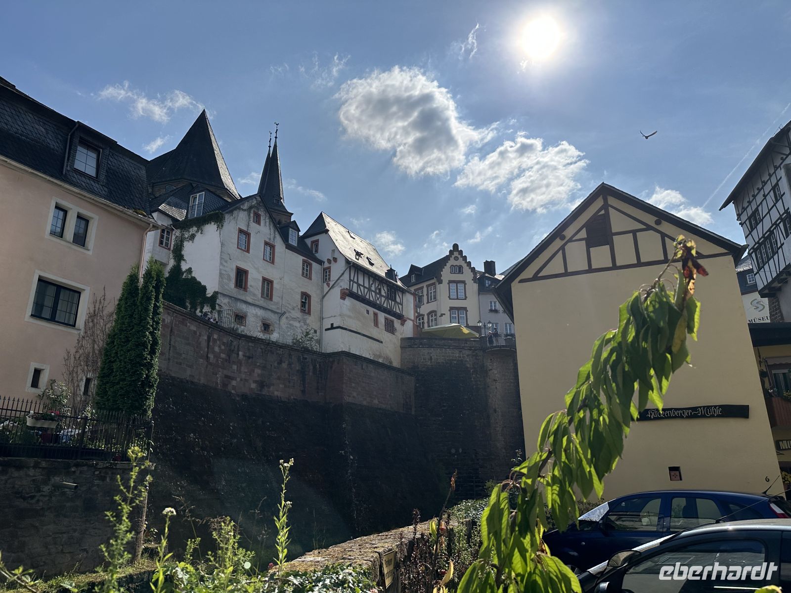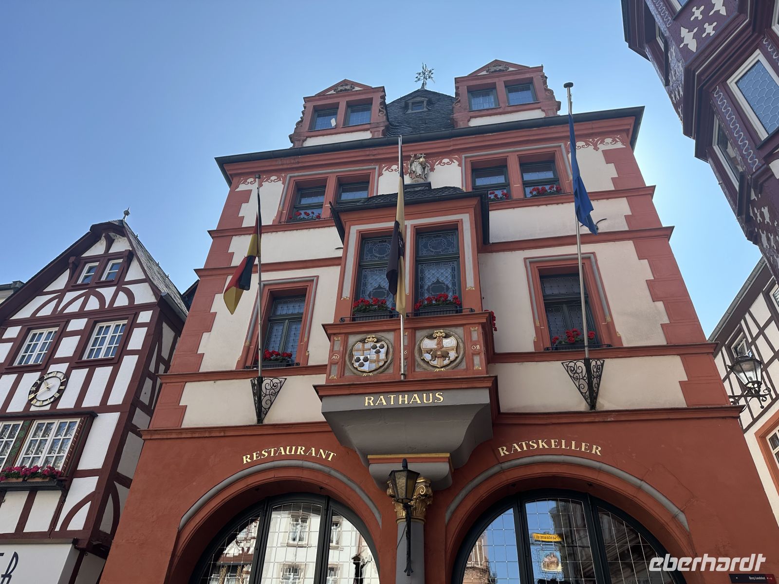 Unsere Stadtbesichtigung von Bernkastel-Kues beginnt direkt an der Anlegestelle. Ausgangspunkt ist der Alte Moselbahnhof, einst ein geschäftiger Bahnhof, der das malerische „Saufbähnchen“ empfing – eine Bahnlinie, die von Trier nach Bullay führte und berühmt dafür war, dass Reisende unterwegs gerne ein Glas Wein tranken, um die Fahrt zu „verschönern“. Heute steht er als charmantes Restaurant und Terrassencafé da und bietet „Genuss am Fluss“ und Apfelkuchen aus geklauten Äpfeln. Während wir vom Moselufer aufbrechen, fällt unser Blick auf die majestätische Burg Landshut, eine mittelalterliche Burgruine, die auf einem etwa 60 Meter hohen Felsvorsprung über Bernkastel-Kues thront. Die Burg diente einst hauptsächlich als militärische Festung und Residenz für mächtige Persönlichkeiten. 1692 wurde sie durch einen Brand zerstört. Hier, innerhalb der Mauern der Burg Landshut, hat eine der berühmtesten Legenden Bernkastels ihren Ursprung, die die Burg direkt mit dem bekanntesten Wein der Stadt verbindet. Im 14. Jahrhundert wurde der Trierer Kurfürst Boemund II., während seines Aufenthalts auf der Burg schwer fieberkrank und wurde auf wundersame Weise geheilt, nachdem er Wein vom nahegelegenen Weinberg getrunken hatte. Diese fesselnde Geschichte hat zur Namensgebung des legendären „Bernkasteler Doctor“-Weins geführt. Wir spazieren weiter zum mittelalterlichen Marktplatz. Auf der einen Seite des Platzes befindet sich das beeindruckende Renaissance-Rathaus, ein Zeugnis des früheren Wohlstands und des bürgerlichen Stolzes Bernkastels, erbaut im Jahr 1608.