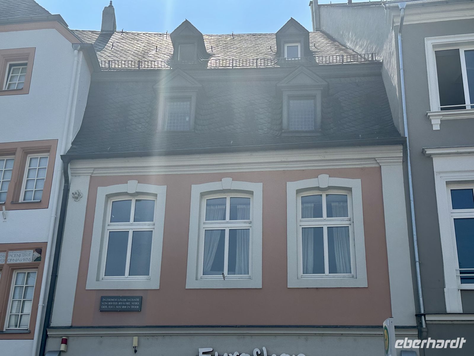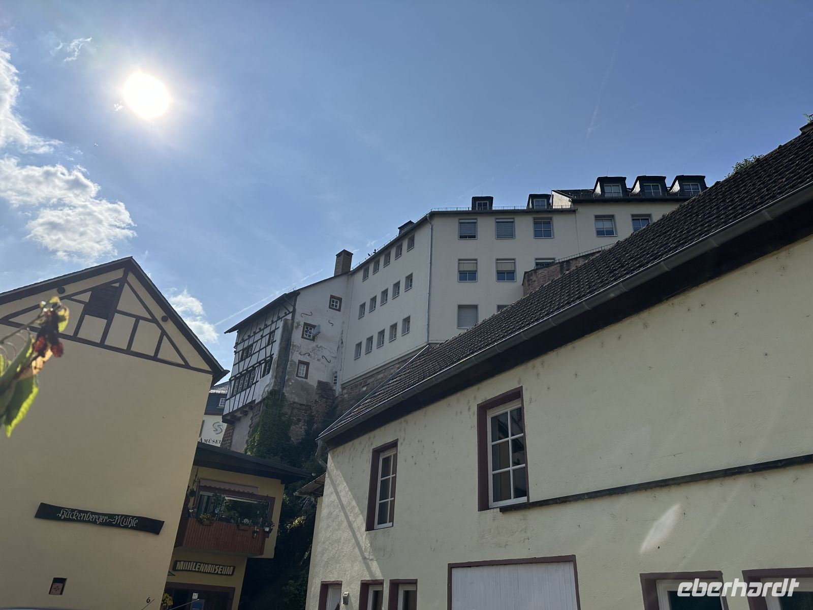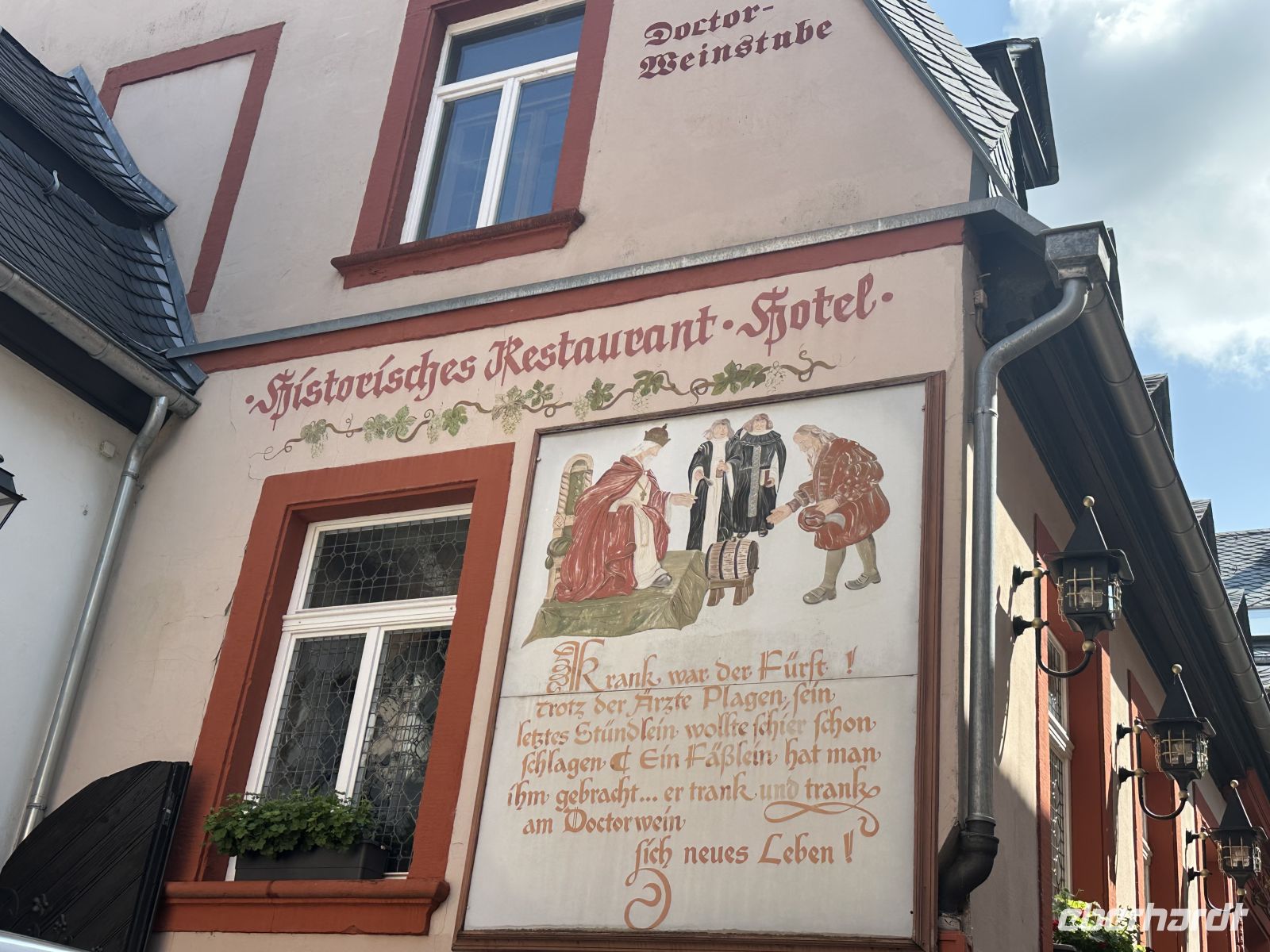 Unsere Stadtbesichtigung von Bernkastel-Kues beginnt direkt an der Anlegestelle. Ausgangspunkt ist der Alte Moselbahnhof, einst ein geschäftiger Bahnhof, der das malerische „Saufbähnchen“ empfing – eine Bahnlinie, die von Trier nach Bullay führte und berühmt dafür war, dass Reisende unterwegs gerne ein Glas Wein tranken, um die Fahrt zu „verschönern“. Heute steht er als charmantes Restaurant und Terrassencafé da und bietet „Genuss am Fluss“ und Apfelkuchen aus geklauten Äpfeln. Während wir vom Moselufer aufbrechen, fällt unser Blick auf die majestätische Burg Landshut, eine mittelalterliche Burgruine, die auf einem etwa 60 Meter hohen Felsvorsprung über Bernkastel-Kues thront. Die Burg diente einst hauptsächlich als militärische Festung und Residenz für mächtige Persönlichkeiten. 1692 wurde sie durch einen Brand zerstört. Hier, innerhalb der Mauern der Burg Landshut, hat eine der berühmtesten Legenden Bernkastels ihren Ursprung, die die Burg direkt mit dem bekanntesten Wein der Stadt verbindet. Im 14. Jahrhundert wurde der Trierer Kurfürst Boemund II., während seines Aufenthalts auf der Burg schwer fieberkrank und wurde auf wundersame Weise geheilt, nachdem er Wein vom nahegelegenen Weinberg getrunken hatte. Diese fesselnde Geschichte hat zur Namensgebung des legendären „Bernkasteler Doctor“-Weins geführt. Wir spazieren weiter zum mittelalterlichen Marktplatz. Auf der einen Seite des Platzes befindet sich das beeindruckende Renaissance-Rathaus, ein Zeugnis des früheren Wohlstands und des bürgerlichen Stolzes Bernkastels, erbaut im Jahr 1608.