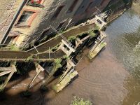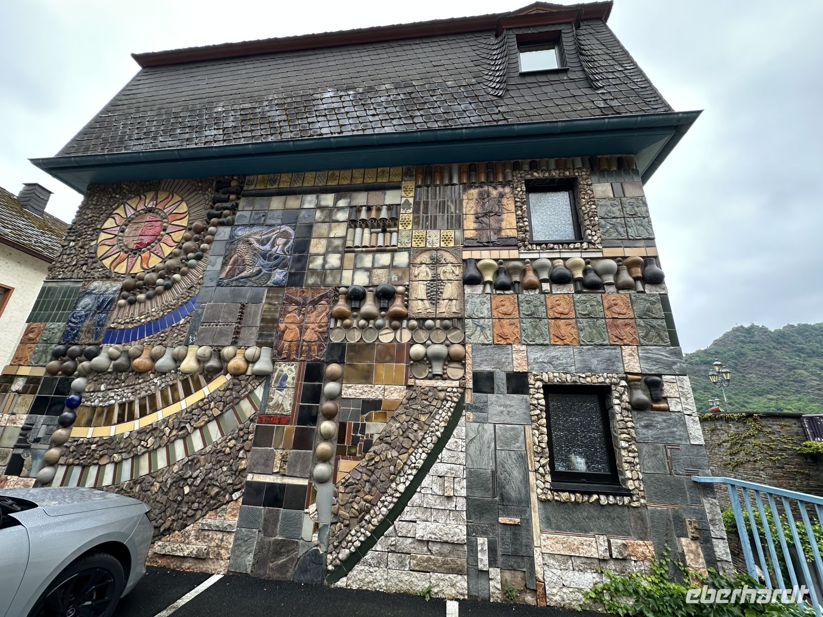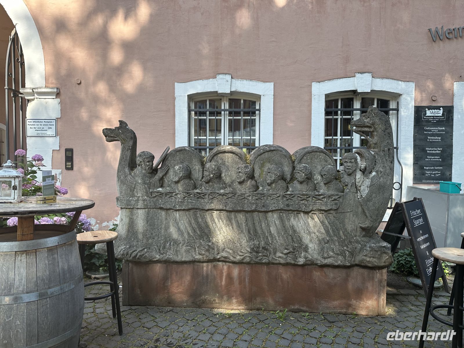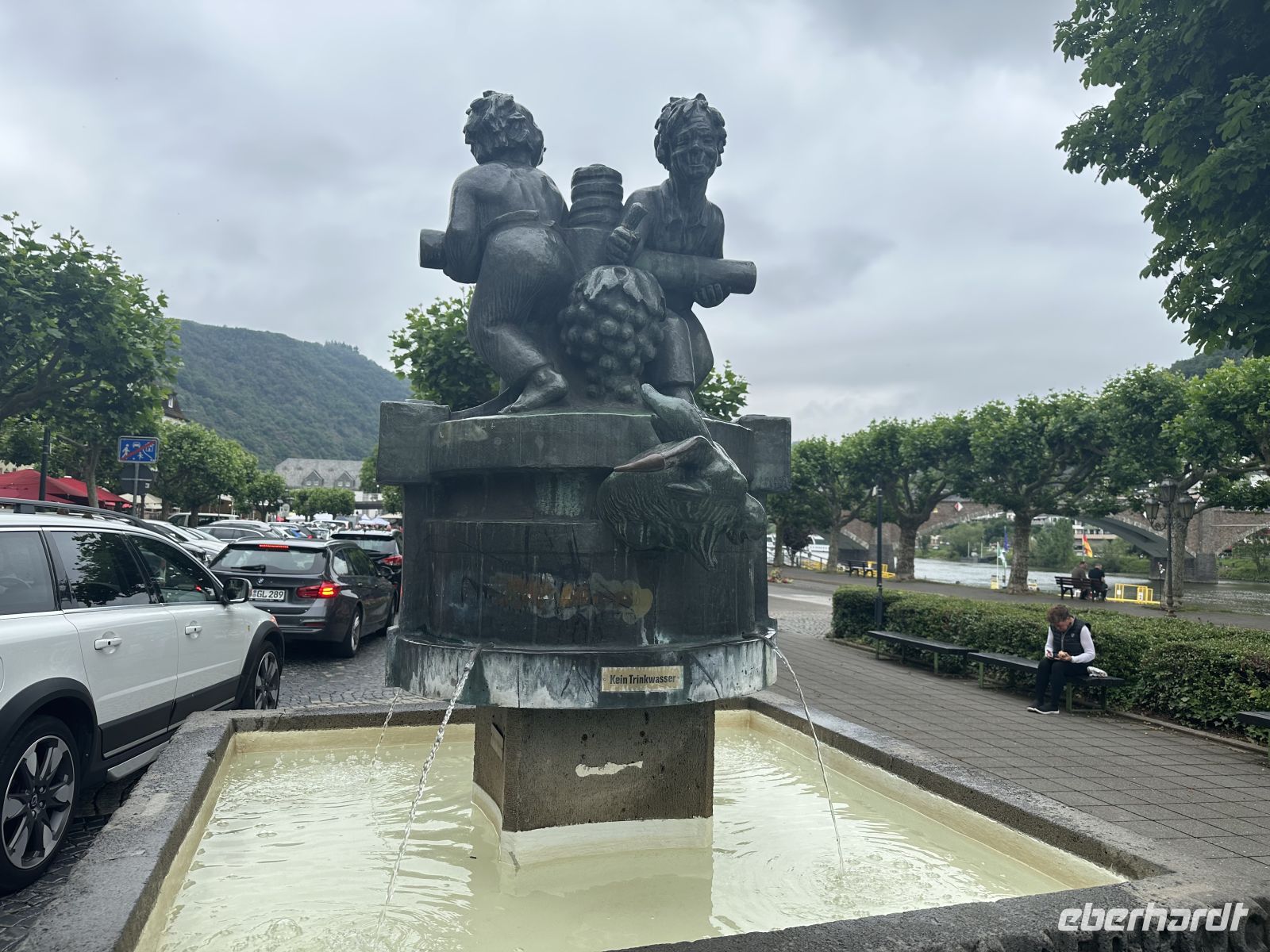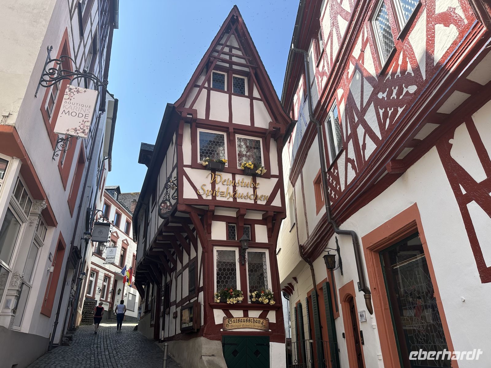 Um den St. Michaelsbrunnen aus dem Jahr 1606 stehen einige wunderschön erhaltene Giebelfachwerkhäuser aus dem 17. Jahrhundert. Nur einen Steinwurf vom Marktplatz entfernt zieht das skurrile Spitzhäuschen unweigerlich unsere Blicke auf sich. Erbaut im Jahr 1416, ist dieses schmale, hoch aufragende Fachwerkhaus mit seinem markanten spitzen Dachgiebel nicht nur eines der ältesten Bauwerke, sondern auch eines der meistfotografierten in der gesamten Region. Unser Stadtführer berichtet, dass genau dieses Haus als Inspiration für die Unterkunft des Zauberstabmachers Mykew Gregorovich in „Harry Potter und die Heiligtümer des Todes – Teil 1“ diente, was natürlich zu einer hohen Anziehungskraft für jüngere Besucher führte. Unser Spaziergang führt uns weiter durch die Altstadt zum Bärenbrunnen. Eingeweiht im Jahr 1968, zeigt dieses volkstümliche Kunstwerk zwei lebensgroße Bronzebären, die kraftvoll die stolzen Wappentiere von Bernkastel-Kues symbolisieren. Dieser Brunnen ersetzte einen älteren „Rauschepütz“ (historische Bezeichnung für einen Ziehbrunnen) aus dem Jahr 1899, dessen ursprüngliche Bärenfigur heute einen nahegelegenen Balkon schmückt und den wir ebenfalls entdecken. Nach dieser interessanten und auch lustigen Stadtführung gespickt mit vielen Geschichten aus der Geschichte verabschiedet sich Stadtführer Willi von uns und wir haben noch ein bisschen Zeit, durch die Gassen zu schlendern, Postkarten und Souvenire zu kaufen oder in ein Café einzukehren. Pünktlich zum Mittagessen sind wir wieder an Bord.