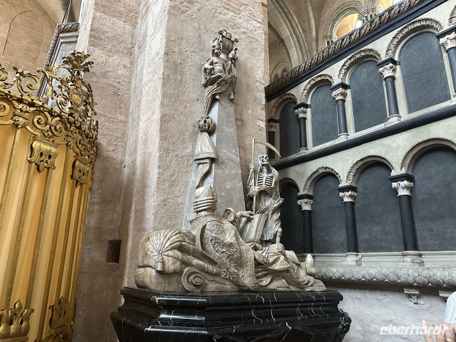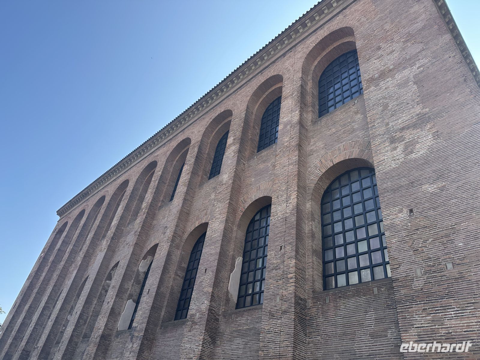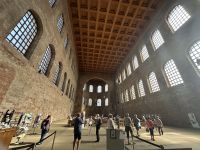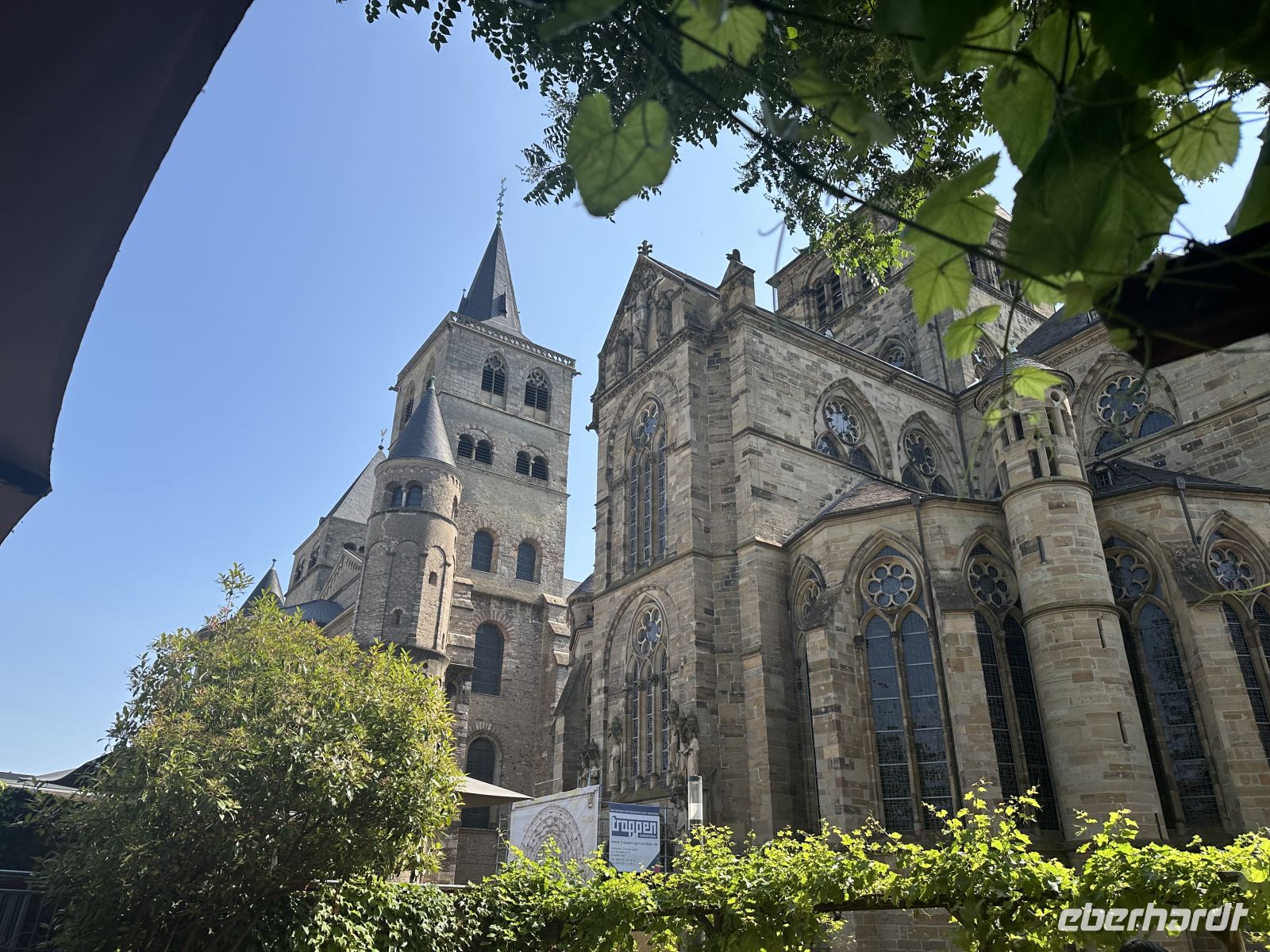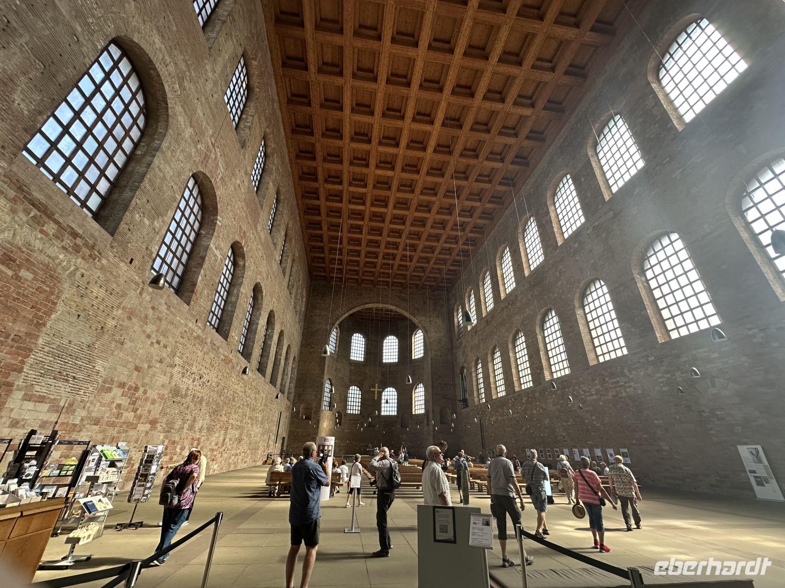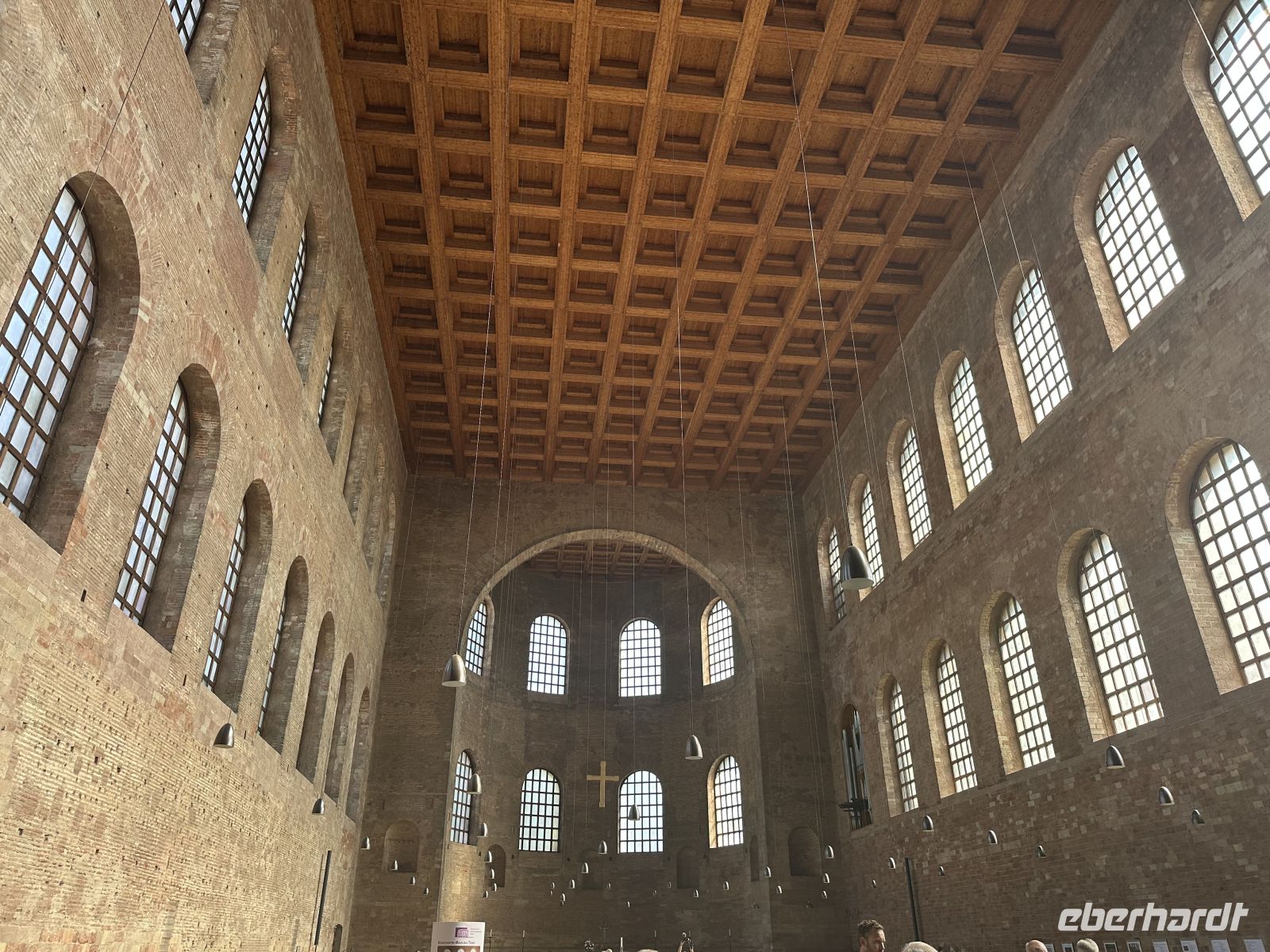 Unser Spaziergang beginnt an der majestätischen Konstantinbasilika. Schon von außen beeindruckt die Größe der mächtigen, aber schlichten römischen Architektur. Unsere Stadtführerin nimmt sich die Zeit, mit uns in die Basilika hineinzugehen. Der Raum, den wir betreten ist etwa 67 Meter lang 27,5 Meter breit und 33 Meter hoch. Und das Erstaunliche daran ist, dass dieser gewaltige Raum komplett ohne stützende Säulen im Inneren auskommt. Das ist einzigartig für ein Bauwerk dieser Dimension aus der Antike. Gewöhnlich wurden so große Hallen in römischer Zeit oder später im Mittelalter und der Renaissance durch Reihen von Säulen in mehrere Schiffe unterteilt, um das Gewicht der Decke oder des Daches zu tragen. Die Konstantinbasilika hingegen ist ein einziger, ungeteilter Saal! Wir erfahren, was diese Säulenfreiheit so besonders macht. Die fehlenden Säulen sind kein Zufall, sondern eine bewusste architektonische Entscheidung. Kaiser Konstantin wollte mit diesem Bauwerk seine unumschränkte Macht und Größe demonstrieren. Ein einziger, gewaltiger Raum ohne Unterbrechungen symbolisierte die Einheit und Stärke des Reiches unter seiner Herrschaft. Jeder, der den Thronsaal betrat, sollte von der Dimension und der uneingeschränkten Sicht auf den Kaiser überwältigt werden. Nur wenige Schritte von der Basilika entfernt erreichen wir den imposanten Trierer Dom St. Peter. Dieser ist die älteste Bischofskirche Deutschlands. Beeindruckend sind der hohe Altarraum, die kostbaren Reliquien und die kunstvollen Grabmäler. Einzigartig, aber leider versperrt ist die Heilig-Rock-Kapelle. Die Heilig-Rock-Kapelle im Trierer Dom ist ein ganz besonderer Ort, denn sie beherbergt die bedeutendste Reliquie des Doms und eine der wichtigsten der gesamten Christenheit: den Heiligen Rock.