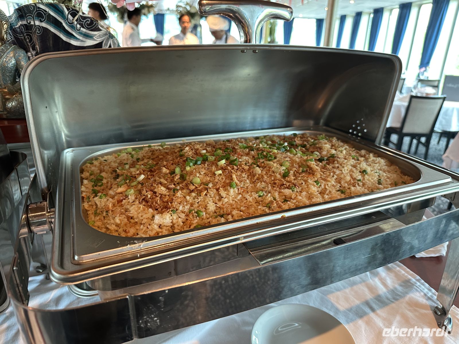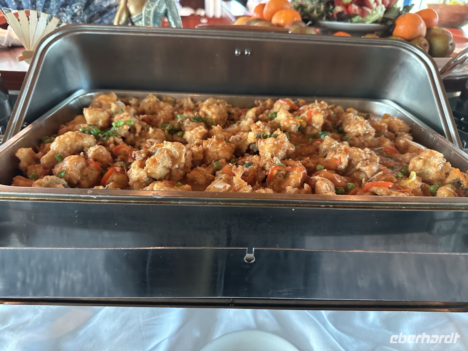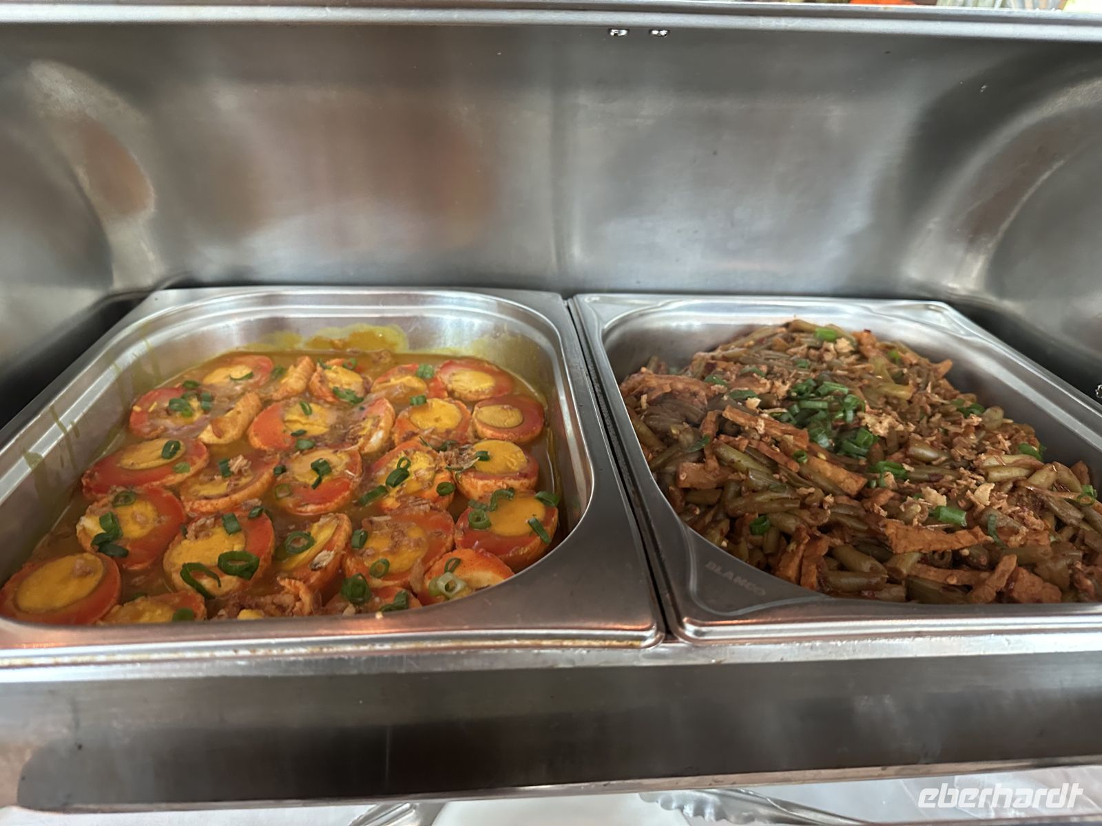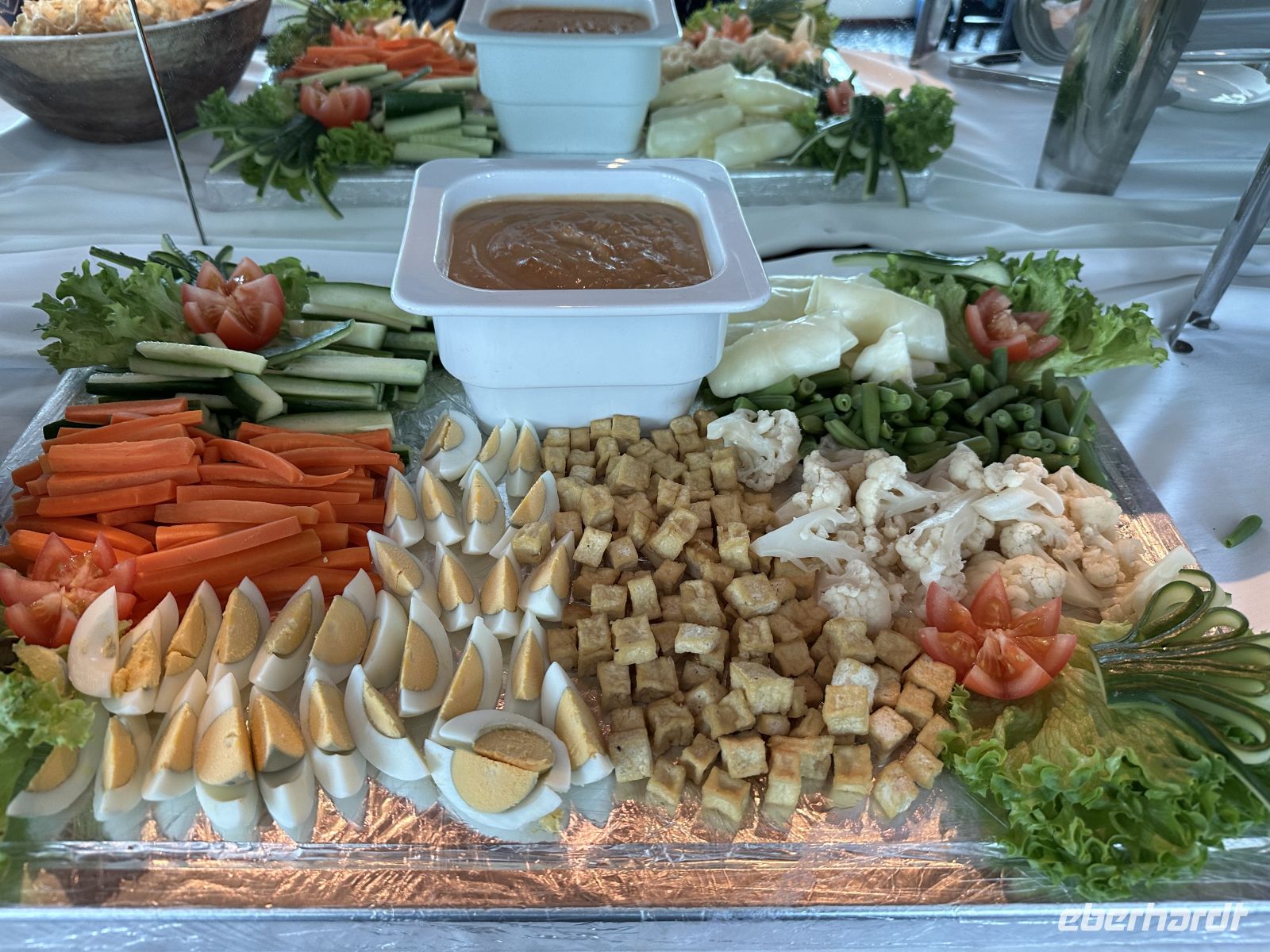 Am Abend werden wir zu einem indonesischen Buffet eingeladen. Es gibt Nasi Goreng - gebratenen Reis garniert mit frischen Frühlingszwiebeln und Röstzwiebeln, Fleisch und Tofu in süß-saurer Soße - ein indonesisches Schmorgericht, Satay - in Form von Spießen mit Erdnusssoße und noch vieles mehr. Das Buffet ist einladend gestaltet und verführt uns dazu sowohl die frischen als auch die herzhaften Gerichte zu genießen.
