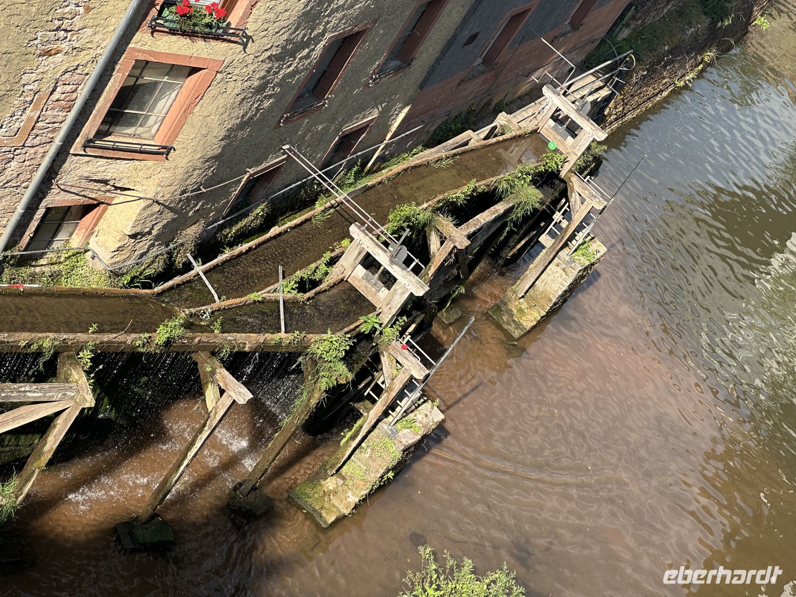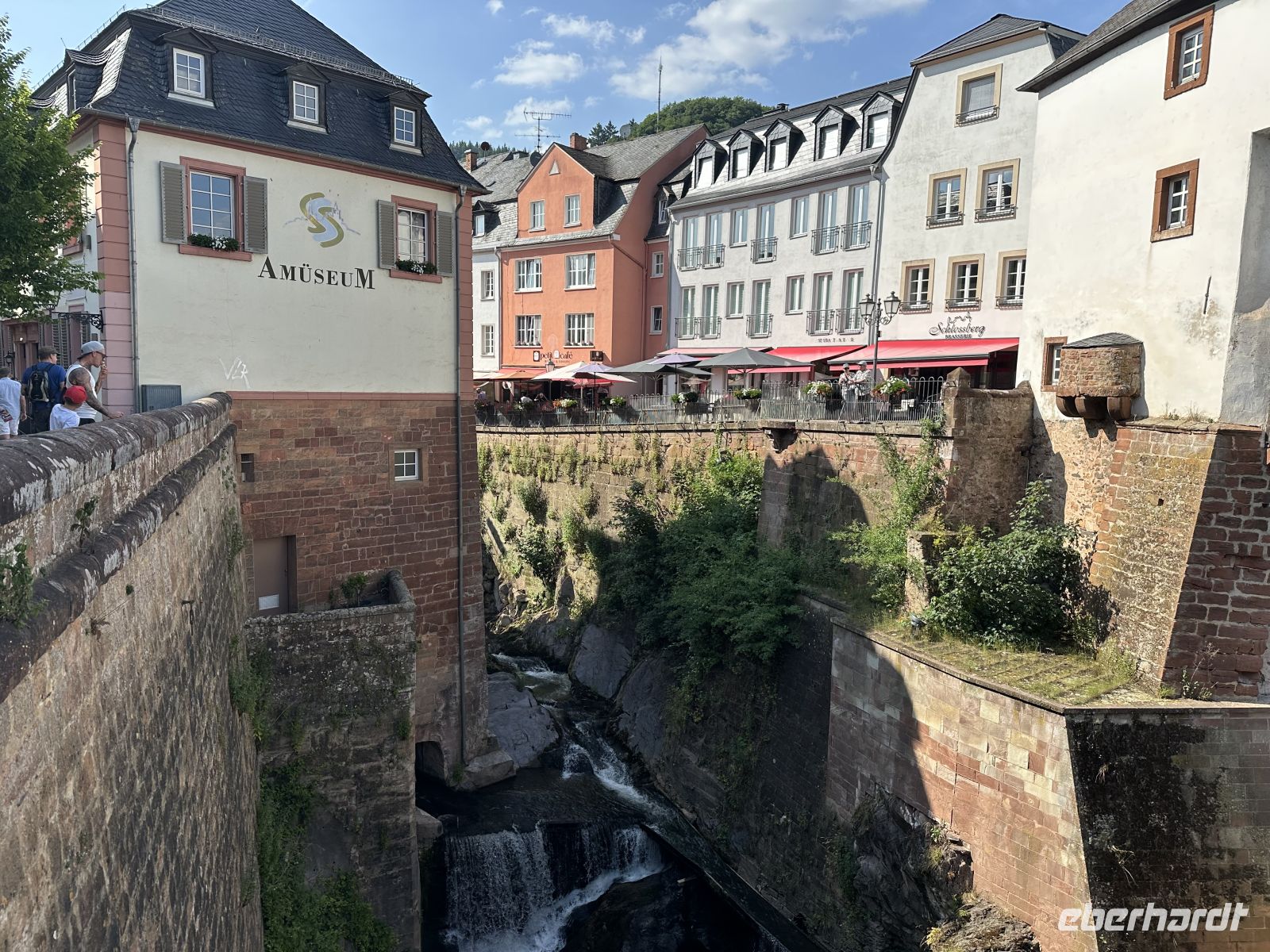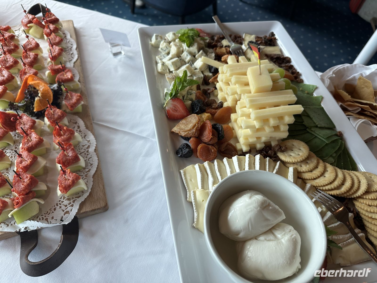 Nachmittags erwartet uns ein genussvolles Arrangement. In der Lounge findet eine exquisite Weinverkostung statt. Neben den guten Weinen, die für uns bereit stehen, gibt es auch eine Fülle von Appetithäppchen. Kleine Sandwiches sind mit deutschen Fähnchen dekoriert - eine Hommage der Crew an die deutschen Gäste. Die Sandwiches sind aus hellem und dunklen Brot und belegt mit verschiedenen Zutaten. Außerdem gibt es eine große Käseplatte. Unterschiedliche Käsesorten stehen zur Auswahl, begleitet von Trockenfrüchten wie Aprikosen und Rosinen und Crackern. Es gibt Obst, ein Schälchen mit Oliven, eine Aufschnittplatte mit leckerem Schinken, also alles was das Kreuzfahrerherz begehrt. So verbringen wir den Nachmittag in einer perfekten Kombination aus Geselligkeit und Genuss. Noch vor dem Abendessen erreichen wir Saarburg. Es bleibt Zeit für einen individuellen Spaziergang. Auf dem Weg in die malerische Altstadt kommen wir am Stadtwappen vorbei. Es zeigt die stolze Saar-Burg, die der Stadt ihren Namen gab. Seit etwa 600 Jahren befindet diese sich auch als Symbol auf dem Stadtsiegel und zeigt somit die historische Bedeutung der Burg. Unterhalb der Burg befindet sich das Mühlenmuseum. Es schließt um 17 Uhr, aber der Museumsführer, der gerade dabei ist, die Tür abzuschließen, lässt sich mit Freude darauf ein, uns etwas über seine Stadt zu erzählen. Als wir später über eine Brücke Richtung Altstadt laufen, können wir von oben die alten Mühlräder sehen, die sich unermüdlich im Wasser des Leukbachs drehen. Dieser Fluss bildet mitten in der Stadt einen beeindruckenden Wasserfall und mündet dann in die Saar. Das Stadtzentrum ist beliebt und belebt, Geschäfte laden zum Stöbern und Cafés zum einkehren ein. Ein schöner Abschluss eines wunderschönen Urlaubstages.