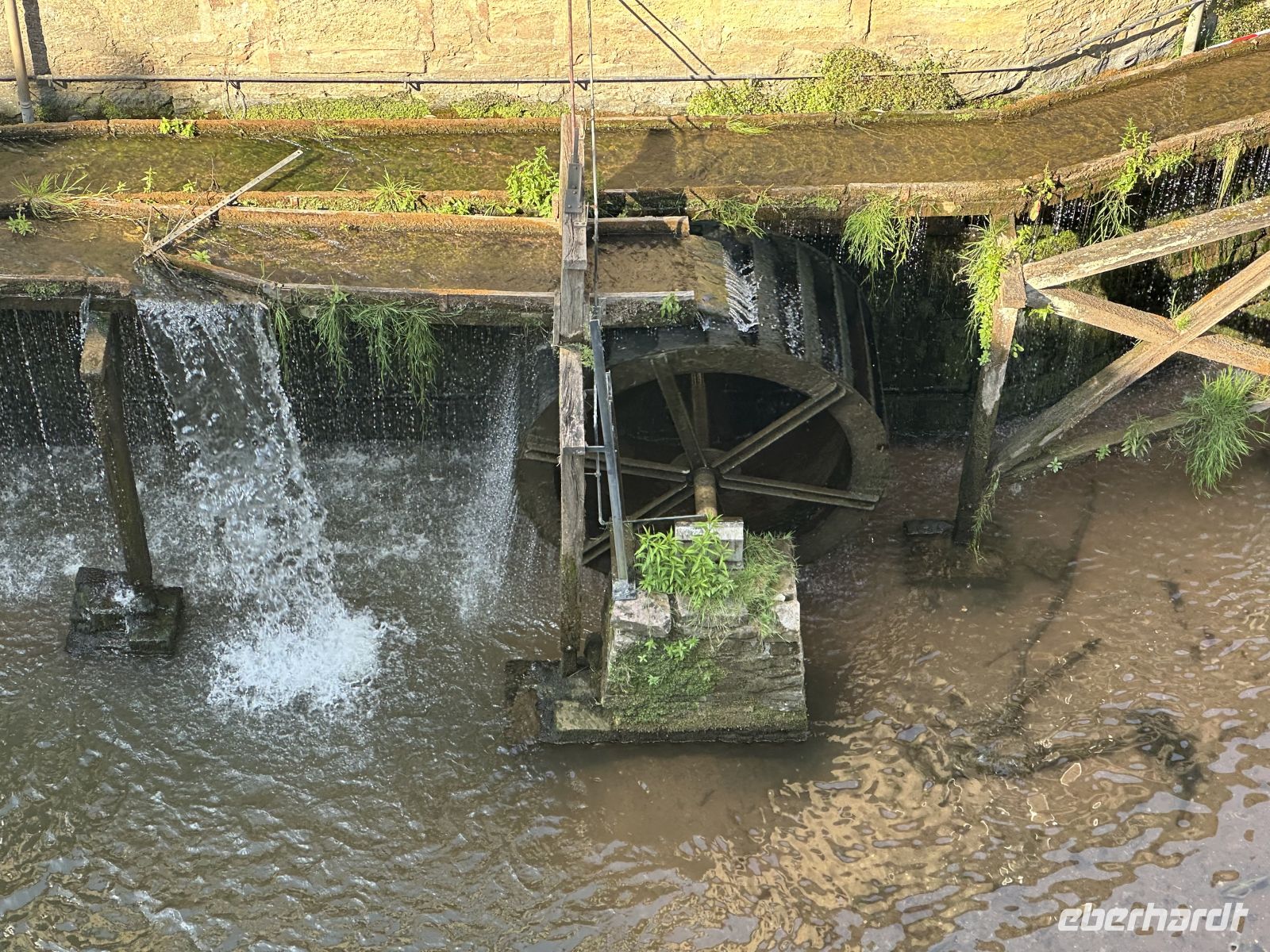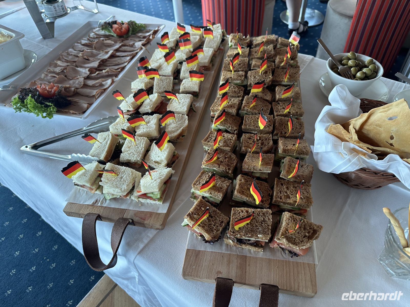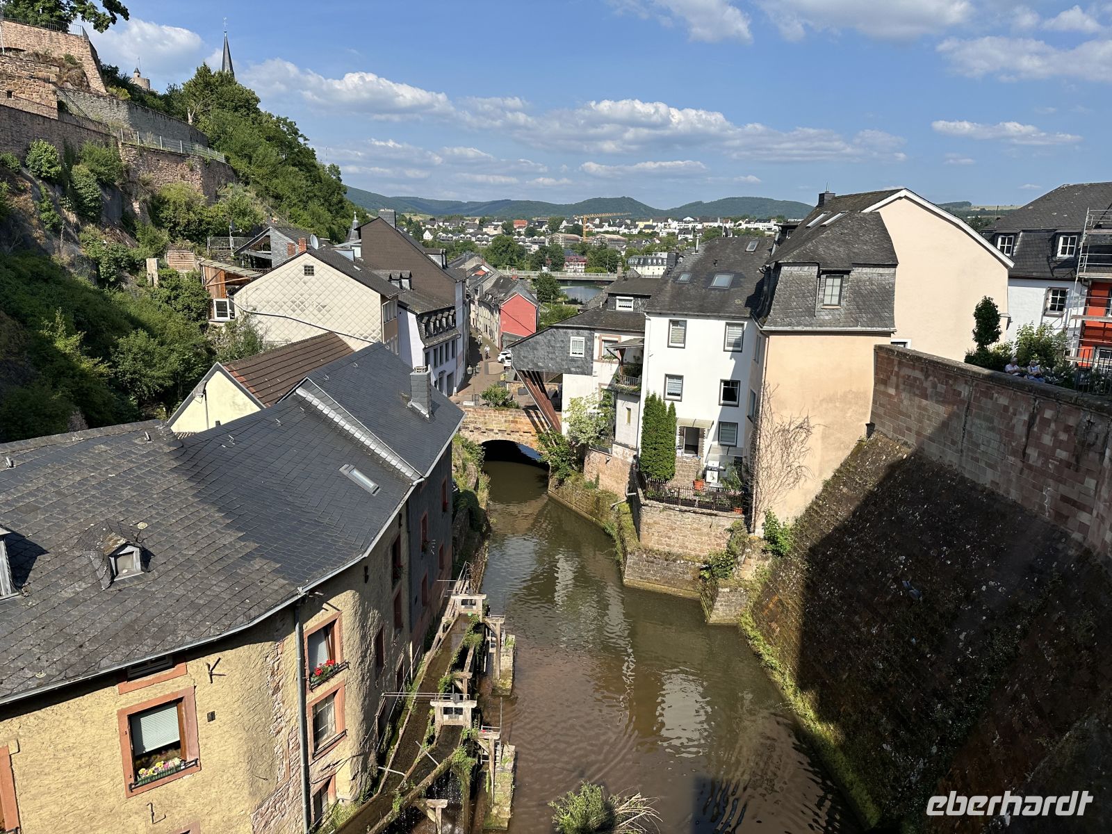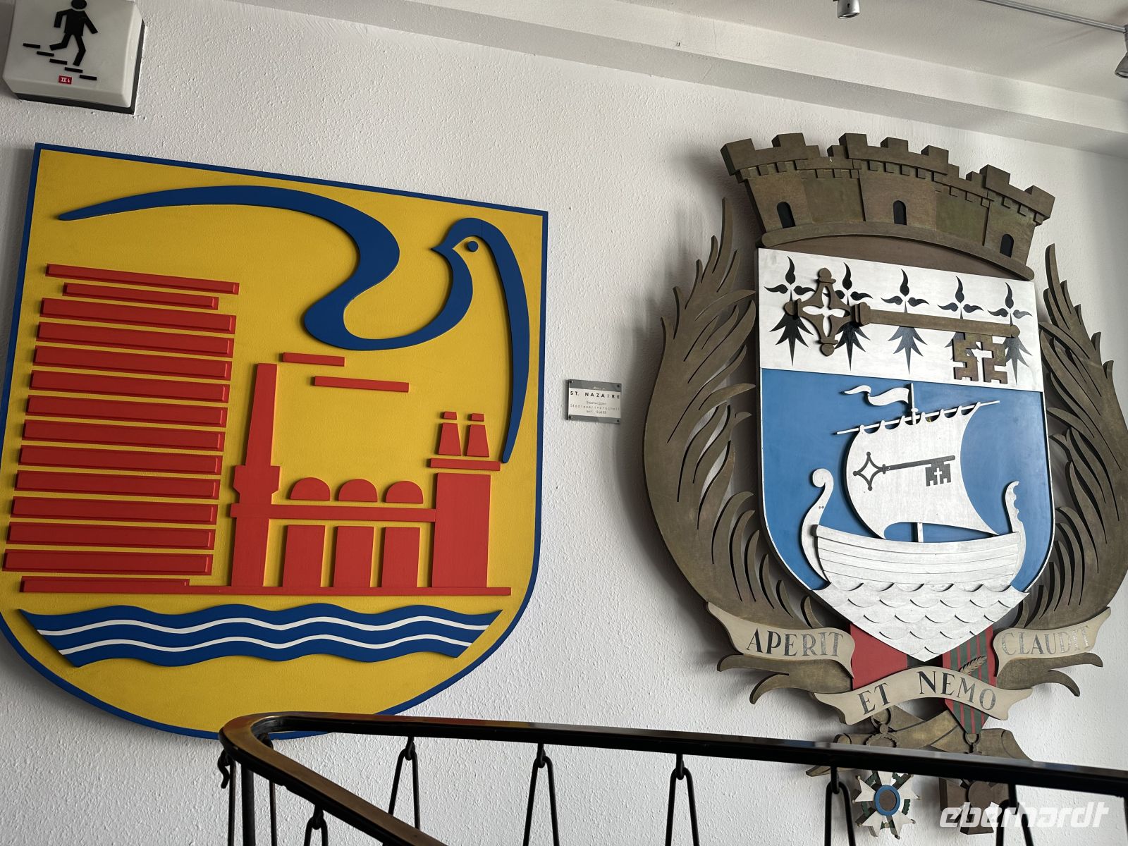 Nachmittags erwartet uns ein genussvolles Arrangement. In der Lounge findet eine exquisite Weinverkostung statt. Neben den guten Weinen, die für uns bereit stehen, gibt es auch eine Fülle von Appetithäppchen. Kleine Sandwiches sind mit deutschen Fähnchen dekoriert - eine Hommage der Crew an die deutschen Gäste. Die Sandwiches sind aus hellem und dunklen Brot und belegt mit verschiedenen Zutaten. Außerdem gibt es eine große Käseplatte. Unterschiedliche Käsesorten stehen zur Auswahl, begleitet von Trockenfrüchten wie Aprikosen und Rosinen und Crackern. Es gibt Obst, ein Schälchen mit Oliven, eine Aufschnittplatte mit leckerem Schinken, also alles was das Kreuzfahrerherz begehrt. So verbringen wir den Nachmittag in einer perfekten Kombination aus Geselligkeit und Genuss. Noch vor dem Abendessen erreichen wir Saarburg. Es bleibt Zeit für einen individuellen Spaziergang. Auf dem Weg in die malerische Altstadt kommen wir am Stadtwappen vorbei. Es zeigt die stolze Saar-Burg, die der Stadt ihren Namen gab. Seit etwa 600 Jahren befindet diese sich auch als Symbol auf dem Stadtsiegel und zeigt somit die historische Bedeutung der Burg. Unterhalb der Burg befindet sich das Mühlenmuseum. Es schließt um 17 Uhr, aber der Museumsführer, der gerade dabei ist, die Tür abzuschließen, lässt sich mit Freude darauf ein, uns etwas über seine Stadt zu erzählen. Als wir später über eine Brücke Richtung Altstadt laufen, können wir von oben die alten Mühlräder sehen, die sich unermüdlich im Wasser des Leukbachs drehen. Dieser Fluss bildet mitten in der Stadt einen beeindruckenden Wasserfall und mündet dann in die Saar. Das Stadtzentrum ist beliebt und belebt, Geschäfte laden zum Stöbern und Cafés zum einkehren ein. Ein schöner Abschluss eines wunderschönen Urlaubstages.