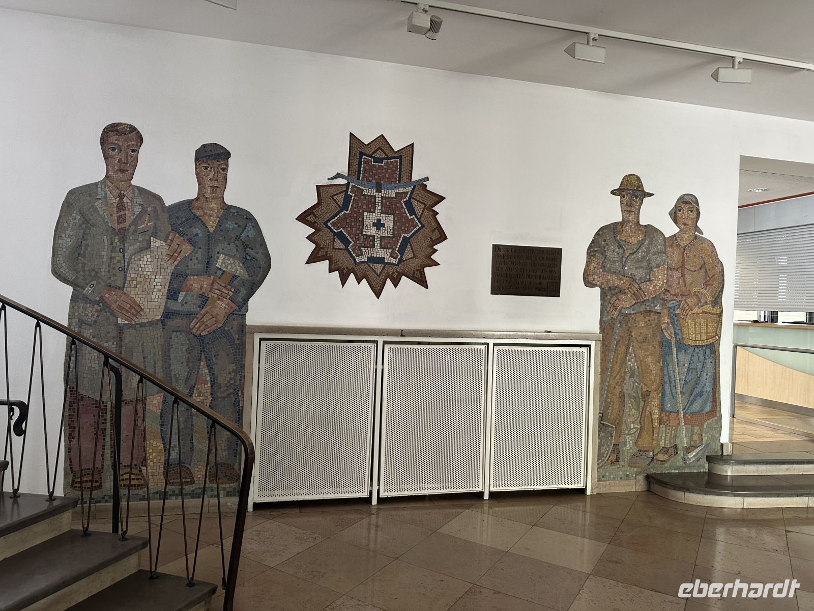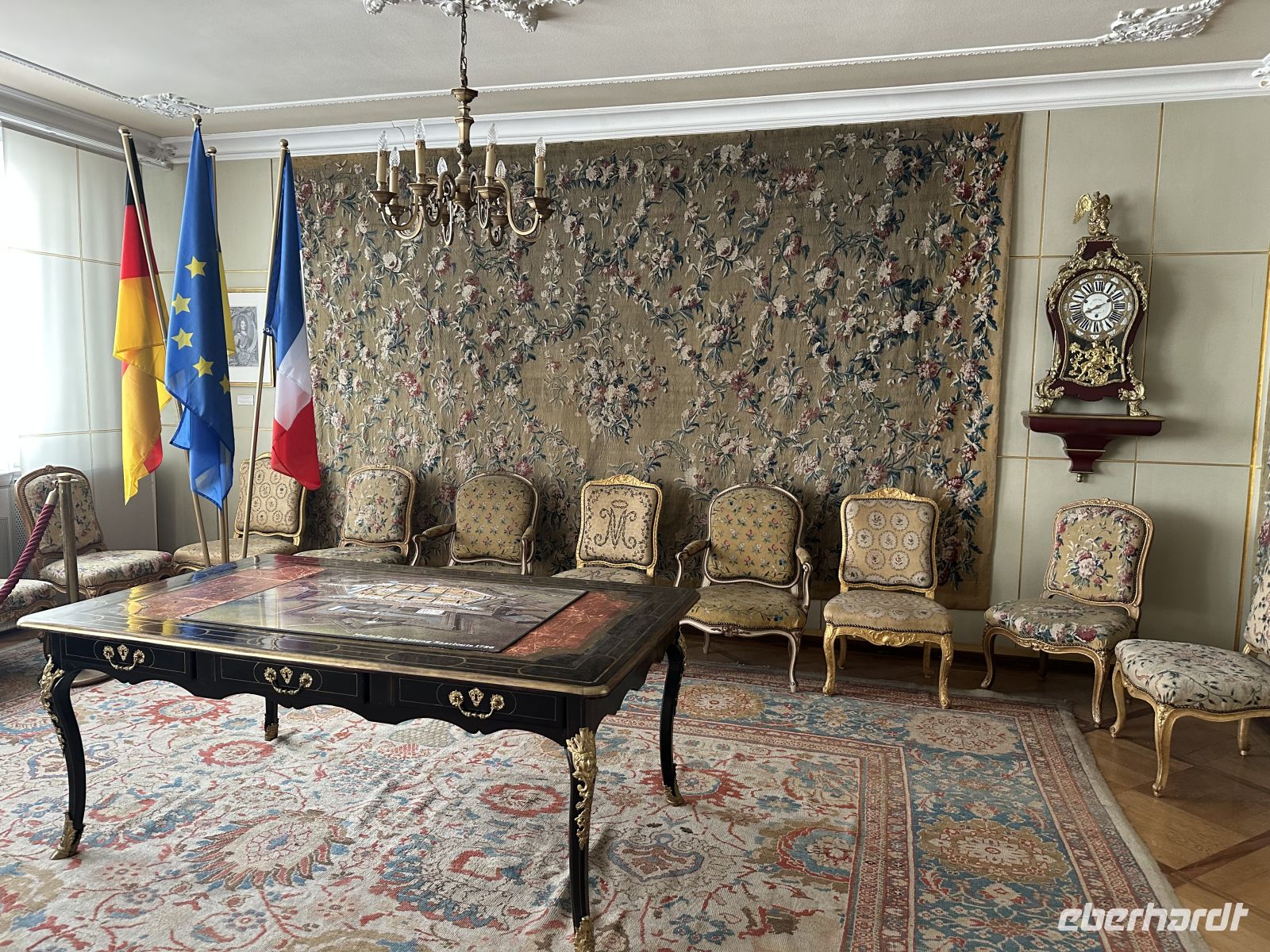 Nachdem wir die Saarschleife passiert haben, ändert sich die Landschaft allmählich. Die Natur weicht langsam einer stärker von der Industrie geprägten Region, die Saar wird hier breiter und ruhiger. Wir passieren Orte wie Dillingen und Saarlouis, die beide von der Industriegeschichte des Saarlandes zeugen. Mit Saarlouis erreichen wir am Nachmittag das letzte Ziel unserer Reise. Für den Stadtrundgang werden wir in mehrere Gruppen aufgeteilt. Jeder Stadtführer wählt seine eigene Route und diese waren, wie ich erfahren habe, recht unterschiedlich. Die Gruppe, die ich begleitet habe, ist zunächst ins Rathaus gegangen. Es war ja wirklich sehr heiß und so versuchte unser Stadtführer uns aus der Hitze rauszuhalten. Er berichtet über seine eigene familiäre Vergangenheit, die eng mit den vielen Wechseln dieser, im Grenzgebiet liegenden, Stadt verbunden ist. Heute Frankreich, morgen deutsch und übermorgen wieder französisch, so ging es für die Bürger der Stadt viele Jahrhunderte hin und her. Noch heute bzw. gerade heute wieder bringt die Lage der Stadt im Grenzgebiet große Probleme mit sich. Wir lassen uns im Gobelin-Saal nieder. Dieser Raum ist eng mit König Ludwig XIV von Frankreich verknüpft. Saarlouis wurde 1680 auf seine Anweisung als Festungsstadt gegründet. Der Saal ist mit einem Gobelin geschmückt, der in der Manufacture Royale des Gobelins geknüpft wurde und ein Geschenk von König Ludwig XIV. ist. Nachdem wir viele interessante Informationen erhalten haben, spazieren wir zur St. Ludwig Kirche.