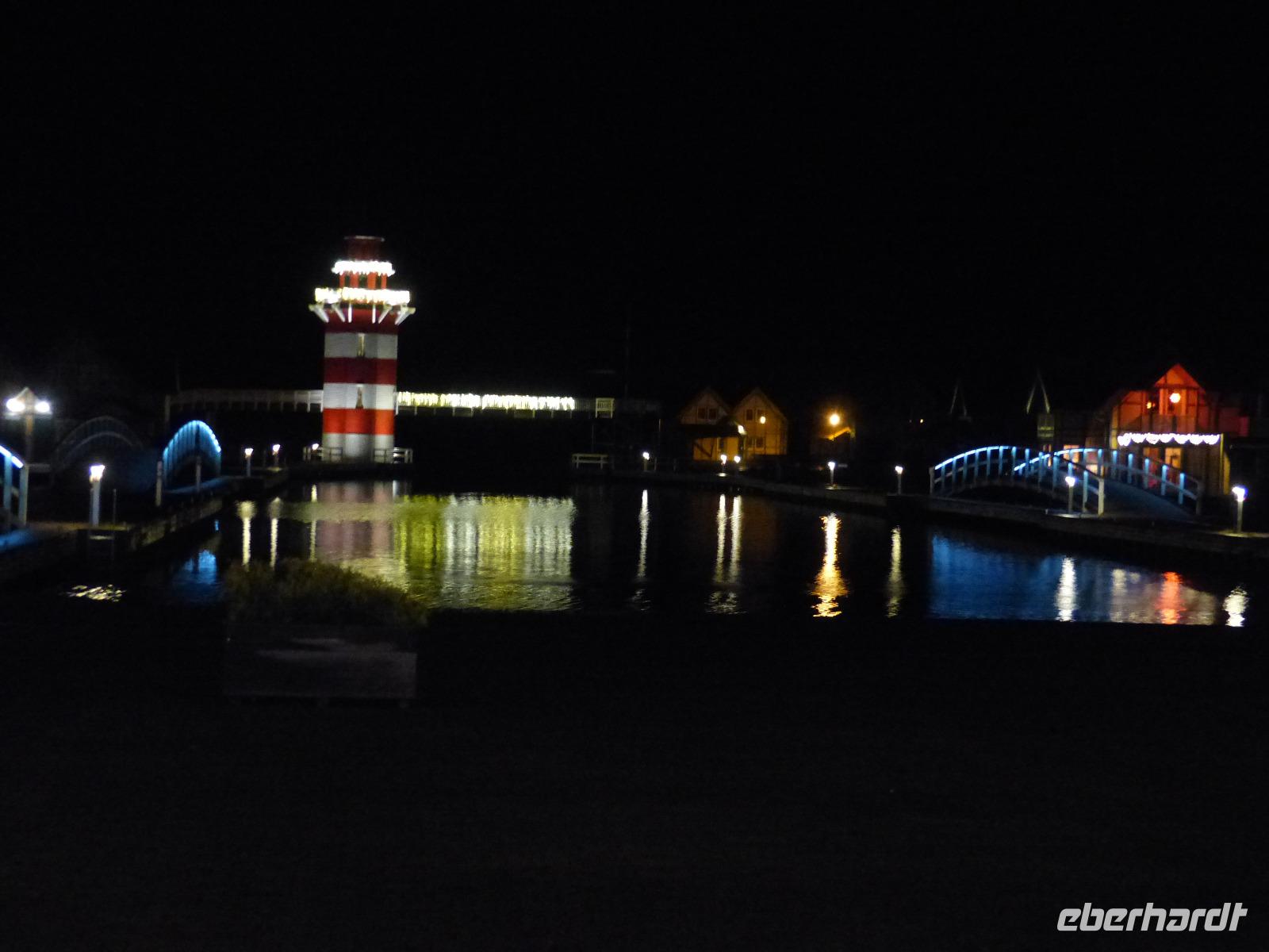 Unser Bus fuhr von Dresden über Leipzig an Dessau vorüber. In Linum stieg dann auch die Reiseleiterin zu. Bald schon verließ unser Bus nun die Autobahn und wir passierten Neuruppin, die Heimatstadt von Theodor Fontane und vom Architekten Schinkel und erreichten gegen Mittag das Schloss Rheinsberg. Dort trafen wir auch unsere pünktlichen Autofahrerinnen und ließen uns bei einer Schlossführung viel über die beiden Brüder Friedrich II. von Preußen und Prinz Heinrich erzählen, die beide hier wohnten und bauten. Leider regnete es und so fiel unser Schlossgartenspaziergang etwas kürzer aus. Wir warfen noch einen kurzen Blick auf den Weihnachtsmarkt von Rheinsberg, versorgten uns mit einem wärmenden Glühwein und zogen danach in unser schickes Wellness-Hotel, das Maritim Hafenhotel Rheinsberg, ein. Kaum angekommen, servierte man uns dort sehr leckere Kuchenstücke und Kaffee an einem herrlich aussichtsreichen Tisch, von dem aus wir den Blick über das ganze Hafendorf hatten. Danach konnte jeder tun was er wollte. Sauna, Schwimmhalle oder einen kurzen Spaziergang durch das malerisch am Wasser gelegene Hafenhotel, dessen Bungalows teilweise auf Inseln im See stehen. Am Abend erwartete uns ein sehr leckeres Buffet in diesem perfekt geführten Haus. Und nach dem Essen vergnügten wir uns bei einem Glühwein an der Feuerschale im Hof mit Blick auf den beleuchteten Leuchtturm, die beleuchteten Brücken und Inselhäuschen. So klang unser erster Tag stimmungsvoll aus, in einem sehr angenehmen Hotel, das wir in vollsten Zügen genossen.