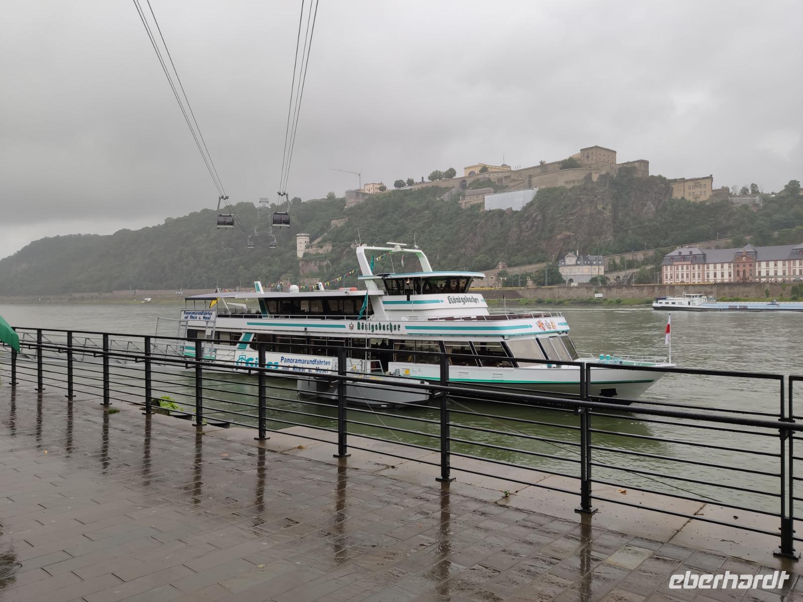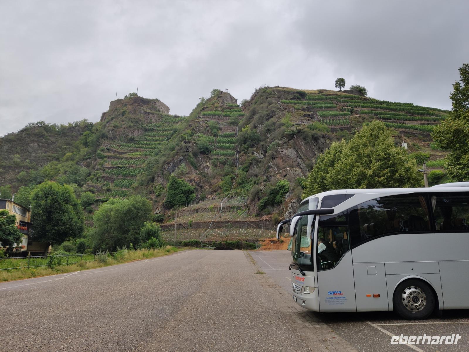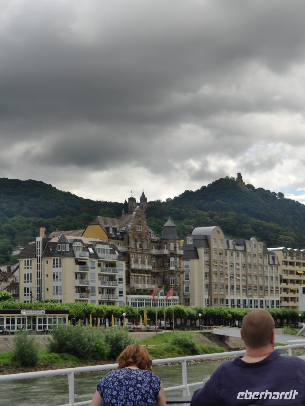 Der heutige Tag meinte es wettertechnisch leider nicht allzu gut mit uns, sodass wir am morgen mit Regenschauern und tristem Wetter „begrüßt" wurden. Nachdem wir eine neue Rheinbrücke, die John F. Kennedy Brücke überfahren und das rechtsrheinische Viertel Beuel durchquert hatten, kamen wir zum Drachenfels. An der Talstation der Zahnradbahn konnten wir noch etwas zur Historie lesen, bevor wir die Wagen bestiegen, die uns zuerst zur Mittelstation brachten. Hier stand im Schloss Drachenburg eine Führung durch das 1882 errichte Anwesen auf dem Programm. Der Bauherr, Stephan von Sarter, der beruflich größtenteils in Paris verweilte kam allerdings nie in den Genuss in seinem Anwesen zu schlafen. Bei seinen Besuchen zog er es sogar vor in einem nahegelegenen Hotel abzusteigen und sein Schloss von der gegenüberliegenden Rheinseite zu bewundern. Im Laufe der Jahrzehnte war dann ein Internat untergebracht, sowie eine Eliteschule der Nazis. Nachdem es Jahrelang nach dem Krieg dem Verfall ausgesetzt war, erwarb es ein Unternehmer Namens Spinat. Dieser restaurierte es, bevor es mittlerweile der NRW-Stiftung gehört, die es sich zur Aufgabe gemacht hat das Schloss weiter zu restaurieren. Wieder an der Station angekommen, brachte uns die Bahn zur Endstation auf 327 Metern Höhe, mit dem sogenannten Drachenfels. Leider war das Wetter sehr trüb, sodass man keinen wunderschönen Blick über das Rheintal erhaschen konnte. Dennoch konnte man ungefähr einordnen, wo sich bestimmte Landmarke befanden, wie die Insel Neuwerth im Rhein. Zurück am Bus stärkte sich die Reisegruppe an den angebotenen Speisen und weiter ging die Fahrt entlang des Rheins in Richtung Rheinland-Pfalz mit Koblenz. Hier stand ein Spaziergang zum deutschen Eck auf dem Programm, wobei unser Bus der einzige vor Ort war. Die Statue von Wilhelm des I. steht seit 1949 wieder am Ort, wo sich Mosel und Rhein vereinigen. Mit der Seilbahn kann man von hier auf die Festung Ehrenbreitstein fahren, was wir allerdings nicht machten, da auch hier das Wetter zu diesig war. Kurzfristig konnten weitere Punkte in das Programm aufgenommen werden, indem man einen Abstecher in das wunderschöne Ahrtal unternahm. Die Ahr ist ein Fluss, der ebefalls in den Rhein fließt und an deren Hängen vorzugsweise Rotwein angebaut wird. Dies alles wurde uns bei einer Weinführung in der Winzergenossenschaft von Mayschoß erklärt, bevor man einen Wein verkosten konnte. Das Glas durfte dabei gleich als Andenken mit nach Hause genommen werden und einzelne Kunden kauften in diesem Zug auch gleich noch ein paar Flaschen des edlen Tropfens für den heimischen Weinkeller. Beim gemütlichen Zusammensetzen im Weinkeller verging die Zeit leider zu schnell, sodass es bald hieß in Richtung Bonn aufzubrechen. Nach einer halben Stunde fanden wir uns vor dem Hotel wieder und jeder genoss individuell sein Abendessen, bot die Umgebung allerhand gute Restaurants für die unterschiedlichen Geschmäcker.