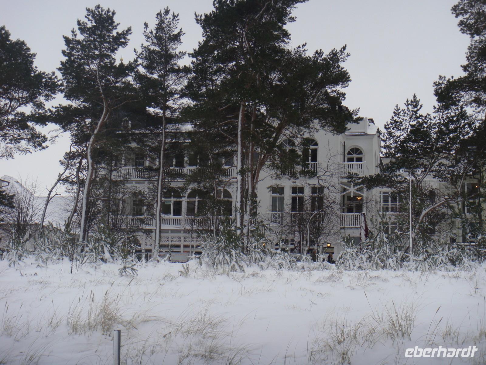 Der feine Sand von Binz knirscht unter meinen Stiefeln, als ich mich an unserem ersten Tag auf den Weg mache. Die Prorer Wiek, wie diese Bucht heißt, schmiegt sich von der Halbinsel Jasmund mit ihren berühmten Kreidefelsen bis zum Ende der Granitz, einem im Hinterland von Binz verlaufenden, 1000 Hektar großen Waldgebiet. Besonders empfehlenswert ist ein ausgiebiger Spaziergang entlang der Promenade bis zur Seebrücke, die 370 Meter ins Meer hinaus ragt. An der Seebrücke befindet sich auch das berühmte, 1893 errichtete, 1905 abgebrannte und drei Jahre später wieder aufgebaute Kurhaus. Es erstrahlt auch im Winter mit seinen drei eleganten, repräsentativen Flügeln. Nach einem Bummel im Ortszentrum spaziere ich am breiten Sandstrand wieder zurück zum Hotel. Der pudrig-weiße Sand ist gerade im Winter ausreichend trittfest, um einen entspannenden Spaziergang direkt an der Ostsee zu gewährleisten. Zwar gilt am Strand generell (außer am Hundestrand) Vier-Pfoten-Verbot, in den Wintermonaten schert sich allerdings keiner darum und die Hunde schießen wie die Raketen über den Sand. Der eine flitzt hinter den Möwen her, der andere hinter kleiner gewachsenen Hunden - Ein tolles Bild!