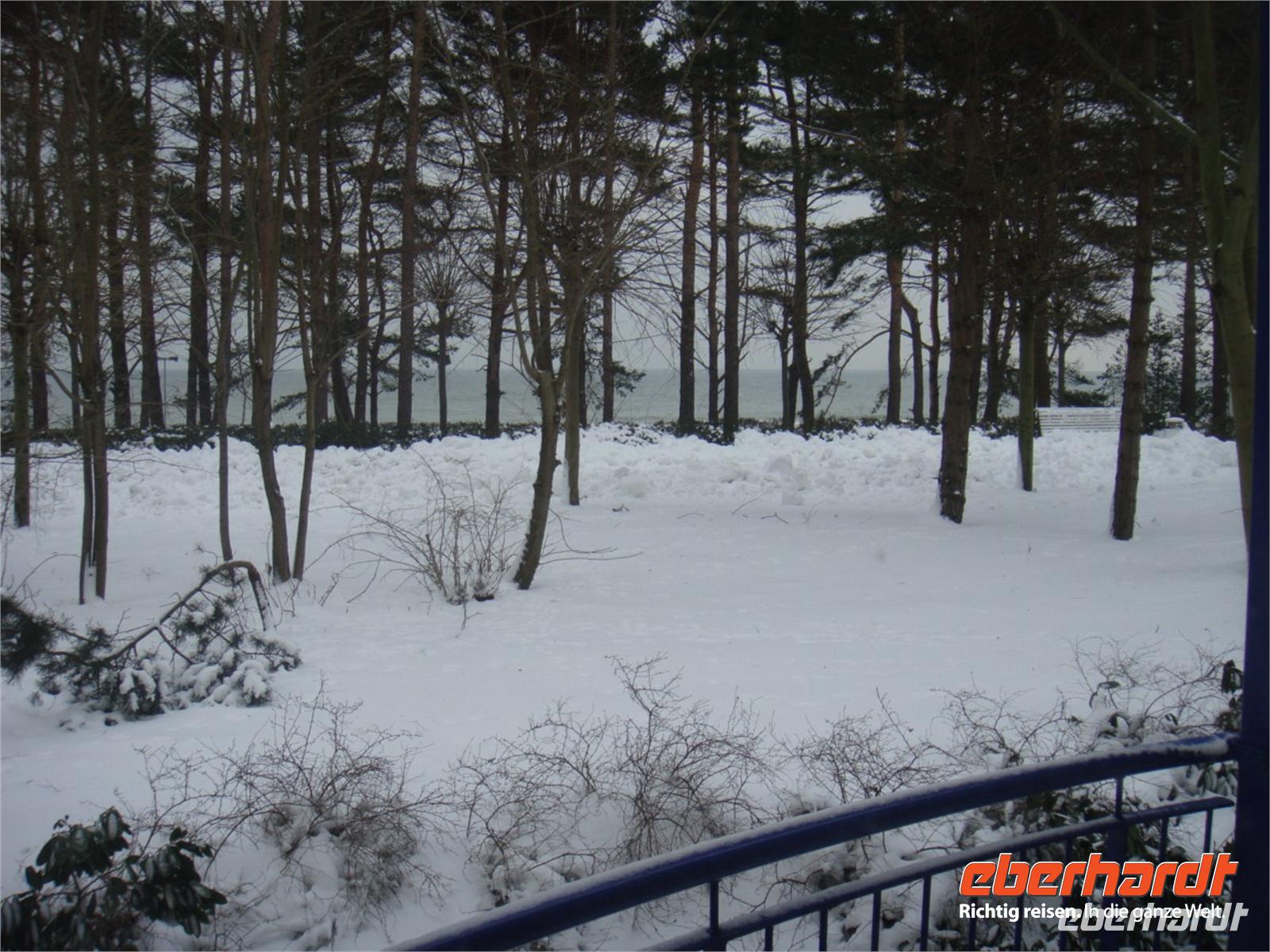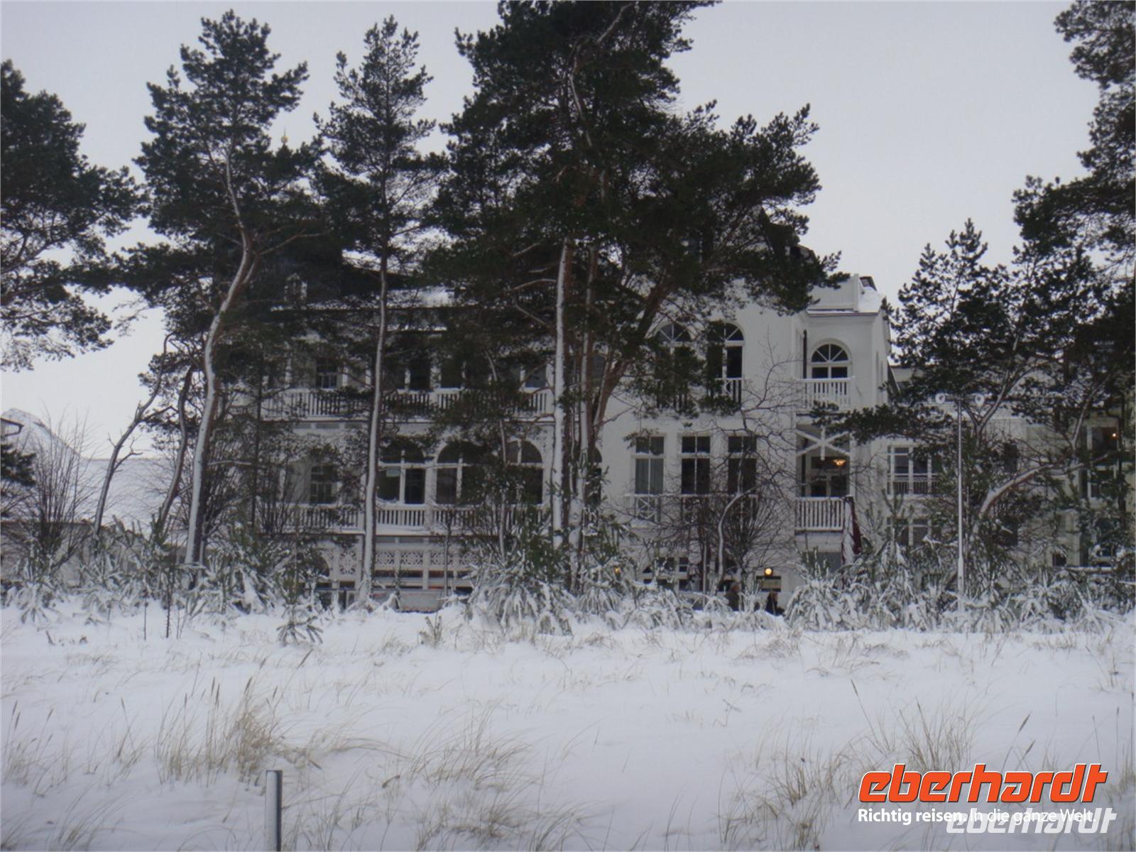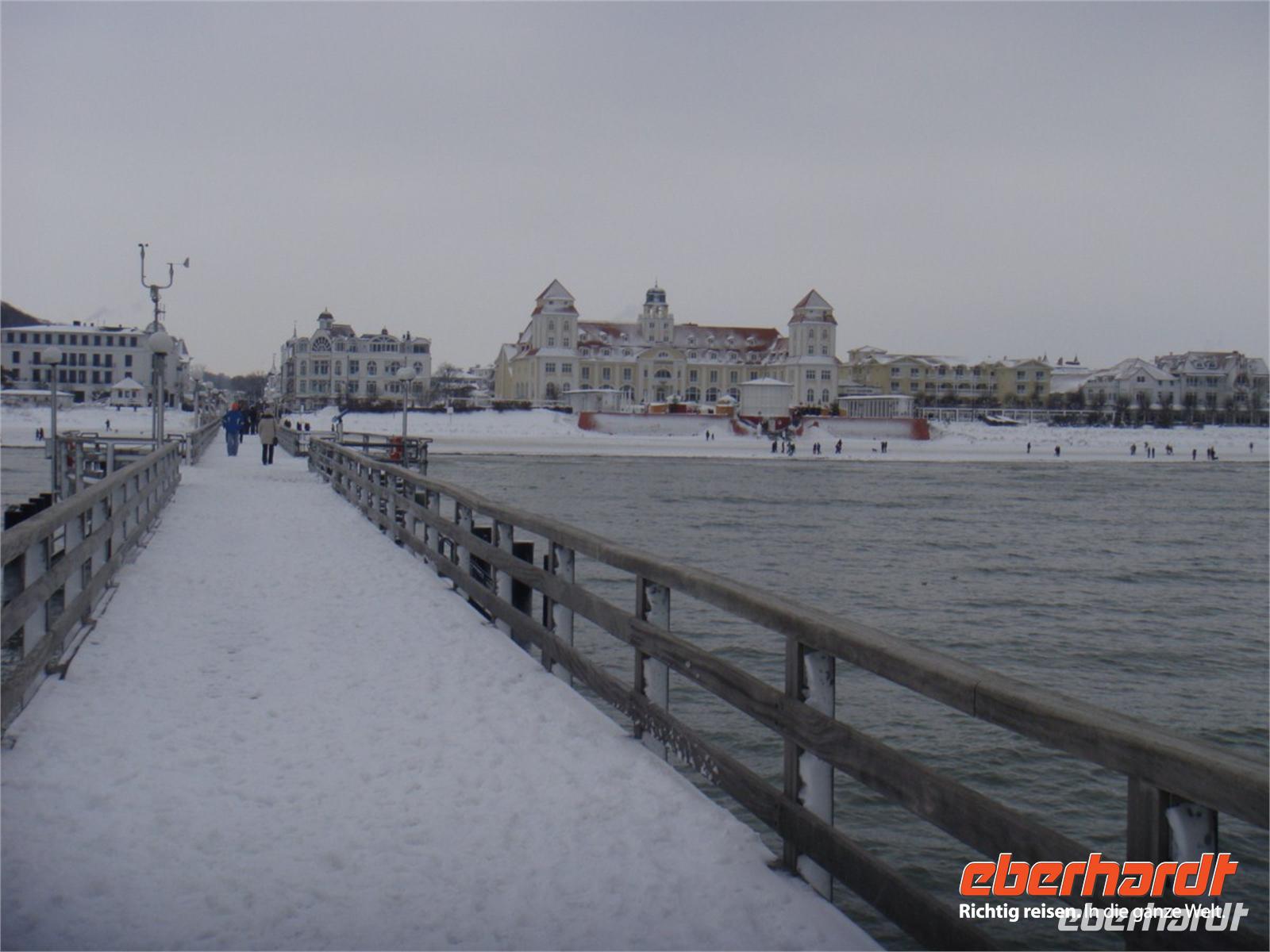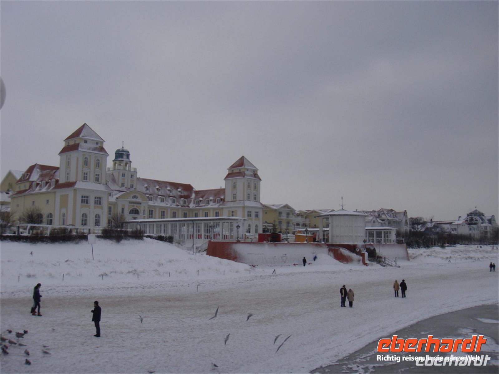 zur Seebrücke, die 370 Meter ins Meer hinaus ragt. An der Seebrücke befindet sich auch das berühmte, 1893 errichtete, 1905 abgebrannte und drei Jahre später wieder aufgebaute Kurhaus. Es erstrahlt auch im Winter mit seinen drei eleganten, repräsentativen Flügeln. Nach einem Bummel im Ortszentrum spaziere ich am breiten Sandstrand wieder zurück zum Hotel. Pudrig-weißer Sand ist gerade im Winter ausreichend trittfest, um einen entspannenden Spaziergang direkt an der Ostsee zu gewährleisten. Zwar gilt am Strand generell (außer am Hundestrand) Vier-Pfoten-Verbot, in den Wintermonaten schert sich allerdings keiner darum und die Hunde schießen wie die Raketen über den Sand. Der eine flitzt hinter den Möwen her, der andere hinter kleiner gewachsenen Hunden - Ein tolles Bild!