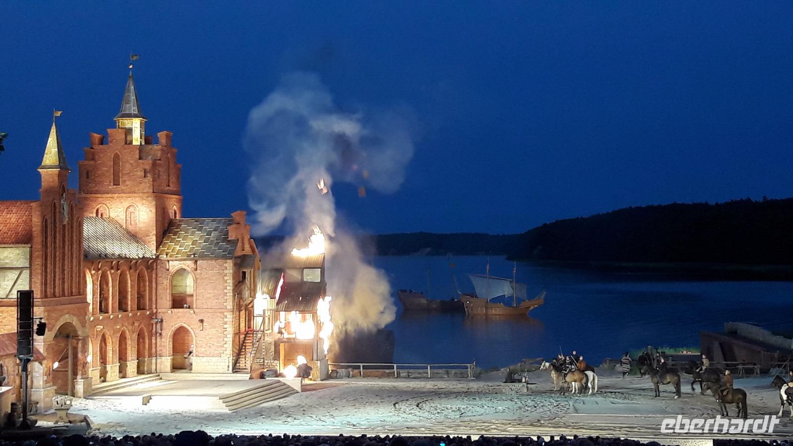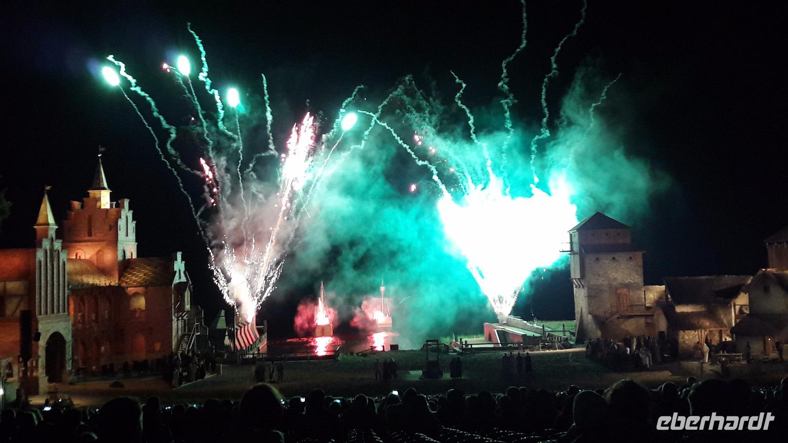 Mit dem Schiff ging es von Breege aus nach Ralswieck und trotz schlechtester Wettervorhersagen hatten wir Glück: es blieb den ganzen Abend trocken und wir konnten eine herrliche Aufführung mit anschließendem Feuerwerk genießen. Kurz nach Mitternacht legten wir wieder mit dem Schiff in Breege an und spazierten zum Hotel zurück.