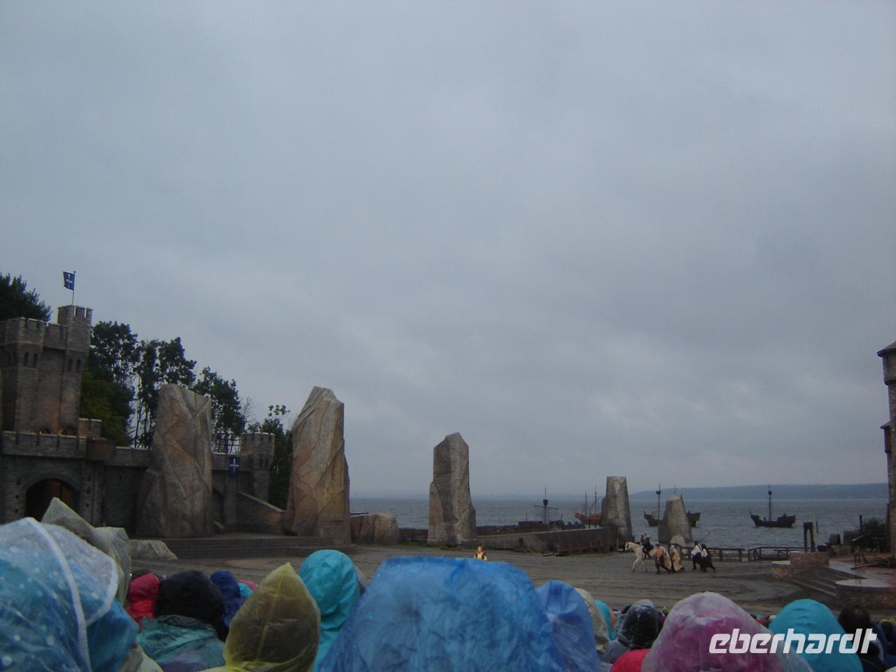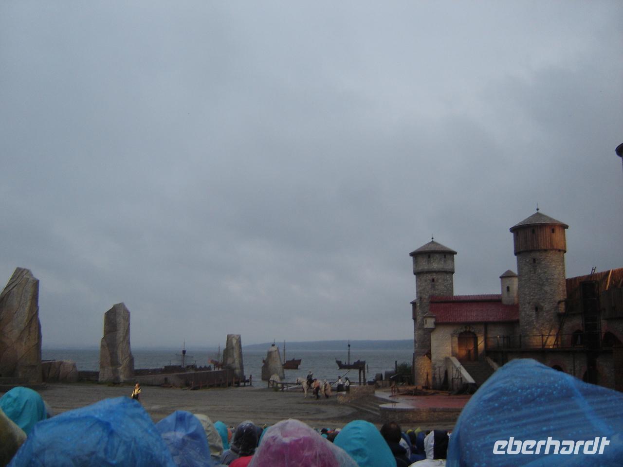 Gegen Abend stieg die Spannung. Wir hofften alle, dass der Regen aufhörte, denn bereits 18:30 Uhr brachte uns die Fähre nach Ralswik,, wo eines der größten (mit 8802 Sitzplätzen) und erfolgreichsten Open-Air-Theater Deutschlands stattfindet. Doch vom Regen ließen wir uns und die Schauspieler nicht abhalten. Wir erlebten in bunten Regenjacken den aufregenden dritten Teil der Saga "Störtebekers Schatz: Der Schatz der Templer". Die Zuschauer wurden am Ende mit einem schönen Feuerwerk verabschiedet.