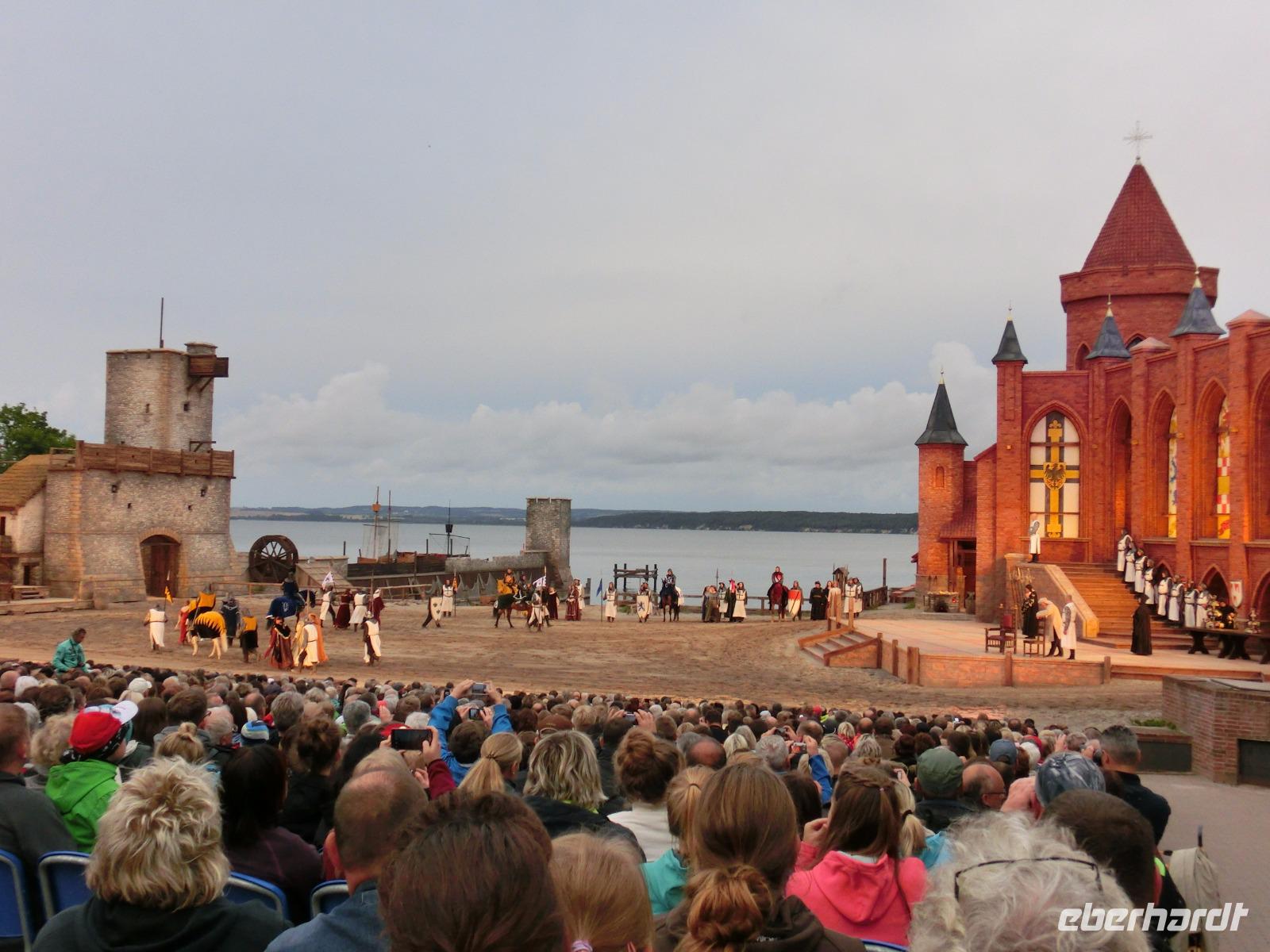 350 Personen arbeiten jeden Sommer bei den Störtebeker Festspielen, damit auf der Seebühne ein unvergleichbares Spektakel inszeniert werden kann. Voller Begeisterung verließen wir nach dem Feuerwerk über dem Ralswieker Bodden wieder auf dem Seeweg den Ort der Aufführung. Kurz vor Mitternacht legte der Dampfer in Breege an. Nach einem langen Tag waren alle 0:30 Uhr im Bett.