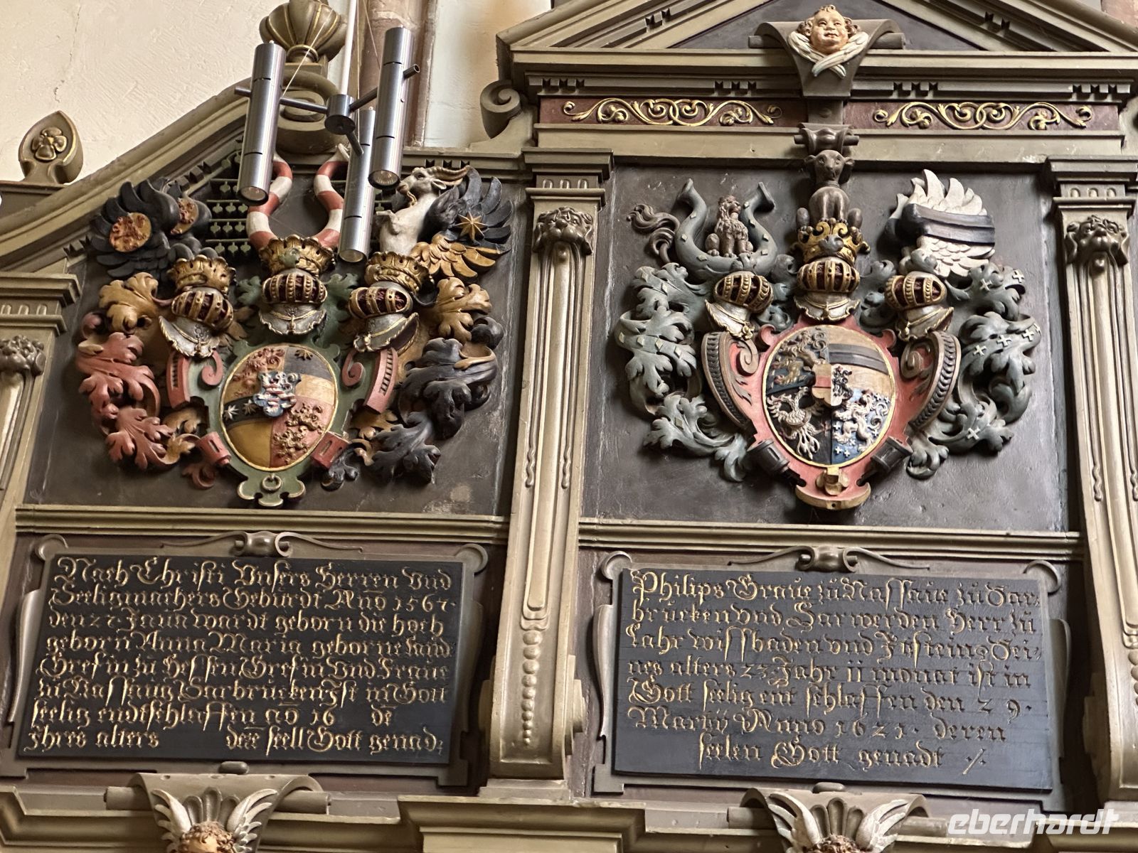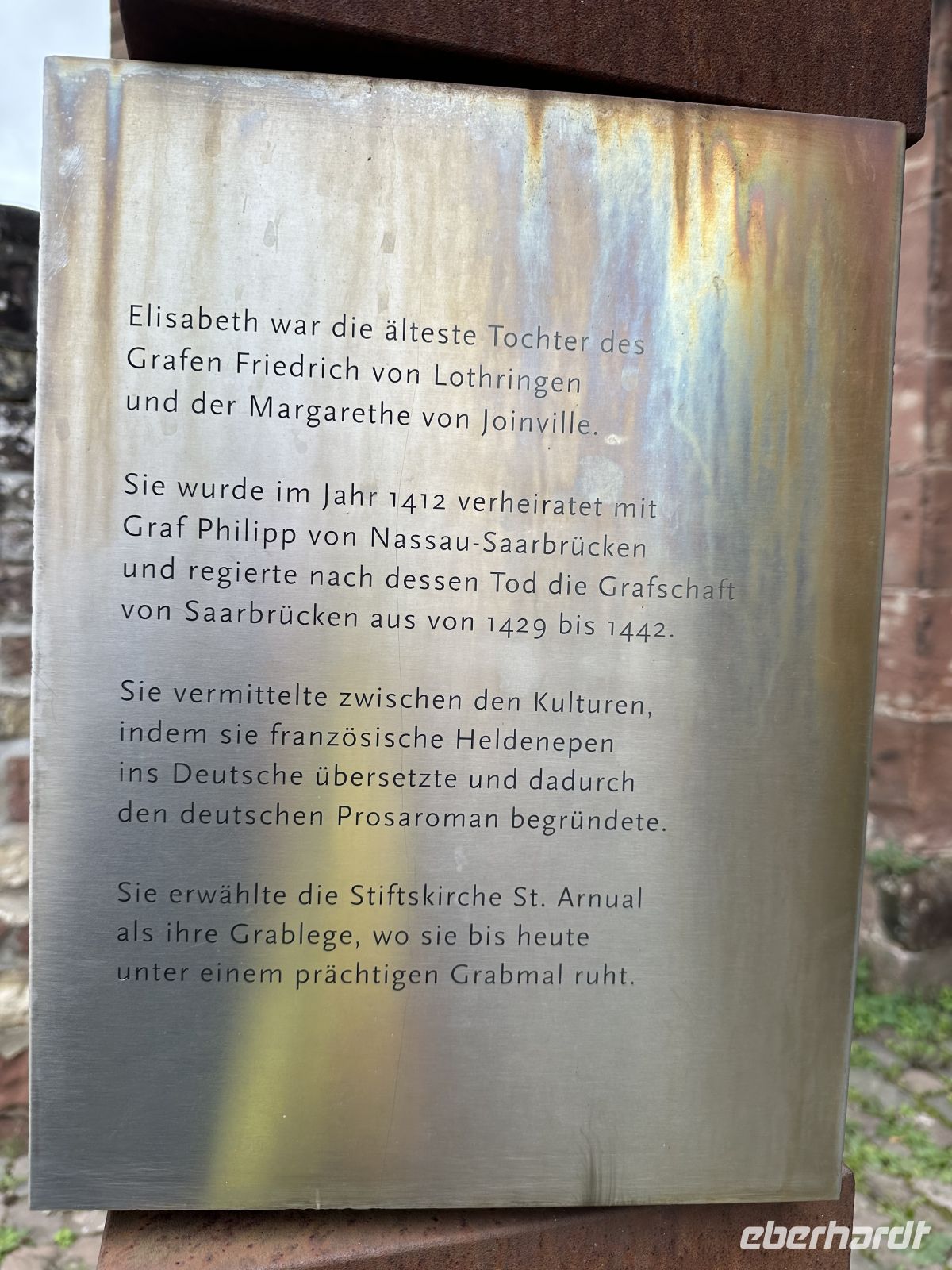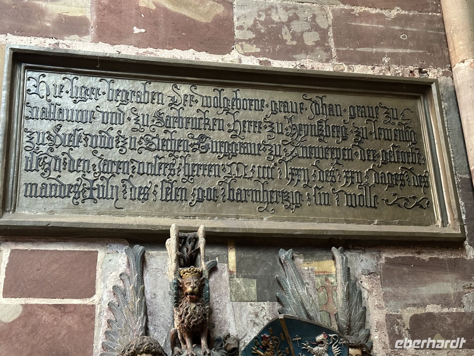 An der Kirche St. Arnual legen wir unseren ersten Stopp ein. Der Name der Kirche soll auf eine Klostergründung an dieser Stelle zurückgehen, die von Bischof Arnual von Metz veranlasst wurde. Der Bau der Kirche stammt im Wesentlichen aus dem 13. Jahrhundert. Das Besondere in der Kirche die Grabmäler der Grafen und Fürsten von Nassau-Saarbrücken. Diese, so wie Graf Philipp III. (1542-1602), dessen Grabmal wir besichtigen, waren ein bedeutender Zweig des Hauses Nassau (ein bedeutendes europäisches Adelsgeschlecht, dessen Ursprünge bis ins 11. Jahrhundert zurückreichen und dessen Name auch heute noch getragen wird). Als Graf von Saarbrücken und Saarwerden herrschte Philipp III. über die Region und trug maßgeblich zur Reformation in seinen Gebieten bei. Die Stiftskirche St. Arnual diente der Familie über Jahrhunderte als Grabstätte und zeugt heute noch von ihrer Geschichte. Graf Philipp III. war insgesamt dreimal verheiratet. Gräfin Anna Maria von Hessen-Kassel, die auch auf der Gedenktafel abgebildet ist, war seine erste Frau. Sie starb jedoch kinderlos, und die Linie wurde durch seine späteren Ehen fortgesetzt.