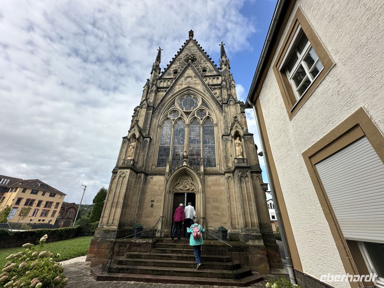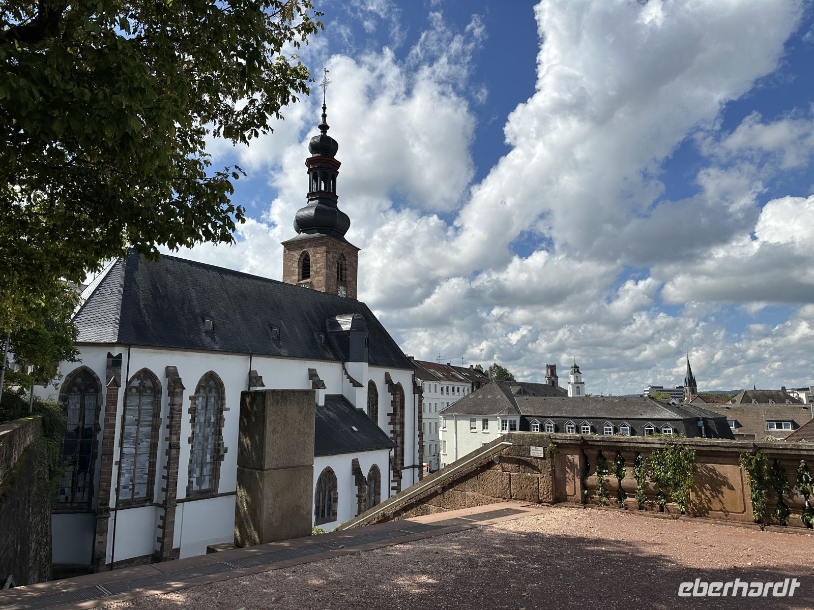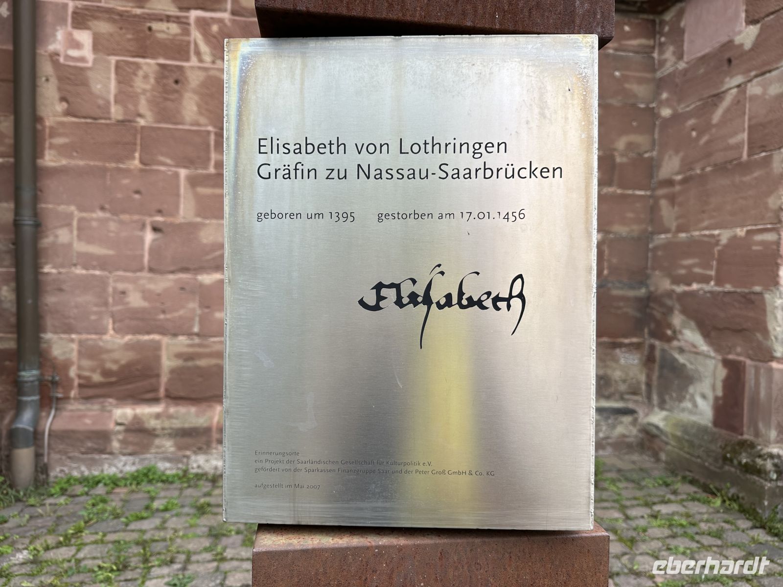 An der Kirche St. Arnual legen wir unseren ersten Stopp ein. Der Name der Kirche soll auf eine Klostergründung an dieser Stelle zurückgehen, die von Bischof Arnual von Metz veranlasst wurde. Der Bau der Kirche stammt im Wesentlichen aus dem 13. Jahrhundert. Das Besondere in der Kirche die Grabmäler der Grafen und Fürsten von Nassau-Saarbrücken. Diese, so wie Graf Philipp III. (1542-1602), dessen Grabmal wir besichtigen, waren ein bedeutender Zweig des Hauses Nassau (ein bedeutendes europäisches Adelsgeschlecht, dessen Ursprünge bis ins 11. Jahrhundert zurückreichen und dessen Name auch heute noch getragen wird). Als Graf von Saarbrücken und Saarwerden herrschte Philipp III. über die Region und trug maßgeblich zur Reformation in seinen Gebieten bei. Die Stiftskirche St. Arnual diente der Familie über Jahrhunderte als Grabstätte und zeugt heute noch von ihrer Geschichte. Graf Philipp III. war insgesamt dreimal verheiratet. Gräfin Anna Maria von Hessen-Kassel, die auch auf der Gedenktafel abgebildet ist, war seine erste Frau. Sie starb jedoch kinderlos, und die Linie wurde durch seine späteren Ehen fortgesetzt.
