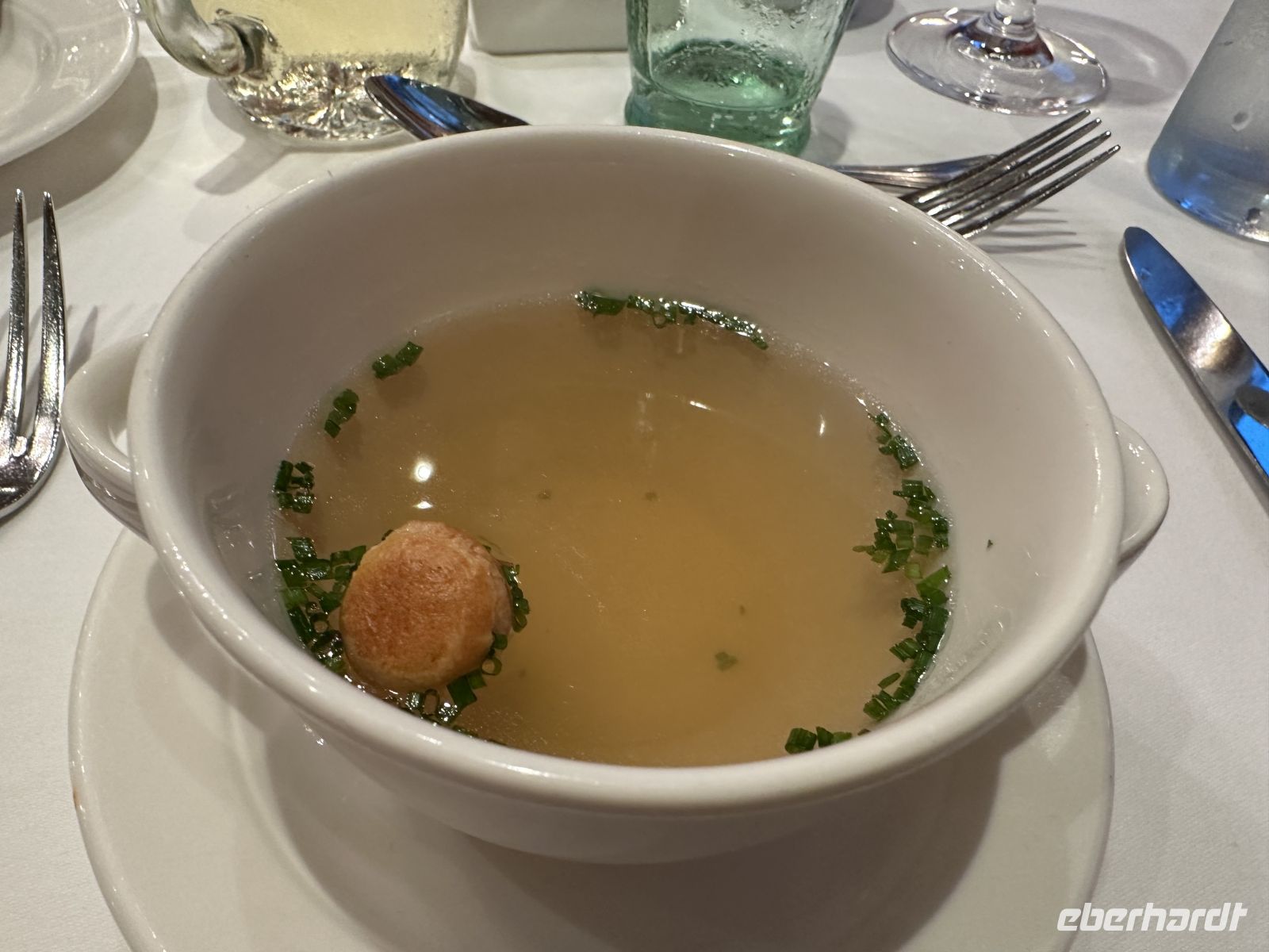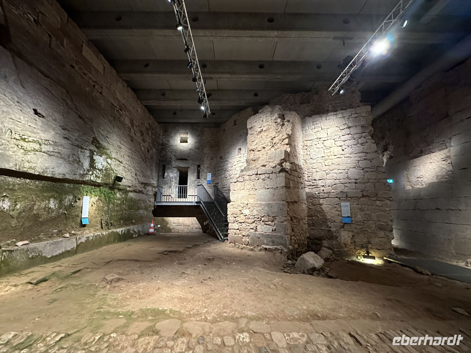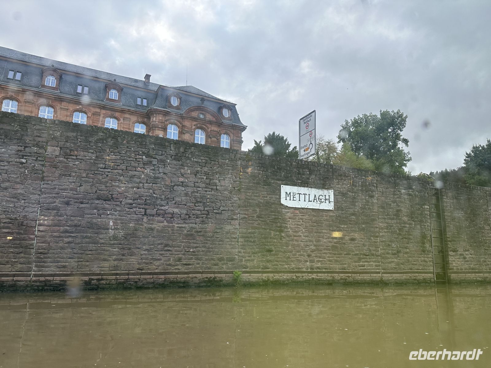 Wir tauchen nun ein in die sogenannten Katakomben im Saarbrücker Schloss, welche freigelegte Überreste einer unterirdischen Burganlage sind. Diese Festungsbauten und Kasematten stammen aus dem 13. bis 18. Jahrhundert. Sie liegen 14 Meter unter dem heutigen Schlossplatz und sind Teil des Historischen Museums. Nachdem wir wieder aus dem Untergrund zurückgekehrt sind, fahren wir noch durch ein paar Straßen Saarbrückens und nehmen dann Kurs auf unser Boot. Nach einer kleinen Irritation finden wir den Anlegeplatz und checken pünktlich um 15.30 Uhr ein. Die Kabinenschlüssel und das Tagesprogramm liegen auf den Kabinen, die Koffer werden vom freundlichen Personal gebracht. Im Salon gibt es ein Willkommensbuffet. Da sich die Gruppe aus der Schweiz etwas verspätet, wird der Willkommenscocktail um einen halbe Stunde verschoben. Nachdem nun auch die Schweizer Gäste an Bord sind, laden der Kapitän, der Hotelmanager und die Kreuzfahrtleiterin zum Cocktail ein. Anschließend gibt es ein festliches Abendessen an Bord. Es gibt eine mehrgängige Vorspeise, die aus Entenleberterrine, klarer Tomatenessenz und gegrillter Garnele besteht. Es folgt ein Mango Sorbet mit Champagner, um den Gaumen zu neutralisieren. Nun wird der Hauptgang serviert: Ochsenbäckli in Rotwein geschmort mit Rübli-Mousseline, Ratatouille und Herzogin Kartoffeln. Beim Dessert haben die Wahl zwischen Tobleronemousse, internationalen Käsespezialitäten oder einer Fruchtplatte. Alles in Allem ein köstliches Begrüßungsmenü.