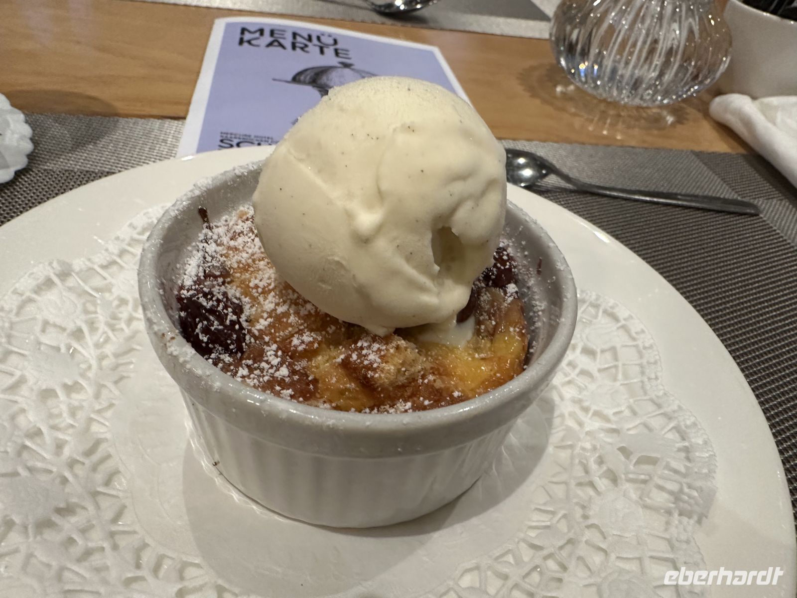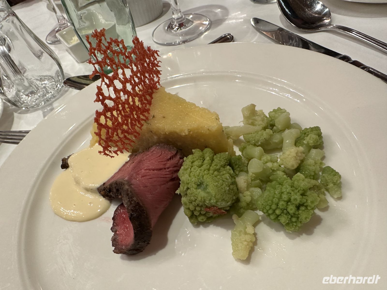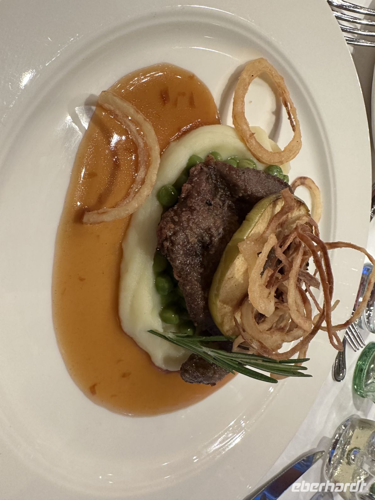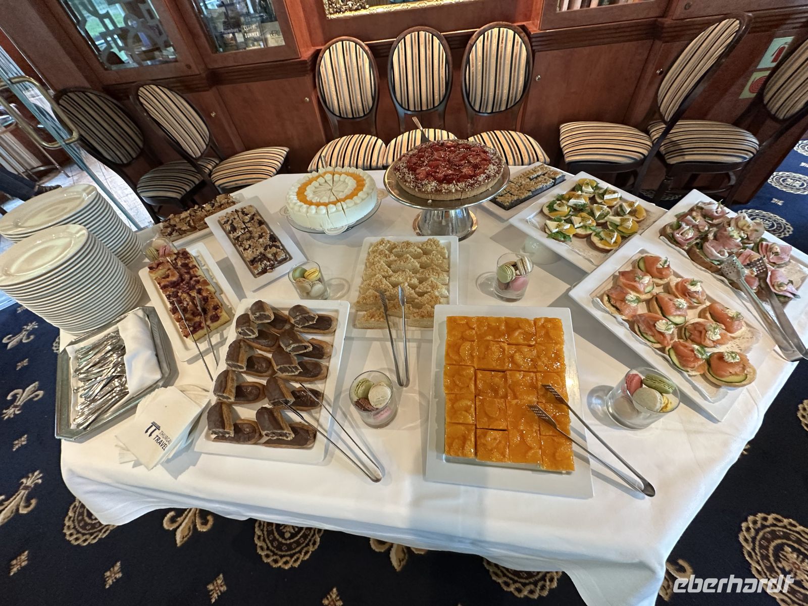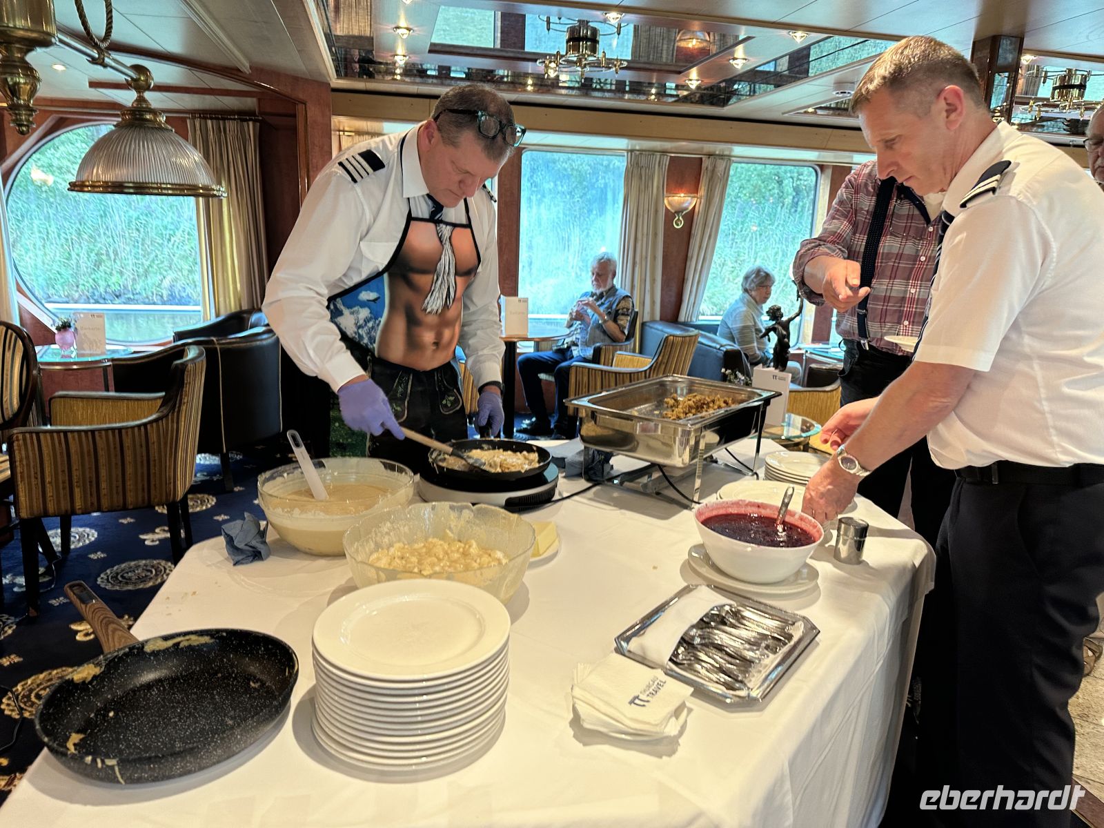 Alle weiteren Stunden des Tages sind wir auf dem Dortmund-Ems-Kanal unterwegs. Erst am späten Abend werden wir Dörpen erreichen, wo unser Schiff die Nacht über liegen wird. Uns erwartet eine interessante Mischung aus Naturerlebnissen und Einblicken in die industrielle Nutzung der Wasserstraße. Wir fahren durch das flache Emsland, dessen Landschaft sich je nach Abschnitt verändert. Zu Beginn der Fahrt ist die Umgebung stark von Industrie und Landwirtschaft geprägt. Die Kanalufer werden von Dämmen und Wegen gesäumt, die oft von Pappeln und Weiden bewachsen sind und als natürliche Korridore für Wildtiere dienen. Weiter nördlich, besonders in der Nähe von Meppen, ändert sich das Bild. Hier überquert der Kanal die Ems auf einer beeindruckenden Brücke und wir haben einen weiten Blick über die typische Auenlandschaft mit Feuchtgebieten, Wiesen und Schilfgürteln. Diese Feuchtgebiete sind ein wichtiger Lebensraum für Wasservögel wie Enten, Blesshühner und Reiher. Die Natur entlang des Kanals ist tatsächlich ein faszinierender Kontrast zur menschlichen Nutzung. Der Kanal selbst ist zwar ein künstlich angelegter Wasserweg, aber seine Ufer sind zu Biotopen geworden, die Anglern und Naturbeobachtern gleichermaßen Freude bereiten. Die Fahrt ist eine ruhige Erfahrung, bei der wir die langsamen Bewegungen der MS Thurgau Saxonia und die Geräusche der Natur genießen können. Unterbrochen wird dies durch leckeres Mittagessen, eine Überraschung am Nachmittag (Kaiserschmarrn als Show Cooking) und das Quiz. Orte und Städte, die wir entlang der Strecke streifen sind: Meppen, ein Ort der durch die große Kanalbrücke über die Ems bekannt ist; Haren, die sogenannte Schifferstadt mit einer starken maritimen Tradition, wo an diesem Wochenende die Prünetage stattfinden (übrigens nur alle drei Jahre); und Lathen: hier sind die Überreste der ehemaligen Transrapid-Teststrecke zu sehen, deren markante Pfeiler parallel zum Kanal verlaufen. Als Endpunkt ist Dörpen wieder stärker industriell geprägt. Hier gibt es einen Hafen mit Lagerhallen und Verladeanlagen, wo der Güterumschlag stattfindet. Bevor wir aber Dörpen erreichen, lädt der Kapitän zum Abschiedscocktail ein und wir genießen das Galadinner. Es beginnt mit einer Lachs-Spinat-Rolle als kalte Vorspeise, gefolgt von Steinpilzessenz und gebratener Dorade, einer warmen Vorspeise. Als Intermezzo wird ein Sorbet aus Orangeneis und Aperol gereicht. Der Hauptgang besteht aus einem Black Angus Rückenstück mit Sauce Béarnaise, Romanesco und Rosmarinpolenta. Zum Dessert besteht die Auswahl zwischen internationalen Käsespezialitäten, Mokka-Schokolade Mousse mit Rum-Rosinen-Brownie, Pfirsich Coulis und Drambuie Likör Rahm oder einer Fruchtplatte.