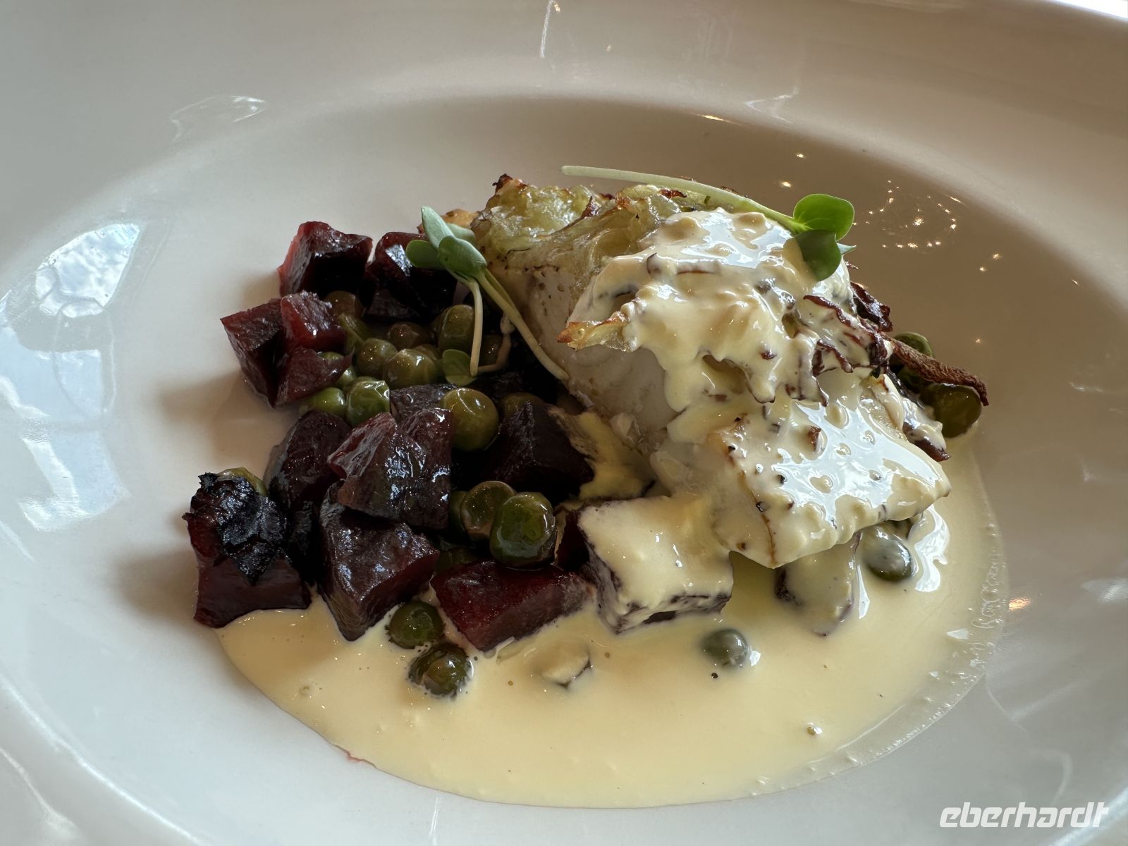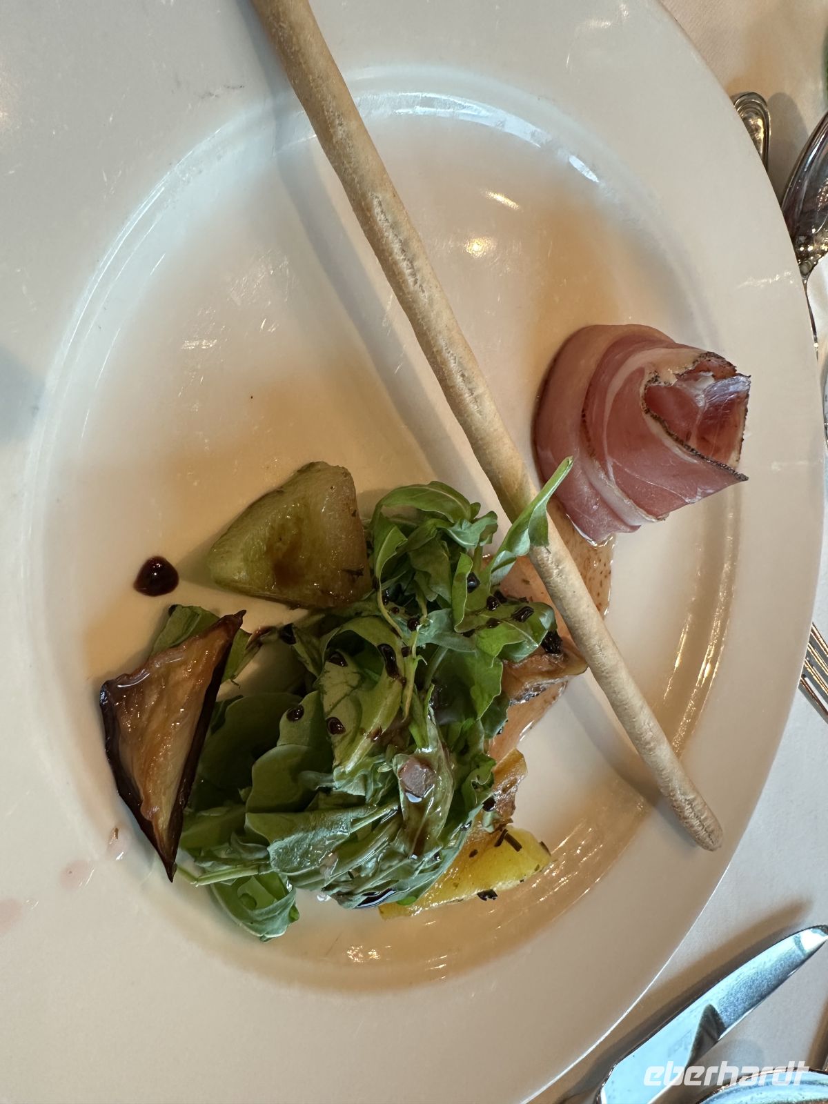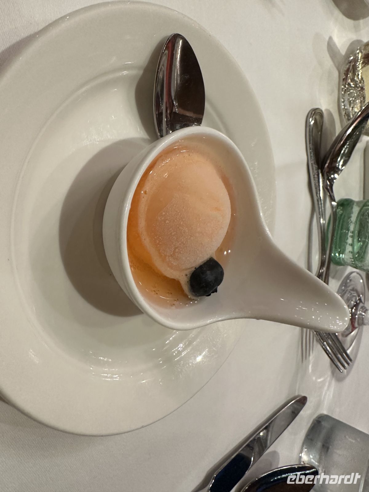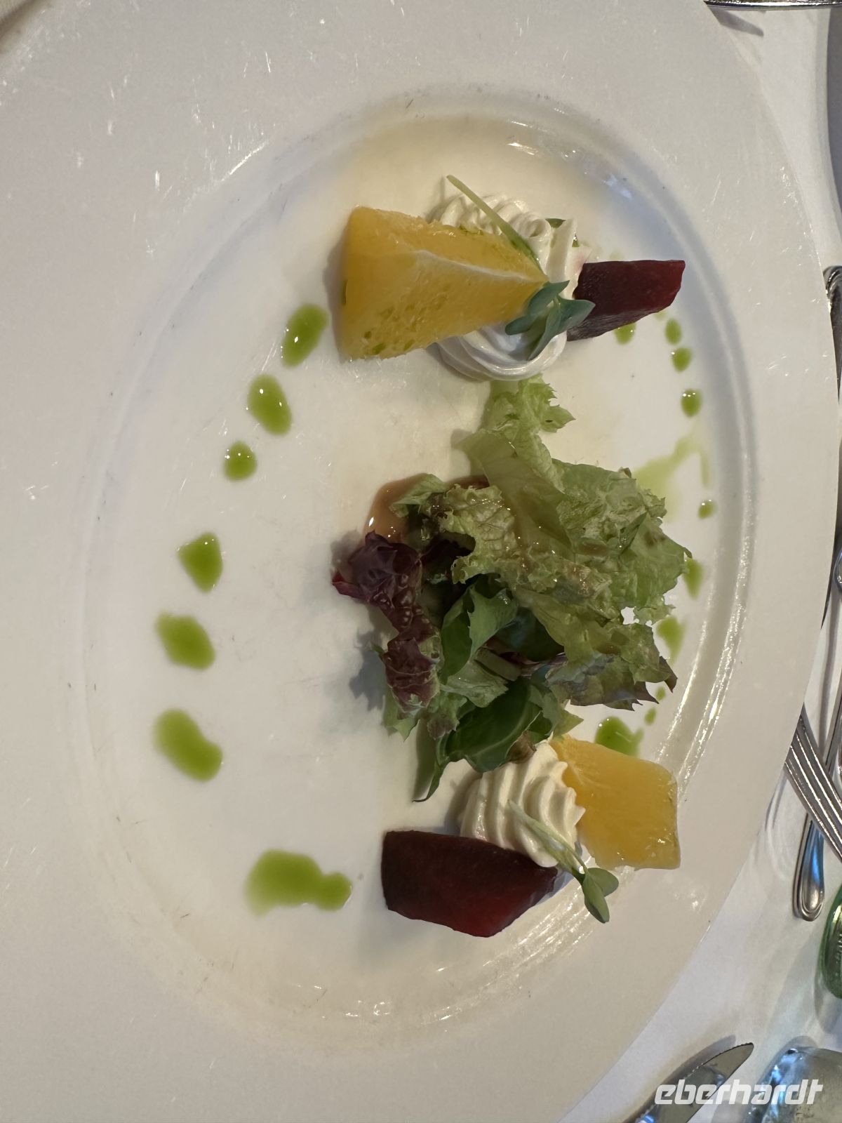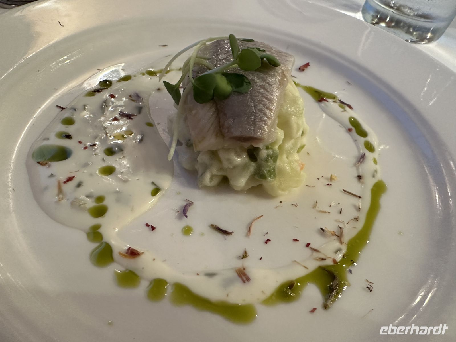 Alle weiteren Stunden des Tages sind wir auf dem Dortmund-Ems-Kanal unterwegs. Erst am späten Abend werden wir Dörpen erreichen, wo unser Schiff die Nacht über liegen wird. Uns erwartet eine interessante Mischung aus Naturerlebnissen und Einblicken in die industrielle Nutzung der Wasserstraße. Wir fahren durch das flache Emsland, dessen Landschaft sich je nach Abschnitt verändert. Zu Beginn der Fahrt ist die Umgebung stark von Industrie und Landwirtschaft geprägt. Die Kanalufer werden von Dämmen und Wegen gesäumt, die oft von Pappeln und Weiden bewachsen sind und als natürliche Korridore für Wildtiere dienen. Weiter nördlich, besonders in der Nähe von Meppen, ändert sich das Bild. Hier überquert der Kanal die Ems auf einer beeindruckenden Brücke und wir haben einen weiten Blick über die typische Auenlandschaft mit Feuchtgebieten, Wiesen und Schilfgürteln. Diese Feuchtgebiete sind ein wichtiger Lebensraum für Wasservögel wie Enten, Blesshühner und Reiher. Die Natur entlang des Kanals ist tatsächlich ein faszinierender Kontrast zur menschlichen Nutzung. Der Kanal selbst ist zwar ein künstlich angelegter Wasserweg, aber seine Ufer sind zu Biotopen geworden, die Anglern und Naturbeobachtern gleichermaßen Freude bereiten. Die Fahrt ist eine ruhige Erfahrung, bei der wir die langsamen Bewegungen der MS Thurgau Saxonia und die Geräusche der Natur genießen können. Unterbrochen wird dies durch leckeres Mittagessen, eine Überraschung am Nachmittag (Kaiserschmarrn als Show Cooking) und das Quiz. Orte und Städte, die wir entlang der Strecke streifen sind: Meppen, ein Ort der durch die große Kanalbrücke über die Ems bekannt ist; Haren, die sogenannte Schifferstadt mit einer starken maritimen Tradition, wo an diesem Wochenende die Prünetage stattfinden (übrigens nur alle drei Jahre); und Lathen: hier sind die Überreste der ehemaligen Transrapid-Teststrecke zu sehen, deren markante Pfeiler parallel zum Kanal verlaufen. Als Endpunkt ist Dörpen wieder stärker industriell geprägt. Hier gibt es einen Hafen mit Lagerhallen und Verladeanlagen, wo der Güterumschlag stattfindet. Bevor wir aber Dörpen erreichen, lädt der Kapitän zum Abschiedscocktail ein und wir genießen das Galadinner. Es beginnt mit einer Lachs-Spinat-Rolle als kalte Vorspeise, gefolgt von Steinpilzessenz und gebratener Dorade, einer warmen Vorspeise. Als Intermezzo wird ein Sorbet aus Orangeneis und Aperol gereicht. Der Hauptgang besteht aus einem Black Angus Rückenstück mit Sauce Béarnaise, Romanesco und Rosmarinpolenta. Zum Dessert besteht die Auswahl zwischen internationalen Käsespezialitäten, Mokka-Schokolade Mousse mit Rum-Rosinen-Brownie, Pfirsich Coulis und Drambuie Likör Rahm oder einer Fruchtplatte.