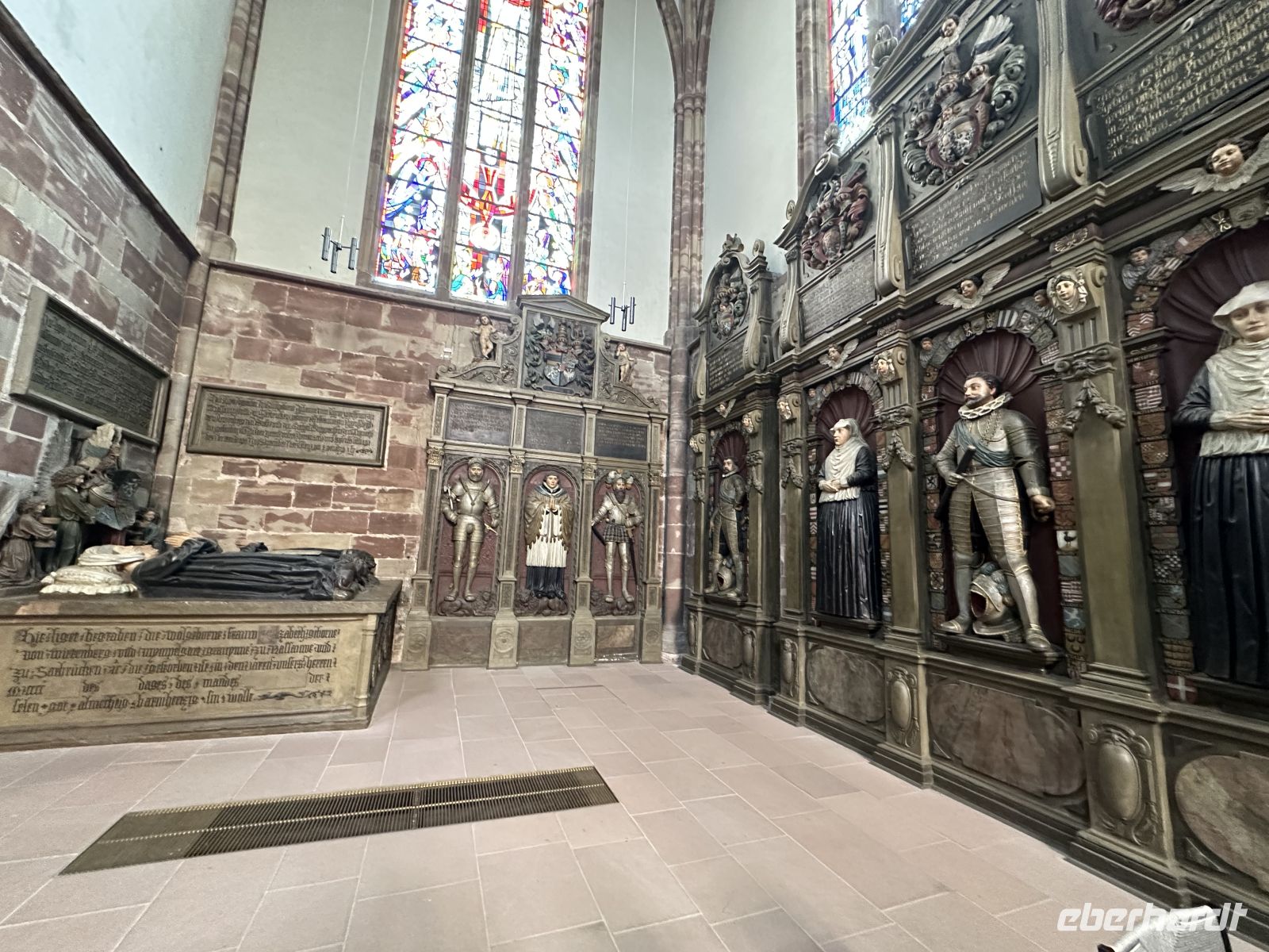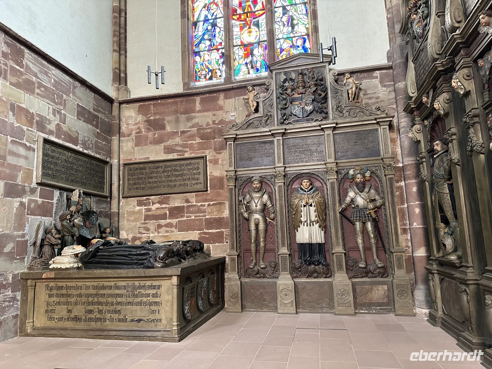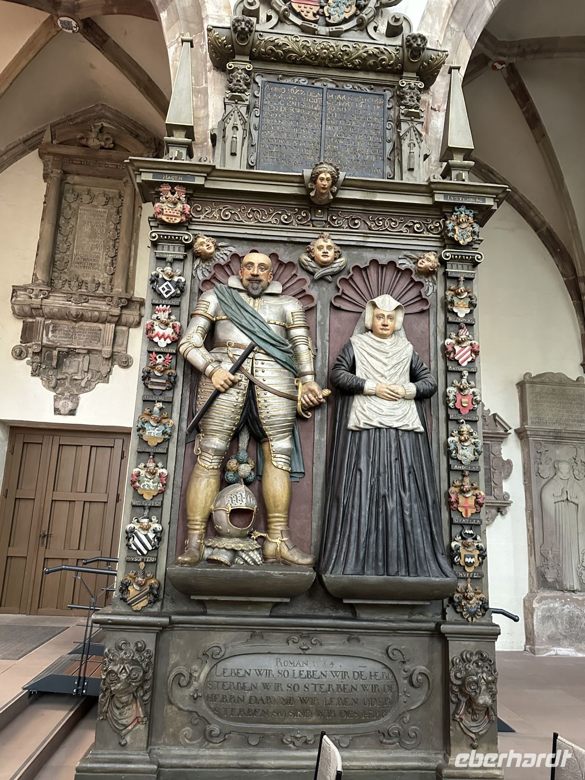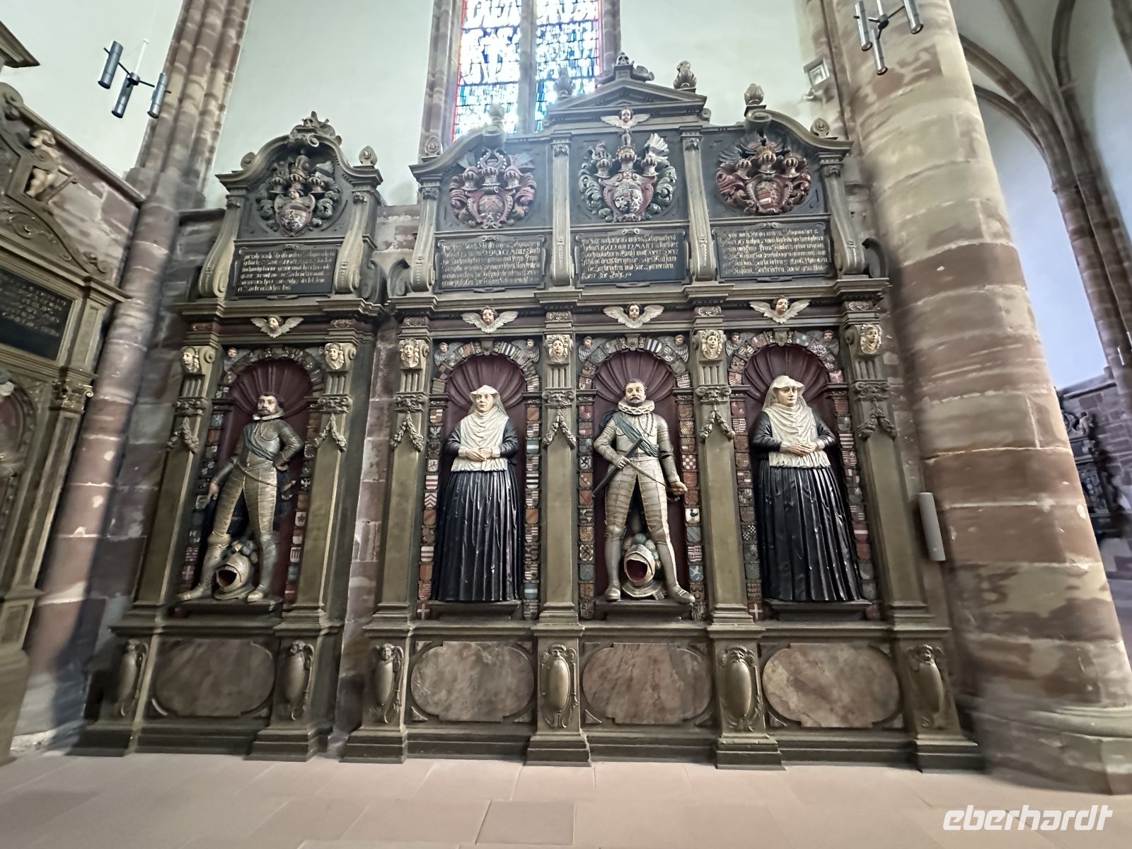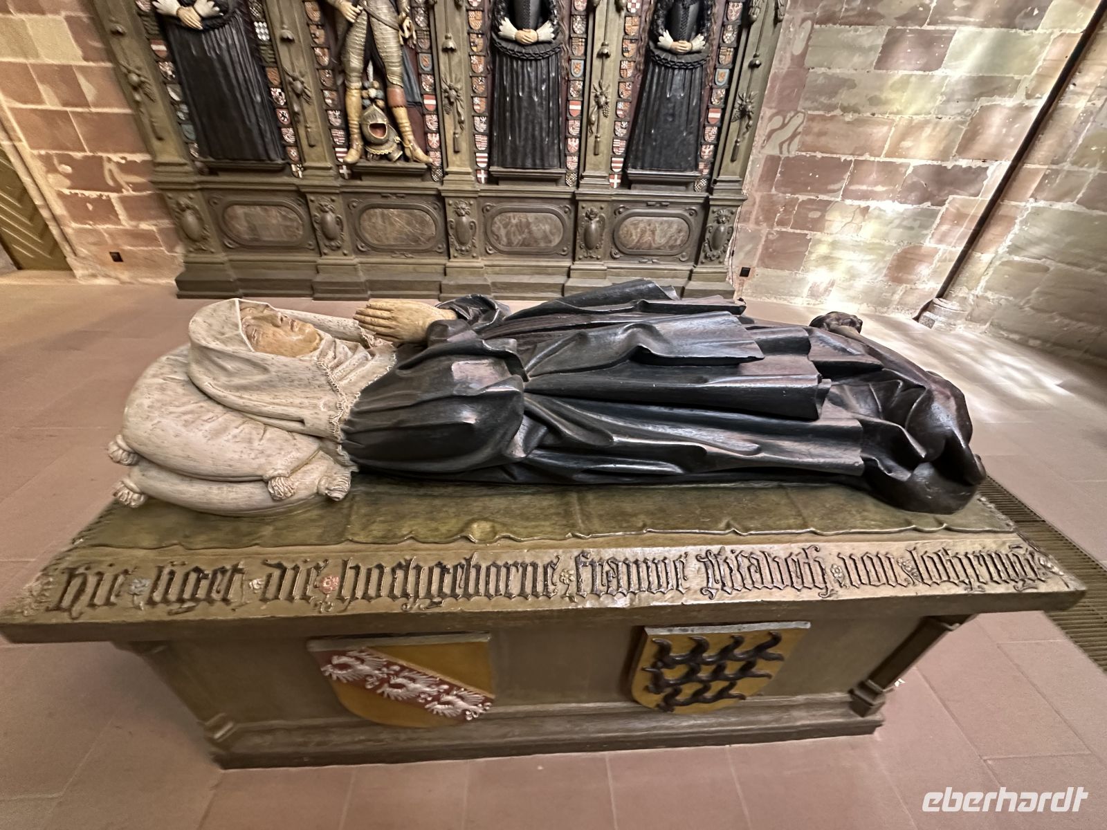 Das älteste und künstlerisch bedeutsamste Grabmal in der Stiftskirche ist die Tumba für Elisabeth von Lothringen († 1456), die Großmutter des Grafen Philipp III. Elisabeth von Lothringen gilt als eine der ersten namentlich bekannten Literaturübersetzerinnen. Sie übersetzte französische Heldenepen in deutsche Prosa und schuf damit die Grundlage für den Prosaroman in Deutschland. Ihre Tumba (Freistehendes, oft erhöhtes Grabmal, das die Form eines Sarkophags hat) zeigt sie in einem feinen, spätgotischen Gewand mit einem Hund zu ihren Füßen, der als Symbol für Treue steht. Das Kunstwerk zeugt vom kulturellen Einfluss ihrer Familie. Ihre Rolle als Autorin und Förderin der Kunst zeigt, wie hochgebildete Frauen im Mittelalter ihre Position nutzten, um die Kultur ihrer Zeit zu prägen.