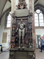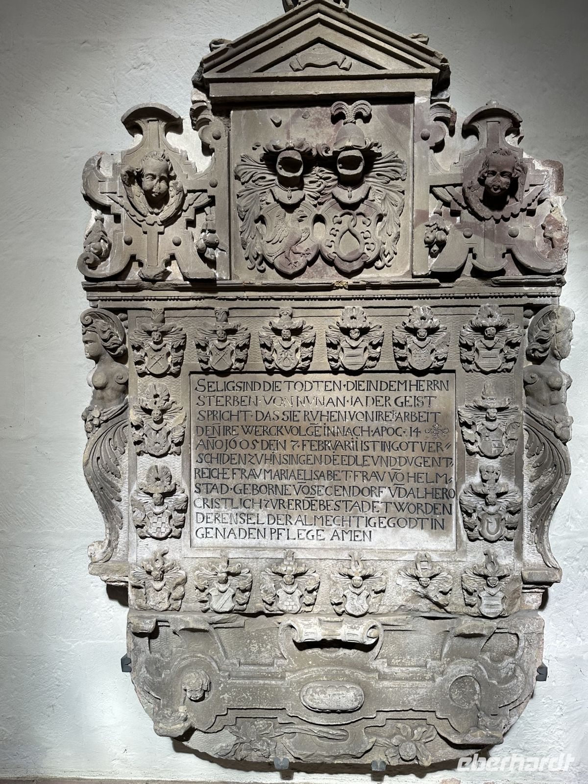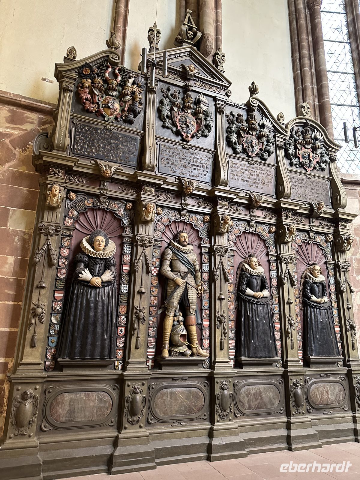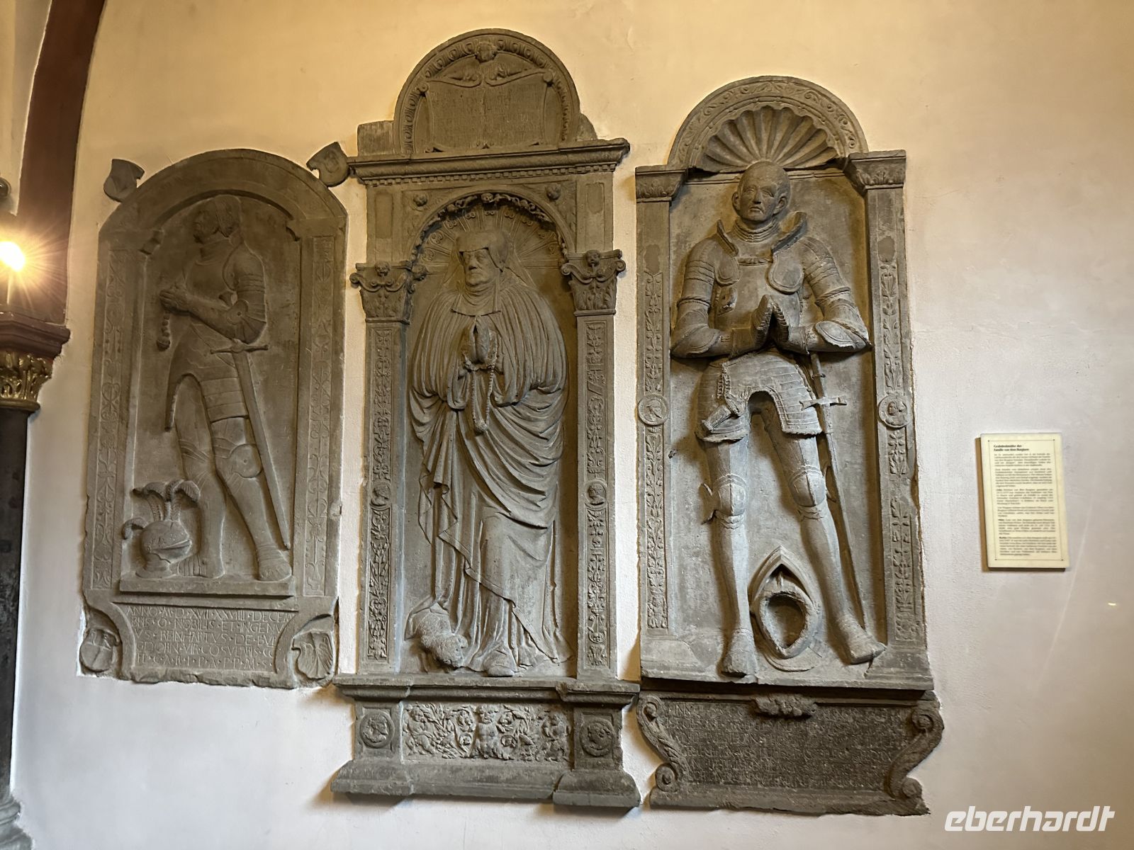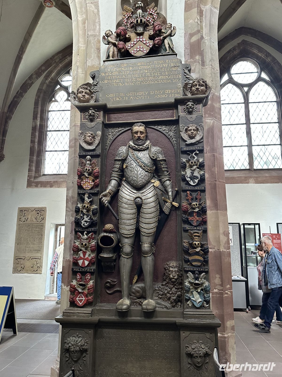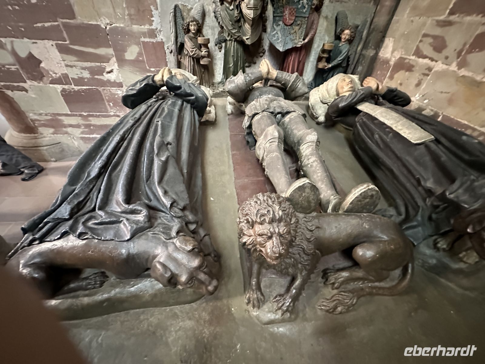 Das älteste und künstlerisch bedeutsamste Grabmal in der Stiftskirche ist die Tumba für Elisabeth von Lothringen († 1456), die Großmutter des Grafen Philipp III. Elisabeth von Lothringen gilt als eine der ersten namentlich bekannten Literaturübersetzerinnen. Sie übersetzte französische Heldenepen in deutsche Prosa und schuf damit die Grundlage für den Prosaroman in Deutschland. Ihre Tumba (Freistehendes, oft erhöhtes Grabmal, das die Form eines Sarkophags hat) zeigt sie in einem feinen, spätgotischen Gewand mit einem Hund zu ihren Füßen, der als Symbol für Treue steht. Das Kunstwerk zeugt vom kulturellen Einfluss ihrer Familie. Ihre Rolle als Autorin und Förderin der Kunst zeigt, wie hochgebildete Frauen im Mittelalter ihre Position nutzten, um die Kultur ihrer Zeit zu prägen.
