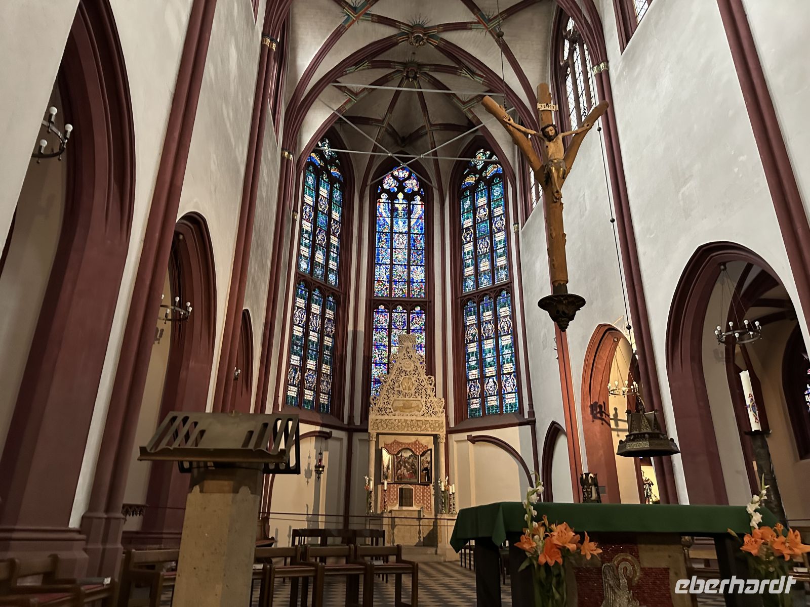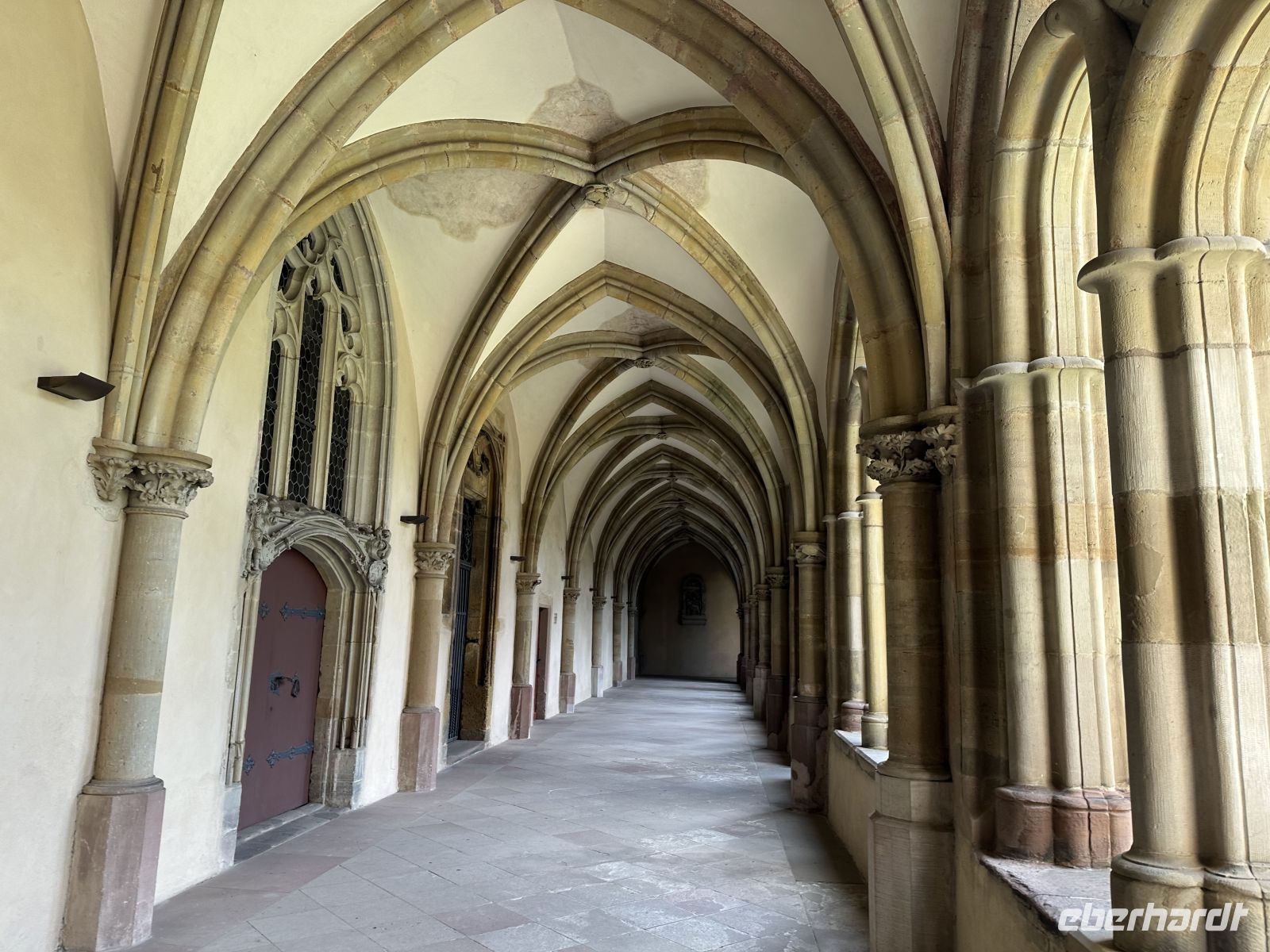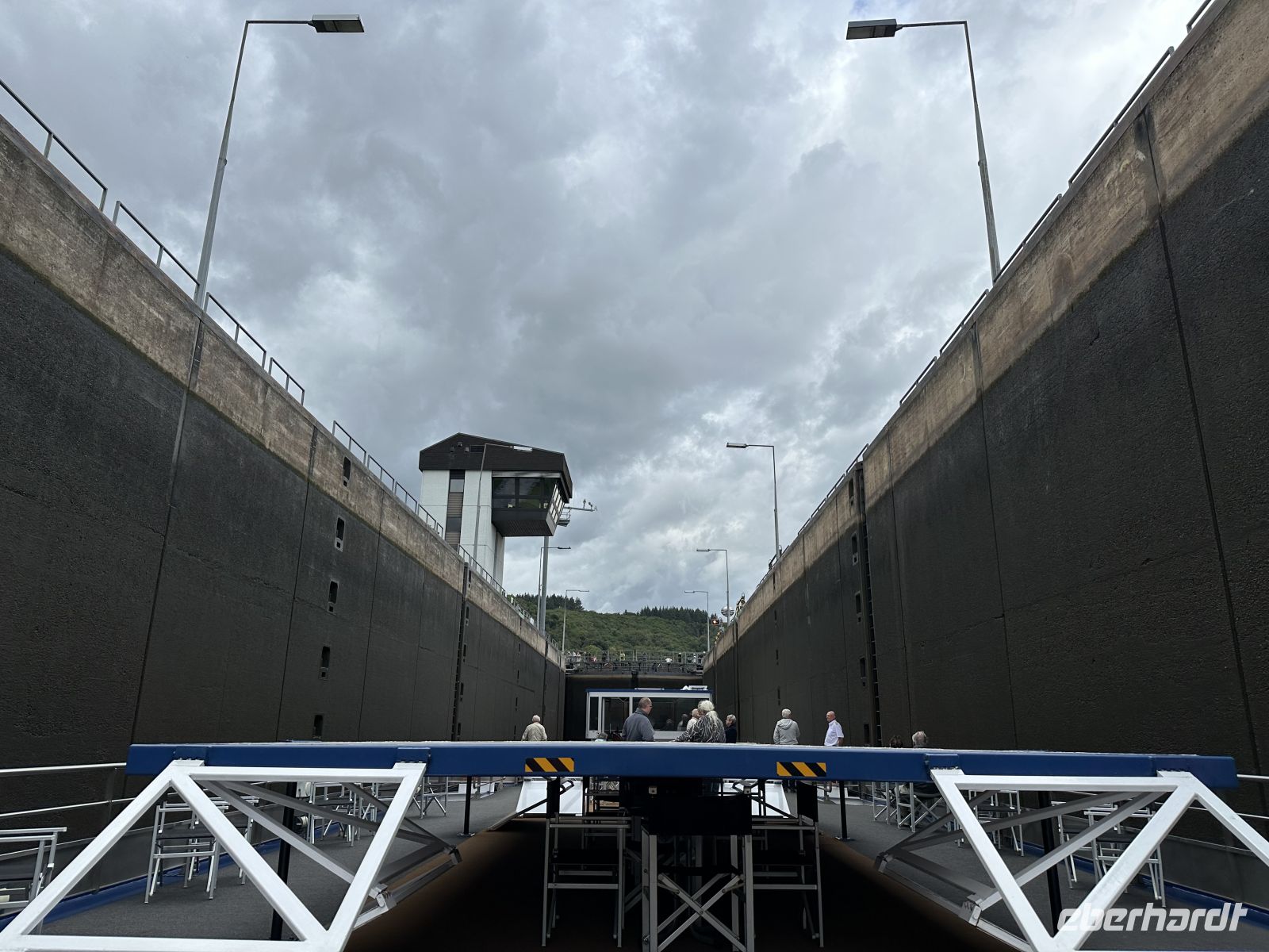 Nach einem üppigen Frühstück machen wir uns auf den Weg zum Baumwipfelpfad. Mit dem Reisebus und einer freundlichen örtlichen Reiseleiterin fahren wir durch die regennasse Landschaft des Saarlandes. Wir erreichen das Cloef-Atrium (das Besucherzentrum) am Eingang des Baumwipfelpfads Saarschleife. Der Weg ist gut ausgebaut und führt leicht ansteigend über Holzstege, die sich durch die Baumkronen schlängeln. Leider regnet es wie verrückt und so hält sich der Genuss in Grenzen. Dennoch haben wir am Ende des Baumwipfelpfads eine tolle Aussicht auf die Saarschleife. Viele Gäste trotzen dem Wetter und erklimmen mutig den Aussichtsturm. Von dort oben ist der Blick noch einen Tick besser. Und, wie sollte es anders sein, kaum sind wir zurück am Bus hört es auf zu regnen. Auf dem Rückweg zum Schiff besuchen wir (als zusätzliches Schmankerl) die Kapelle St. Joseph. Die Kapelle St. Joseph in Mettlach hat eine besonders bewegte Geschichte. Sie wurde ursprünglich 1864 in Wallerfangen als private Kapelle errichtet, inspiriert von der berühmten Sainte-Chapelle in Paris. Später wurde sie von der Familie Villeroy vererbt und 1878/1879 von Eugen von Boch und seiner Frau Octavie abgetragen, um sie in Mettlach wieder aufzubauen. Das Ungewöhnliche daran ist, dass die Bauteile der Kapelle per Schiff über die Saar transportiert wurden. An ihrem heutigen Standort wurde sie über einer Familiengruft der von Bochs wiedererrichtet. Im Inneren beeindrucken farbenprächtige Keramikfliesen und Mosaike aus der Produktion von Villeroy & Boch.
